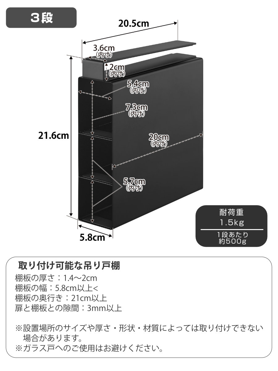 | 対応サイズ | 取り付け可能な吊り戸棚 棚板の厚さ:1.4~2cm 棚板の幅:5.8cm以上< 棚板の奥行き:21cm以上 扉と棚板との隙間:3mm以上 |