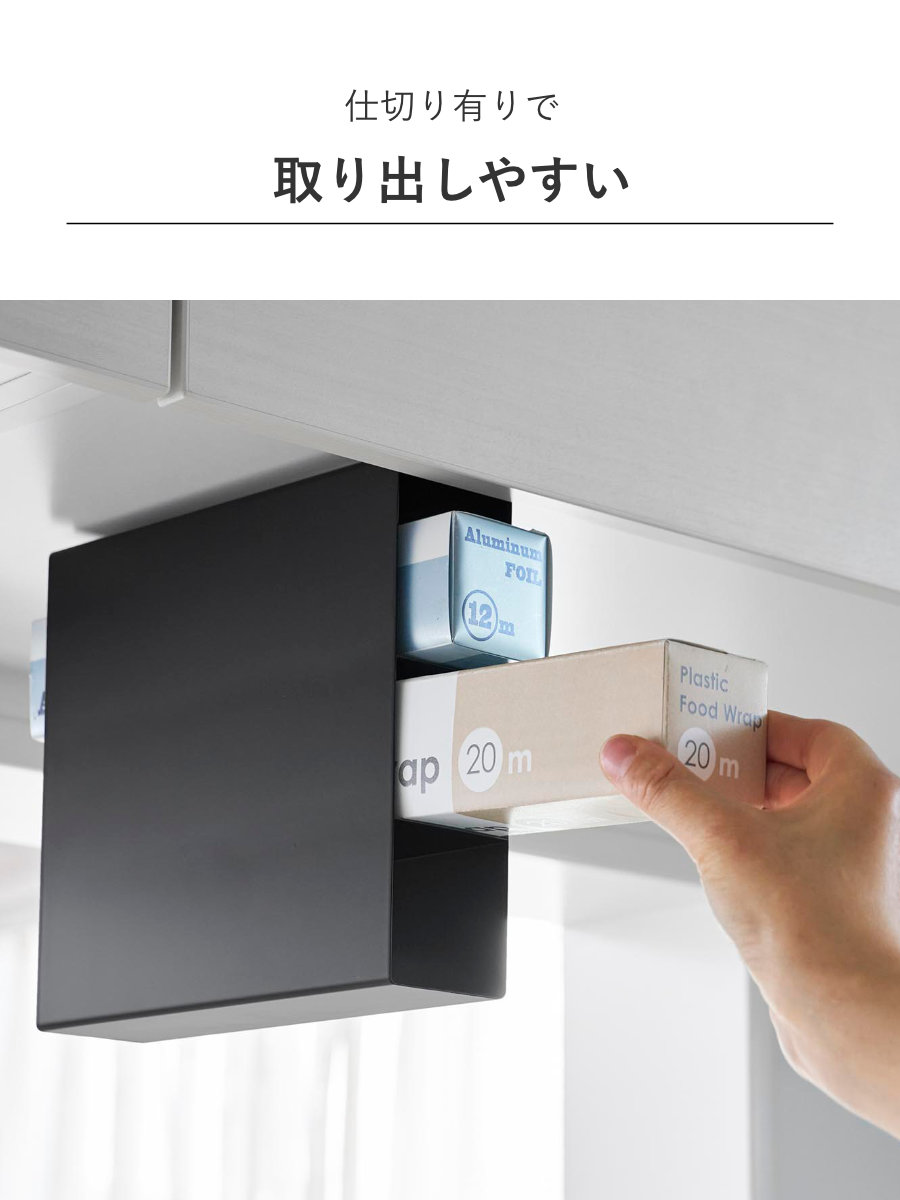 各段に仕切りが付いているので、ラップやアルミホイルを取り出す際も滑り落ちず、安定して使えます。手元でスムーズに取り出せるので、日々のキッチン作業も快適です。