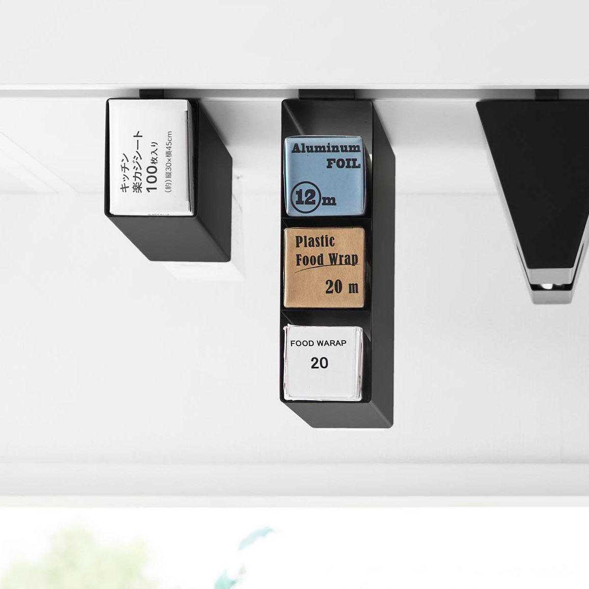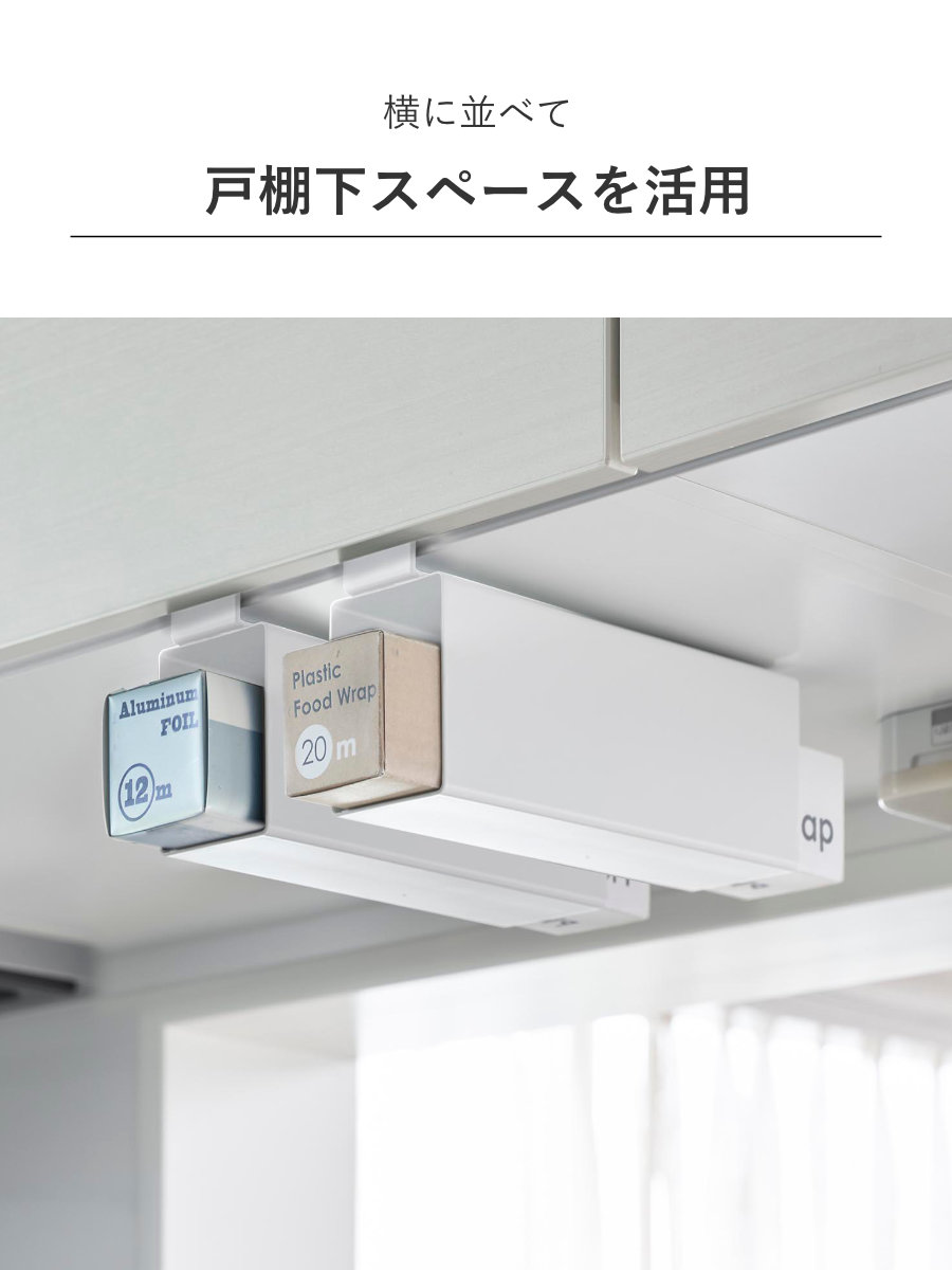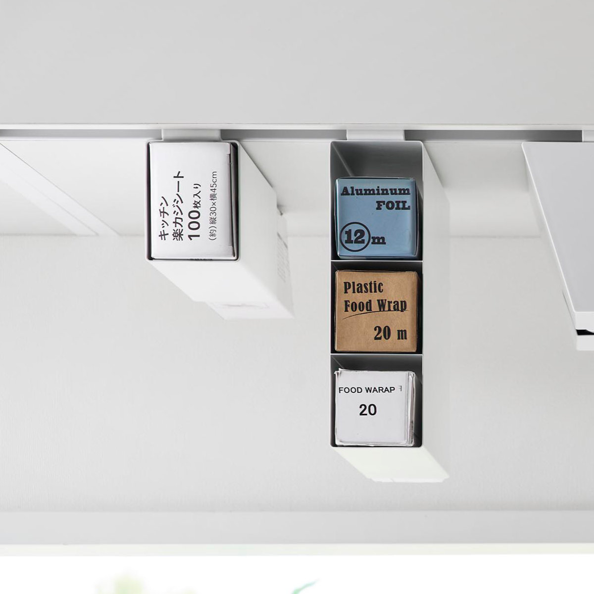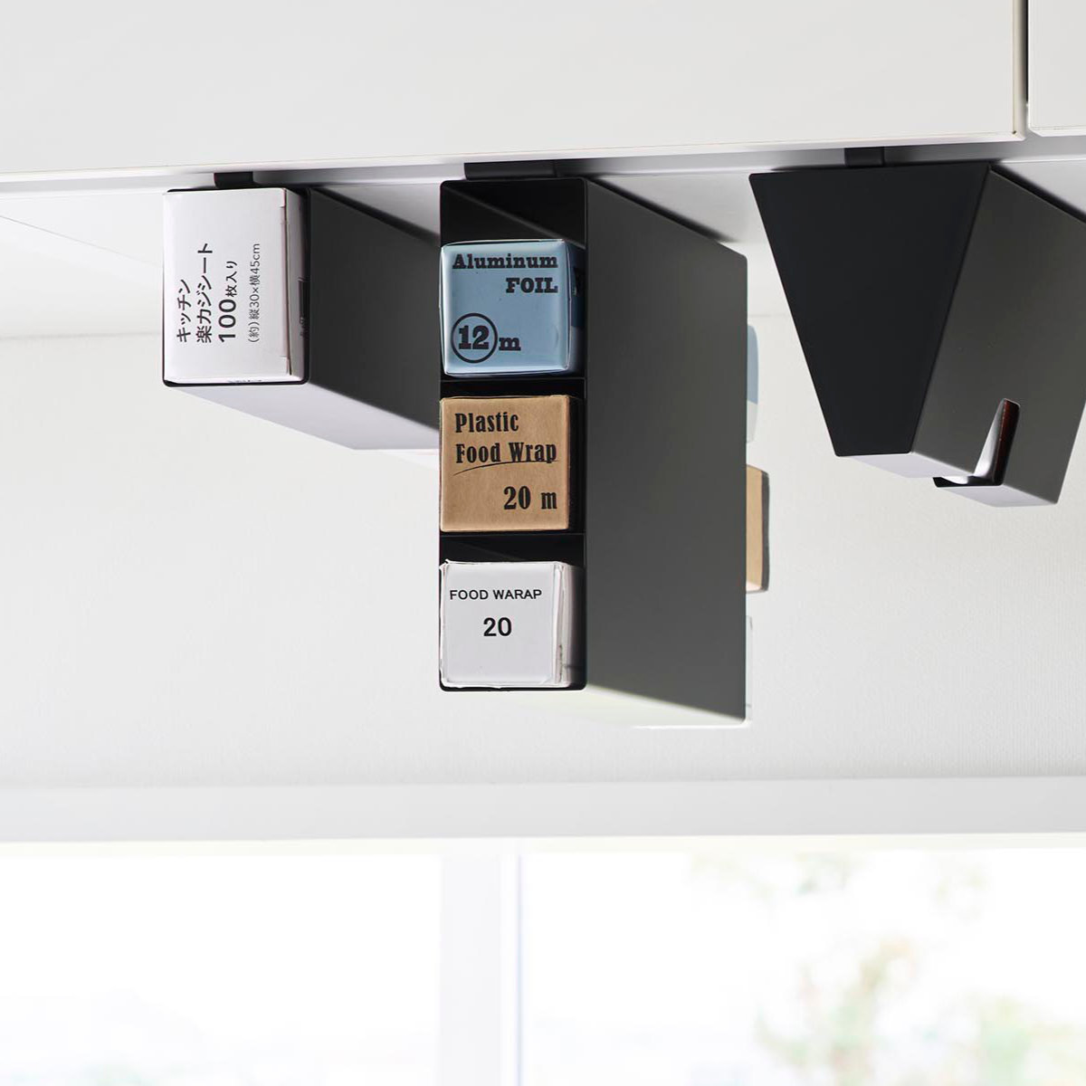 横に並べて設置すれば、ラップやアルミホイルを種類ごとに分けてまとめて収納でき、さらに使いやすくなります。戸棚下のスペースを無駄なく活用でき、見た目もすっきり整います。