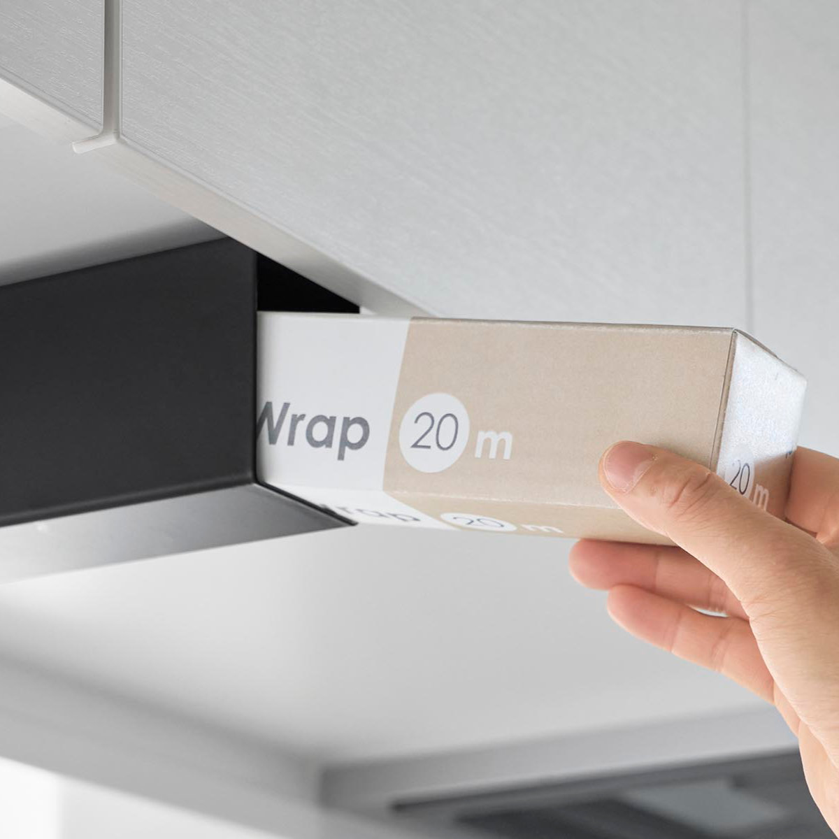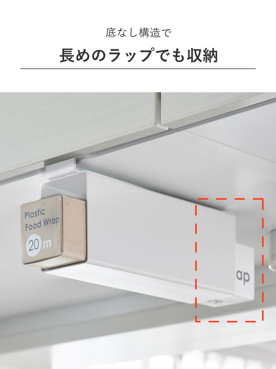 底がない設計で、長めのラップもすっきりセット可能です。ラップやアルミホイルの長さがバラバラでもまとめて収納でき、見た目も整います。