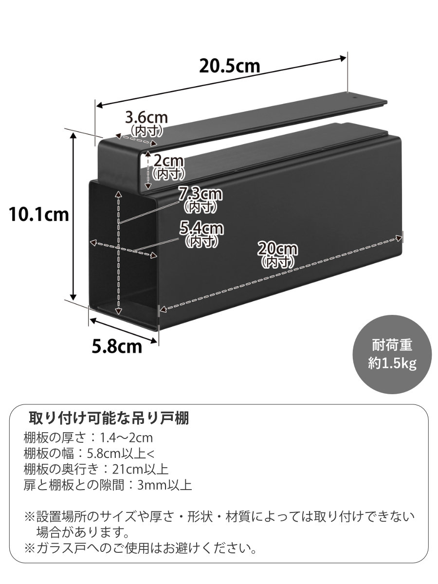 | 対応サイズ | 取り付け可能な吊り戸棚 棚板の厚さ:1.4~2cm 棚板の幅:5.8cm以上< 棚板の奥行き:21cm以上 扉と棚板との隙間:3mm以上 |