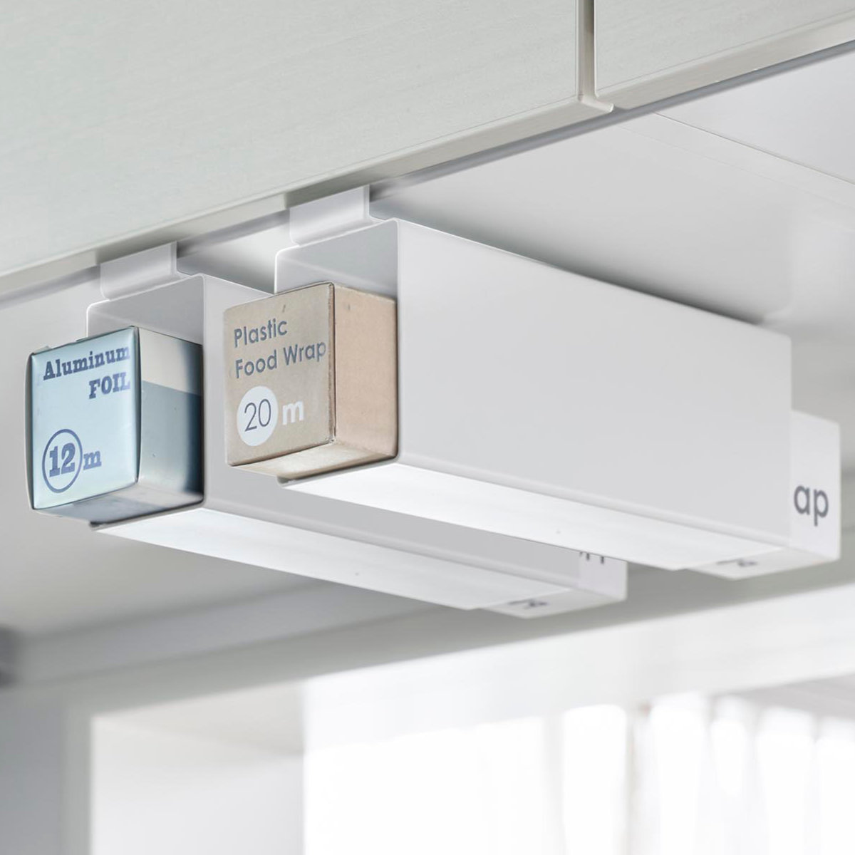 置き場所に困るラップやアルミホイルなどを浮かせて収納でき、戸棚下のスペースを有効活用できます。