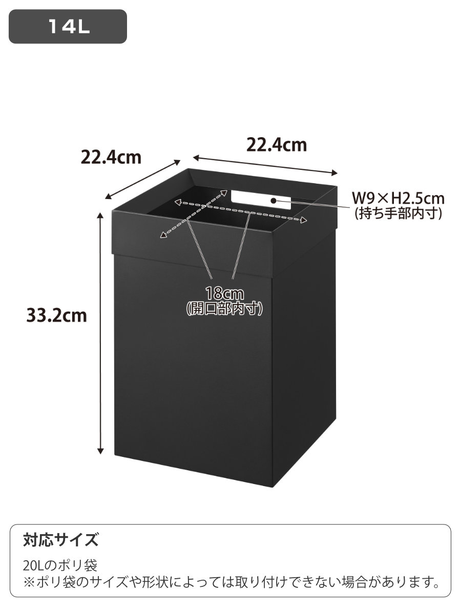 | 対応サイズ | 20Lのポリ袋 ※ポリ袋のサイズや形状によっては取り付けできない場合があります。 |