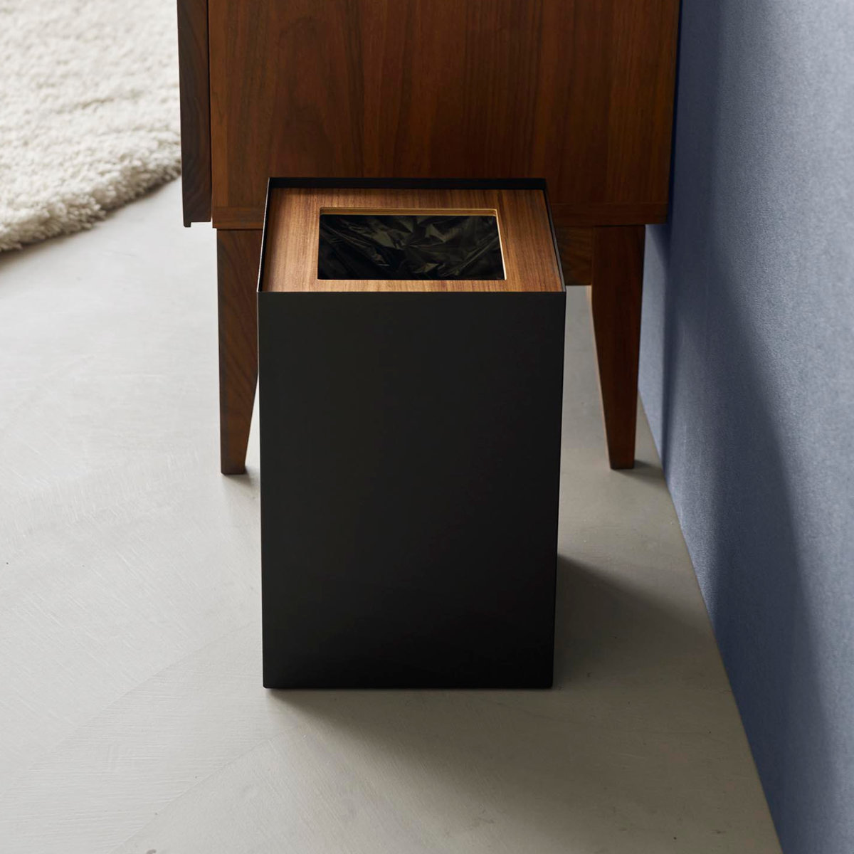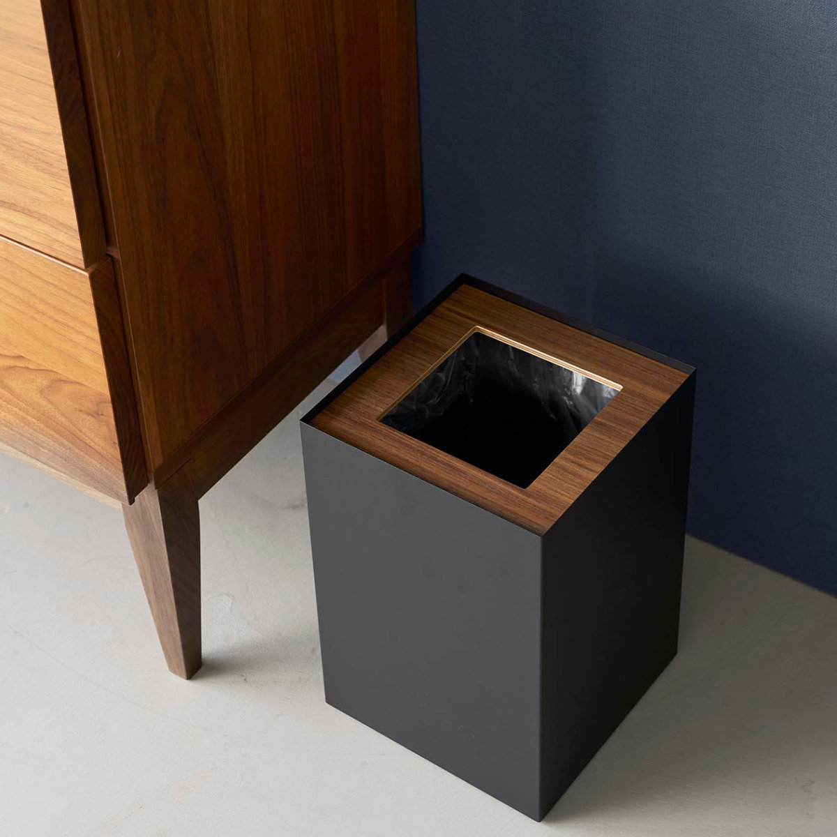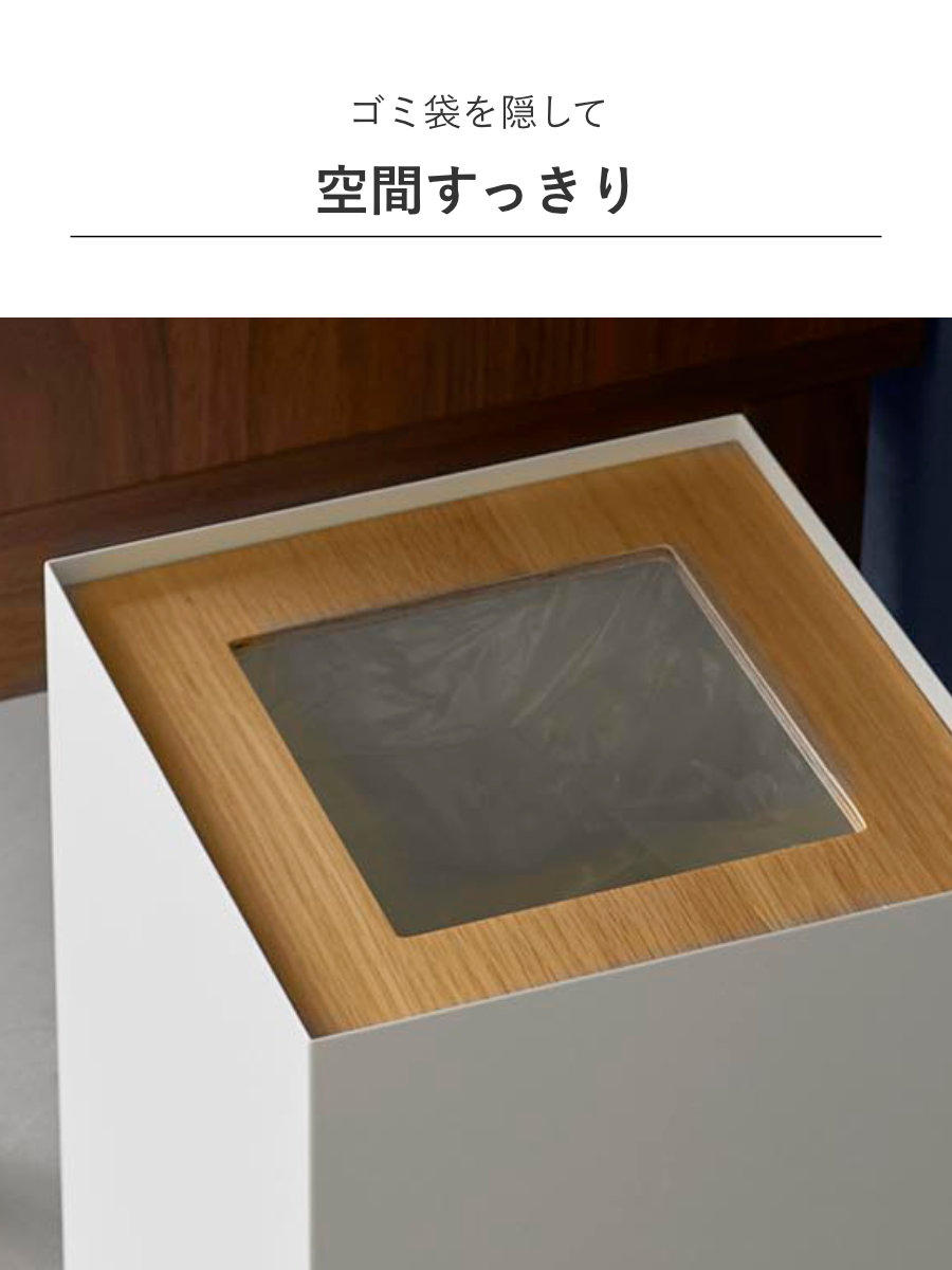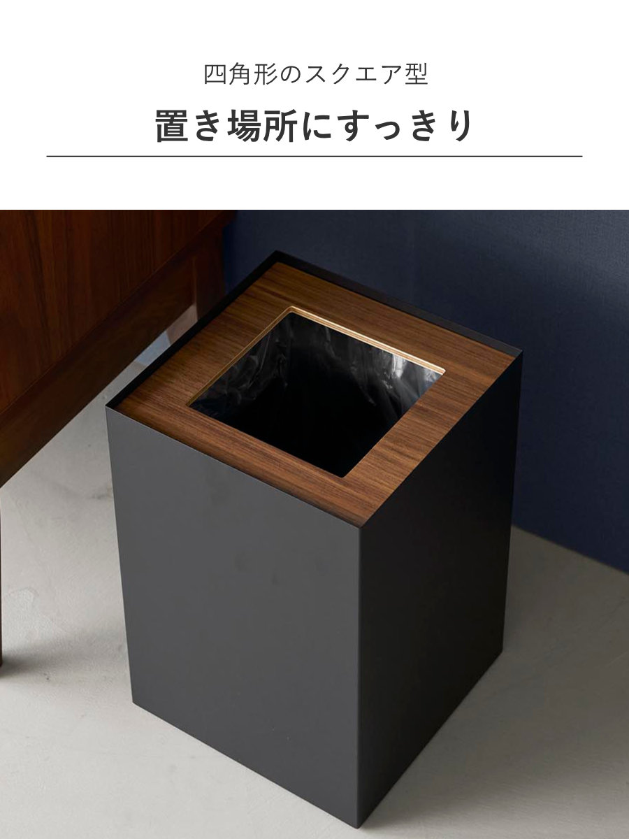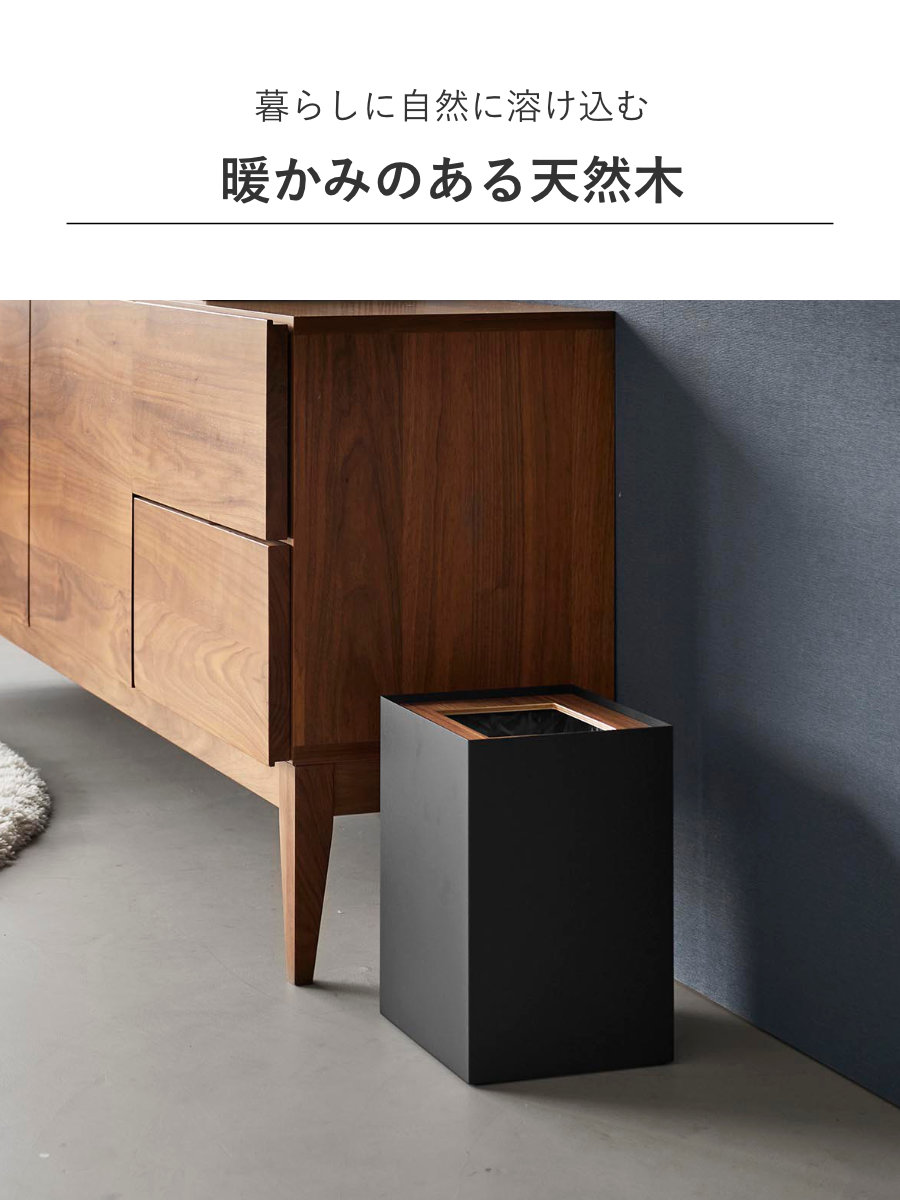 暖かみのある天然木とスタイリッシュなスチールを組み合わせた、美しいスクエア型トラッシュカンです。シンプルながら存在感のあるデザインで、リビングや書斎、寝室などさまざまな空間に馴染みます。