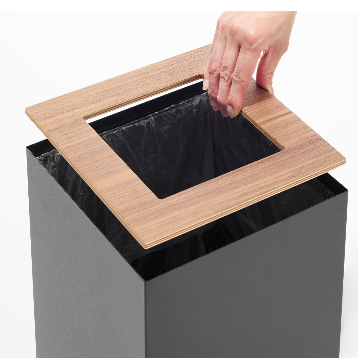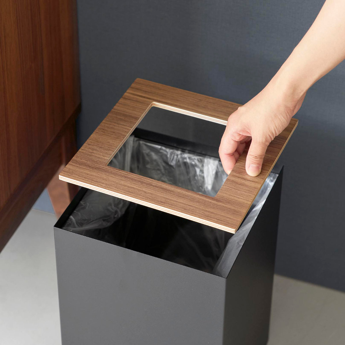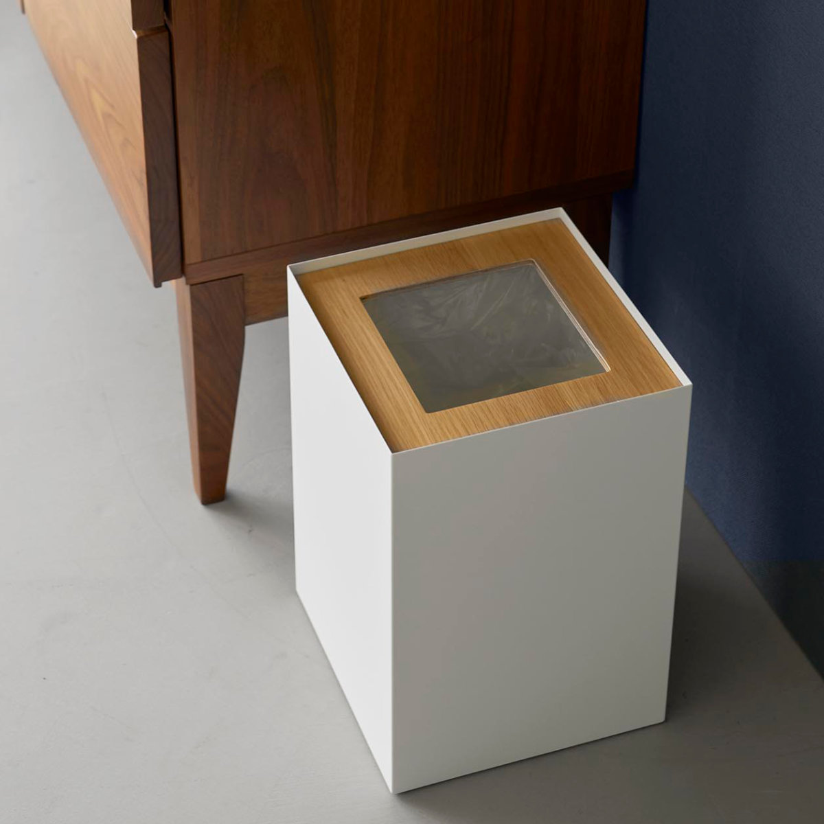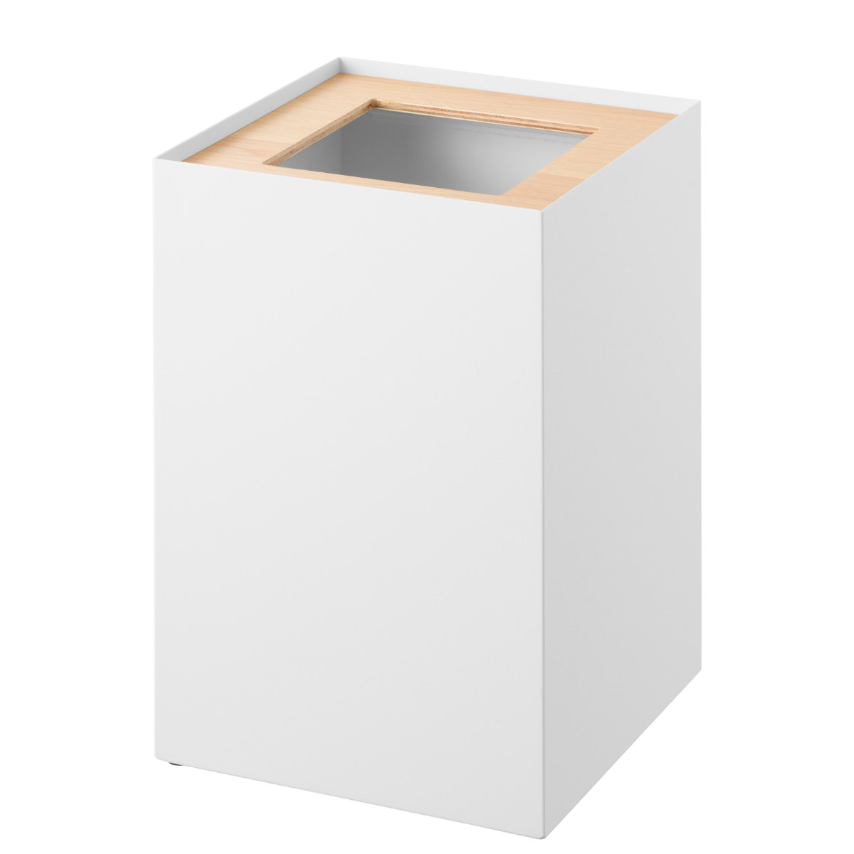 暖かみのある天然木とスタイリッシュなスチールを組み合わせた、美しいスクエア型トラッシュカンです。シンプルながら存在感のあるデザインで、リビングや書斎、寝室などさまざまな空間に馴染みます。