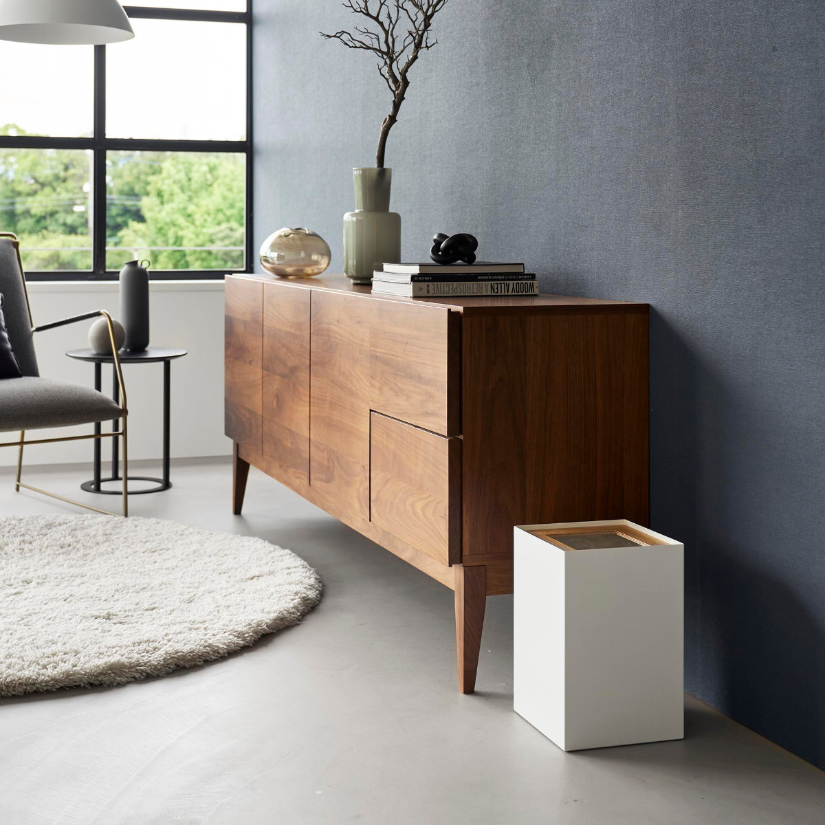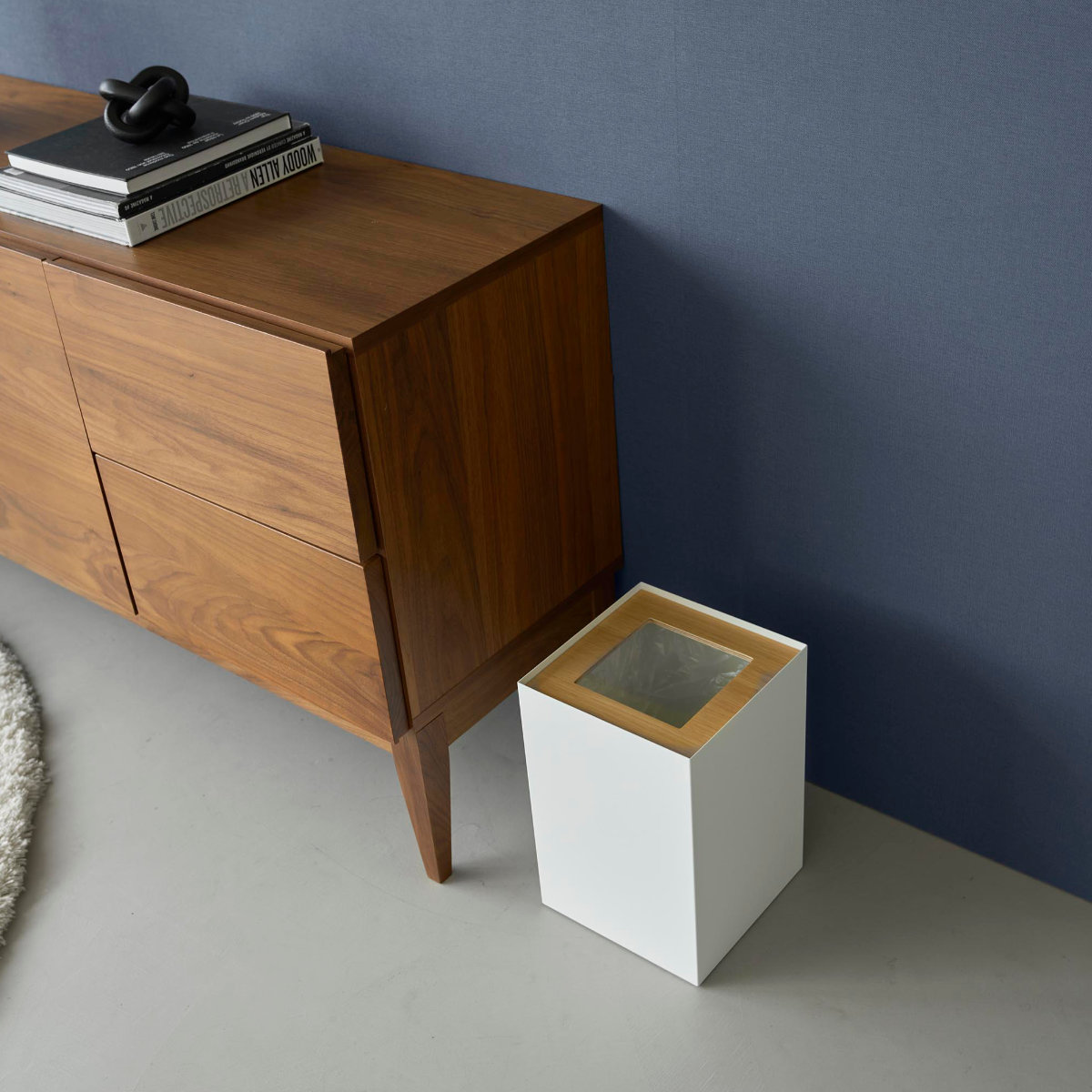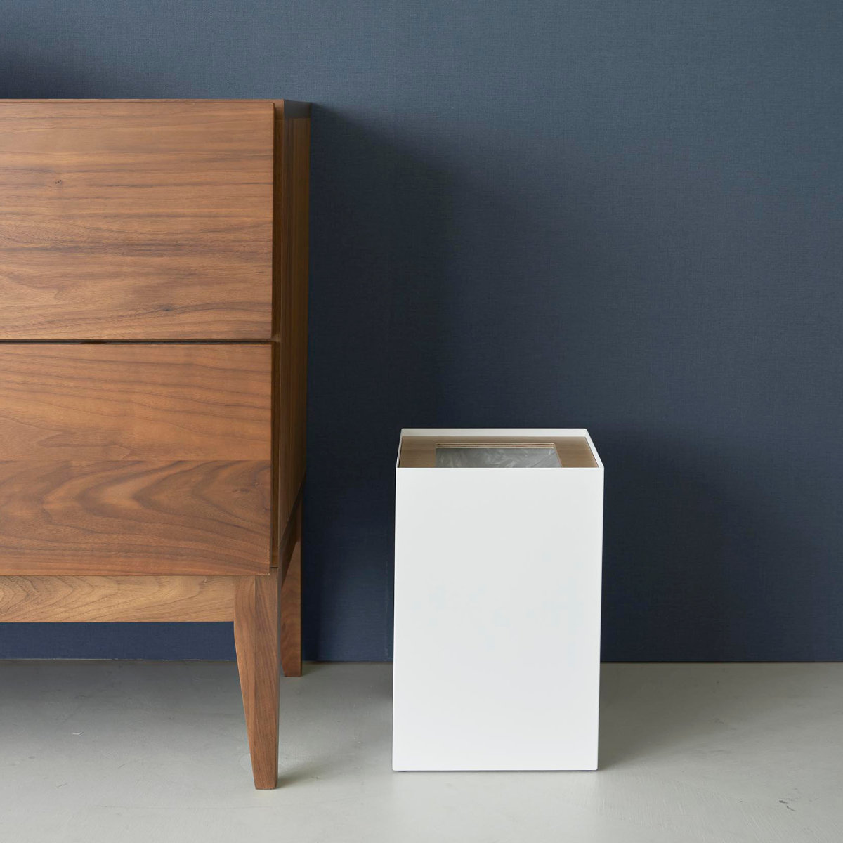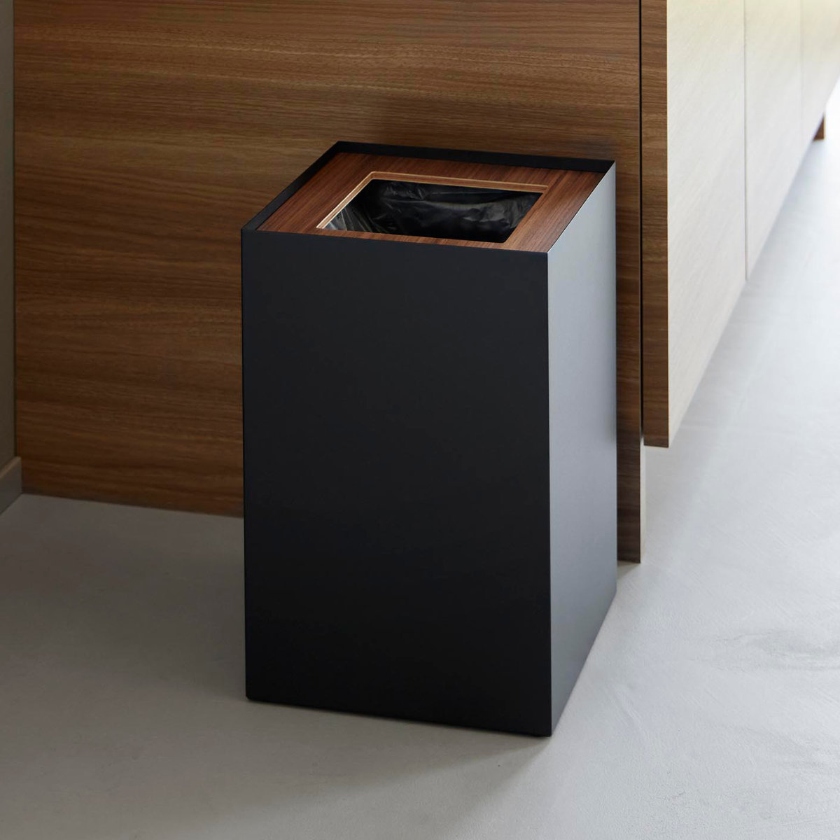 暖かみのある天然木とスタイリッシュなスチールを組み合わせた、美しいスクエア型トラッシュカンです。シンプルながら存在感のあるデザインで、リビングや書斎、寝室などさまざまな空間に馴染みます。