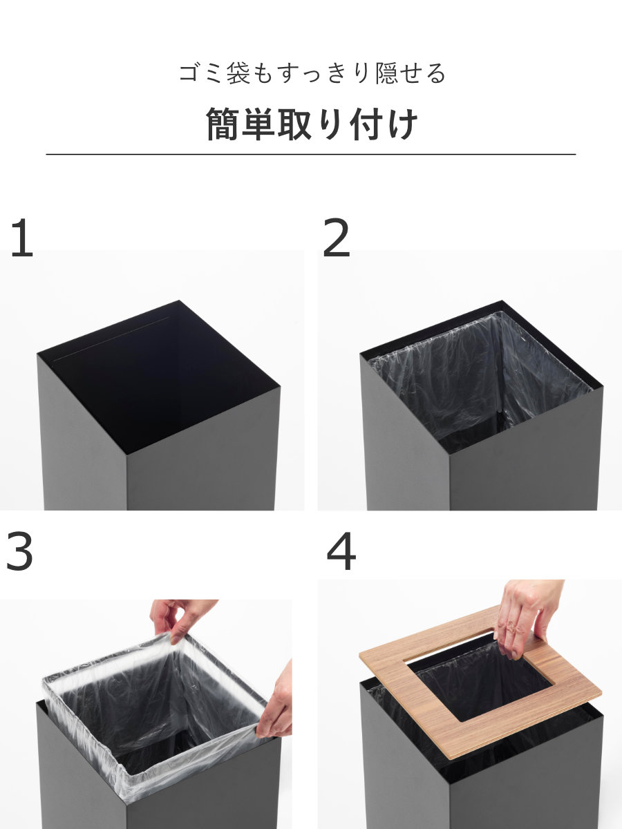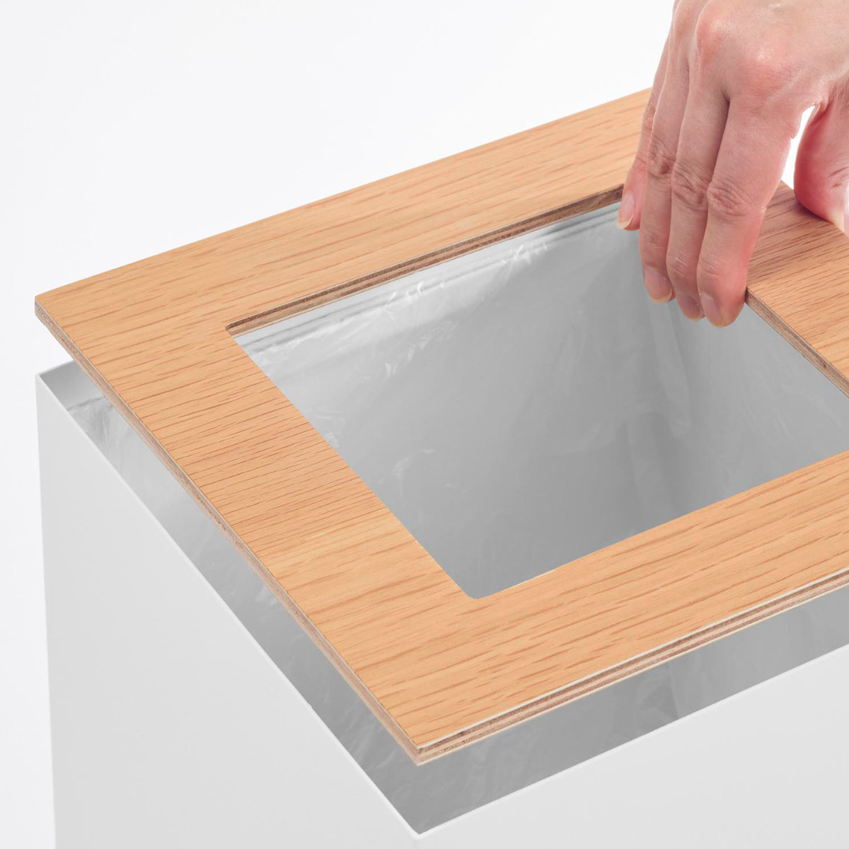 天然木のフタと内側のストッパーリングは簡単に取り外せます。ストッパーリングにポリ袋を通し、袋の口を外側に折り返すだけで、手間なくスムーズに設置できます。