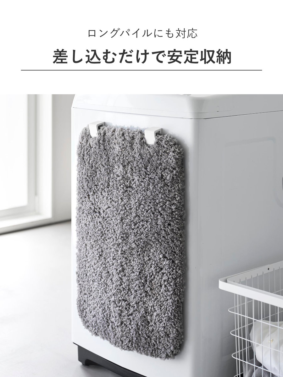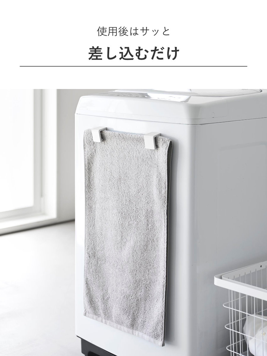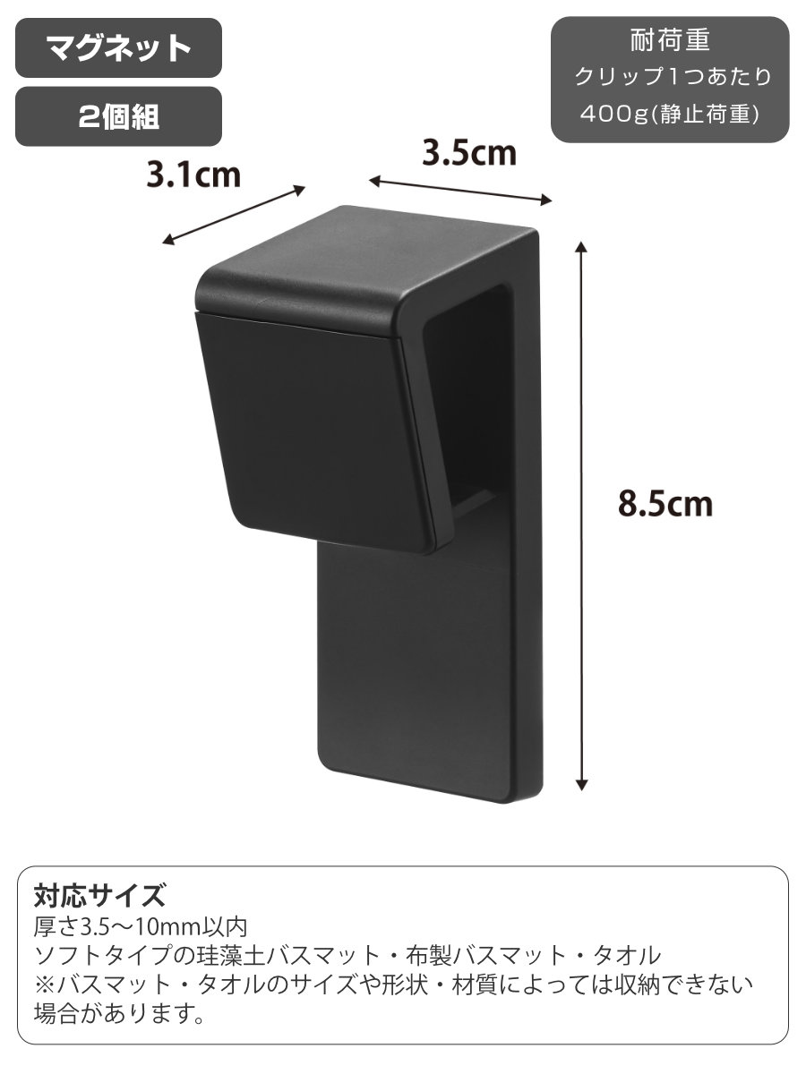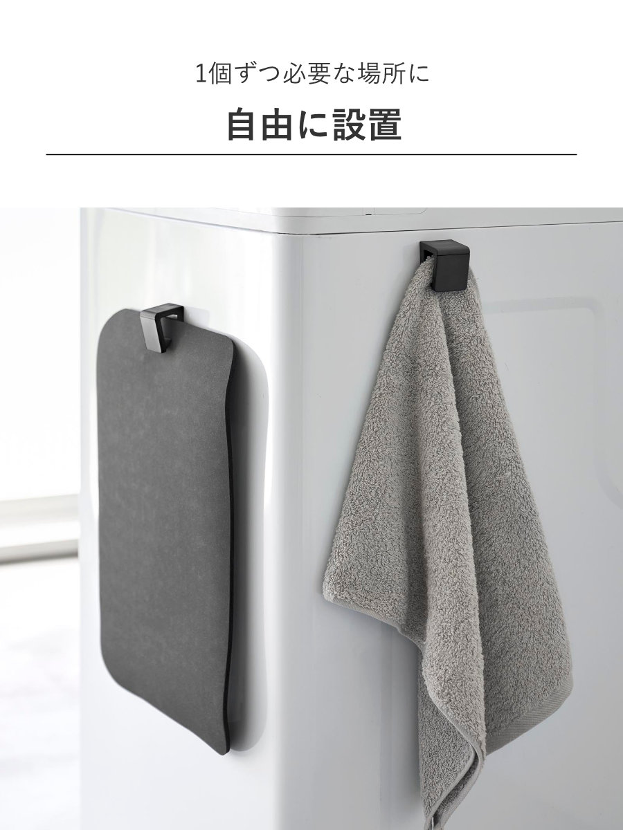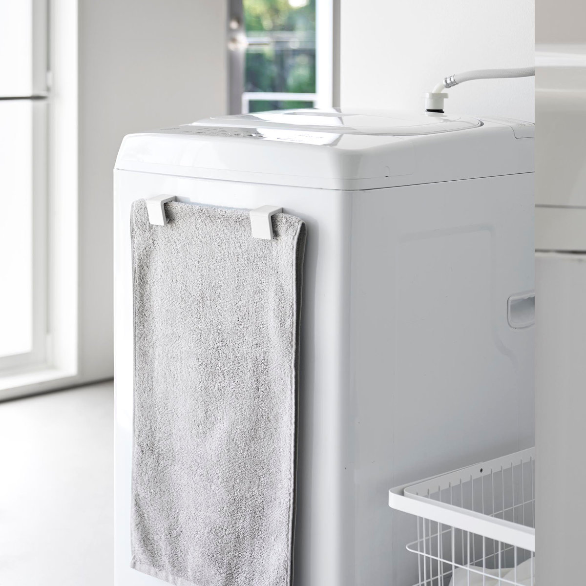 バスマットやバスタオルの収納はもちろん、キッチンではクロスや布巾、タオル掛けとしても活躍します。マグネット式なので冷蔵庫や洗濯機、浴室の壁面などに簡単に取り付けられ、使いたい場所にすぐ設置できるのもポイント。
