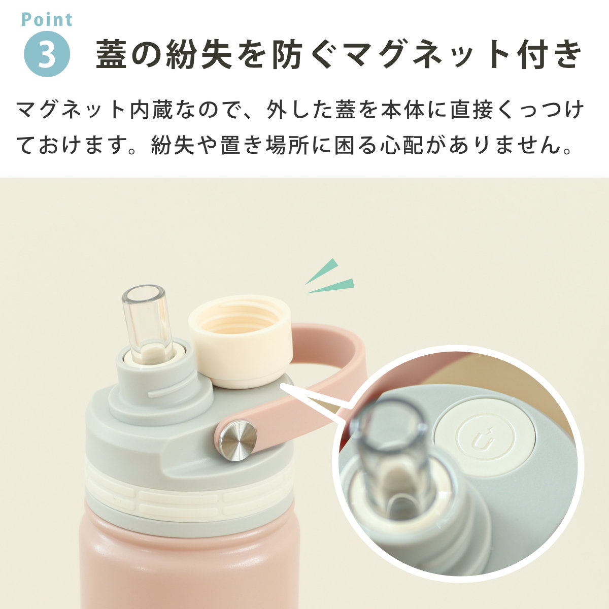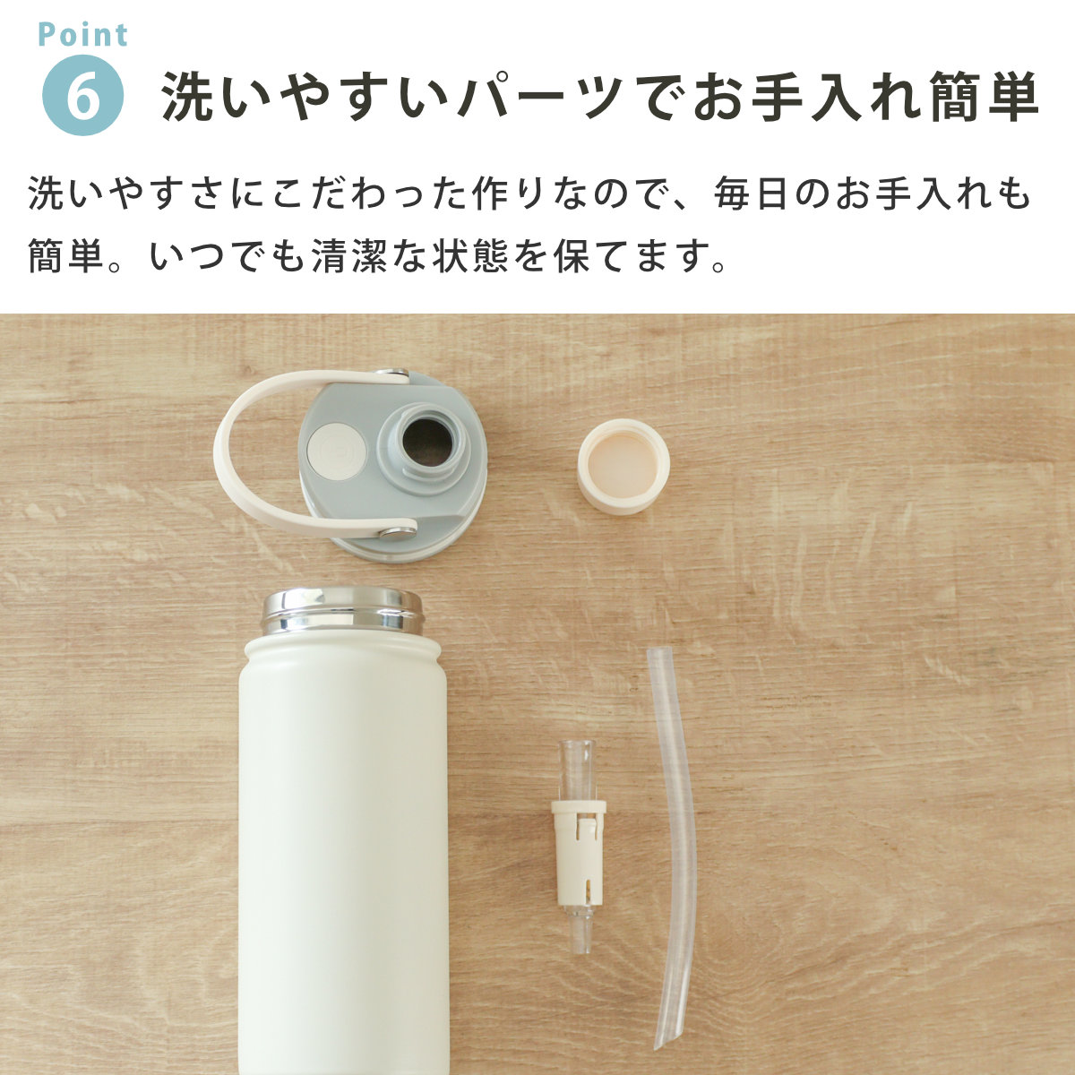 | 材質 | 本体:ステンレス鋼 蓋栓:ポリプロピレン、磁石 パッキン:シリコーンゴム 飲み口:ポリカーボネイト 飲み口止め:ポリプロピレン ストロー:シリコーンゴム ハンドル:TPUゴム、ステンレス鋼 バネ:ステンレス鋼 |