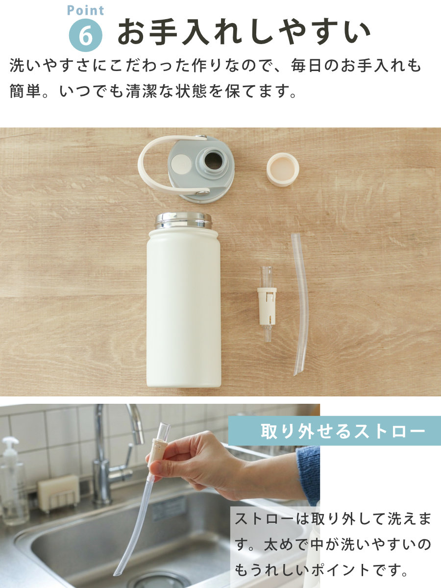 | 材質 | 本体:ステンレス鋼 蓋栓:ポリプロピレン、磁石 パッキン:シリコーンゴム 飲み口:ポリカーボネイト 飲み口止め:ポリプロピレン ストロー:シリコーンゴム ハンドル:TPUゴム、ステンレス鋼 バネ:ステンレス鋼 |