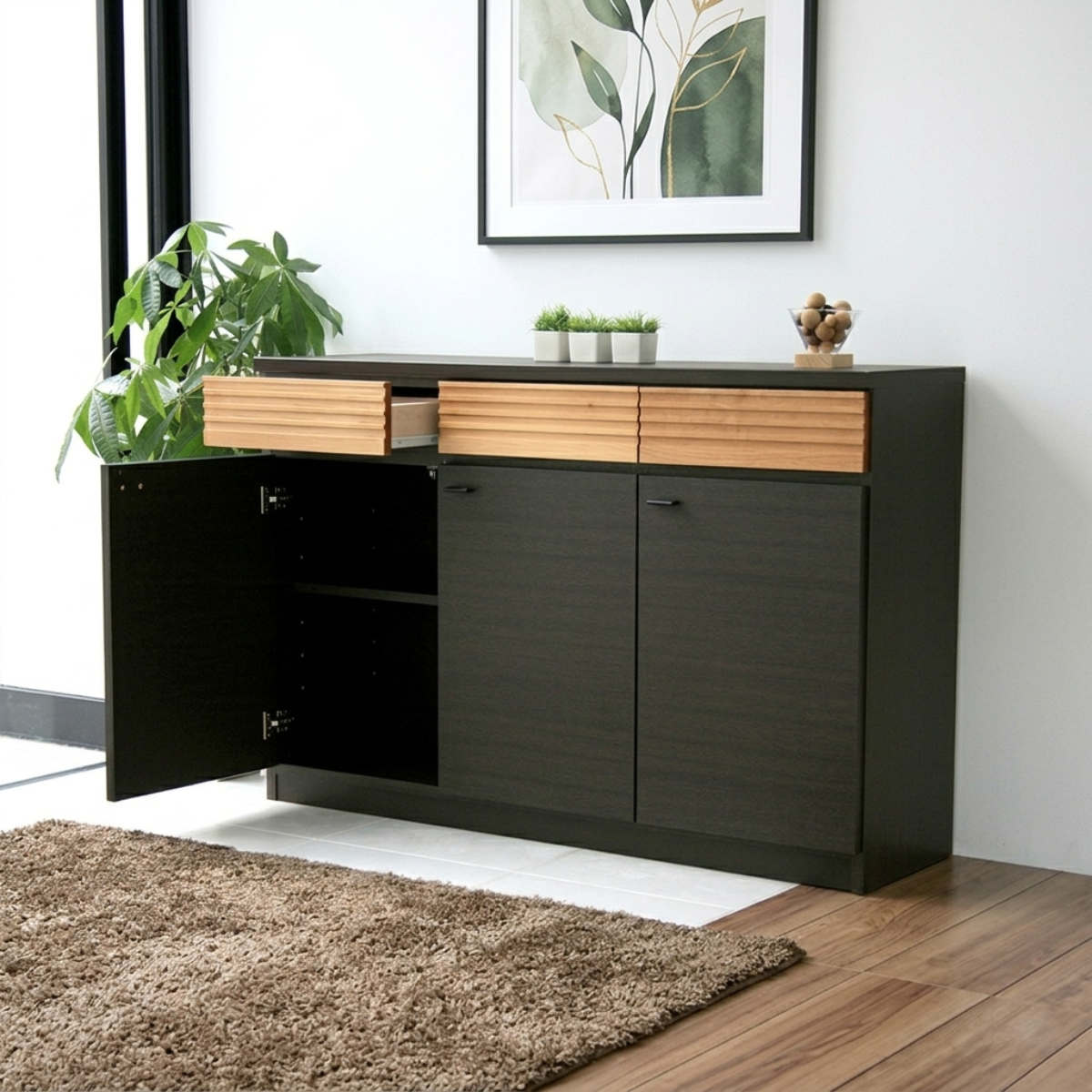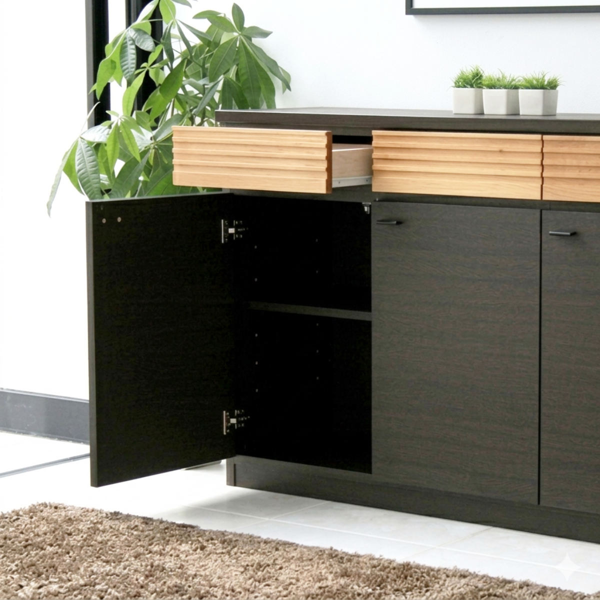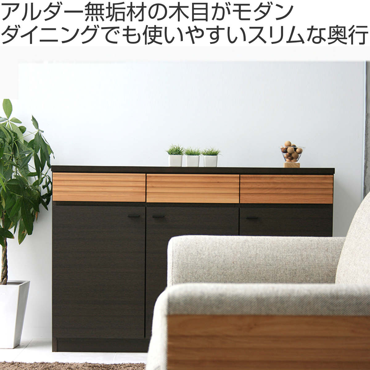 収納力とインテリア性を備えたサイドボードです。シンプルで洗練されたデザインが、リビングやダイニングなどのさまざまな空間に自然と溶け込みます。前板には天然木アルダー材を使用し、天然木の質感を感じることができます。