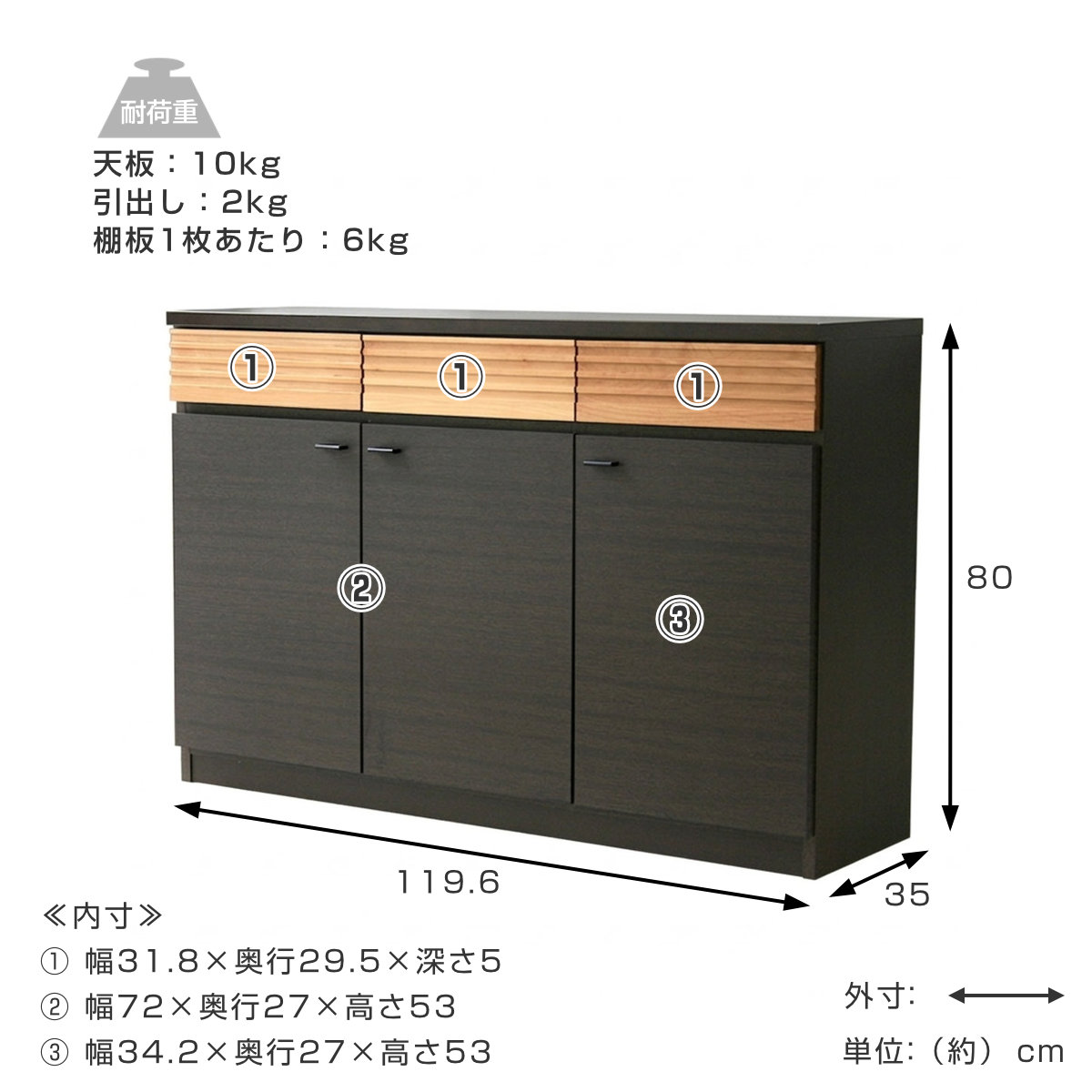 - 約幅119.6×奥行35×高さ80cm