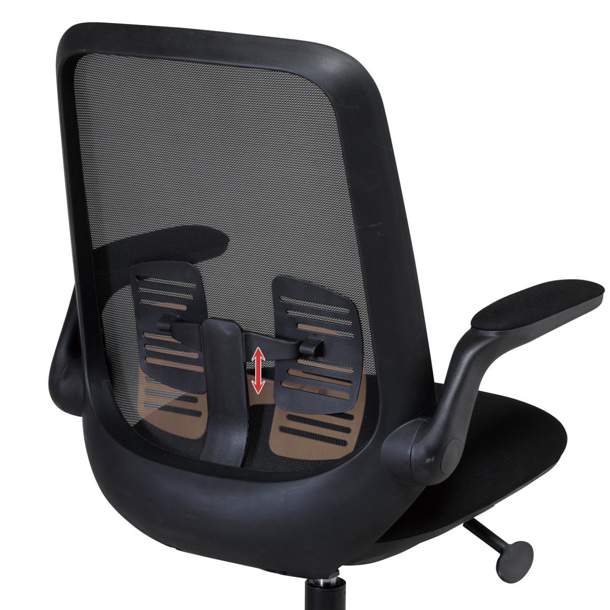 腰への負担を軽減する可動式ランバーサポート付きです。上下調節ができるため、体格や姿勢に合わせて最適な位置でしっかり腰を支えます。長時間の作業も快適にサポートします。