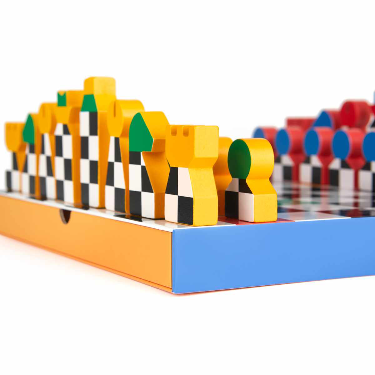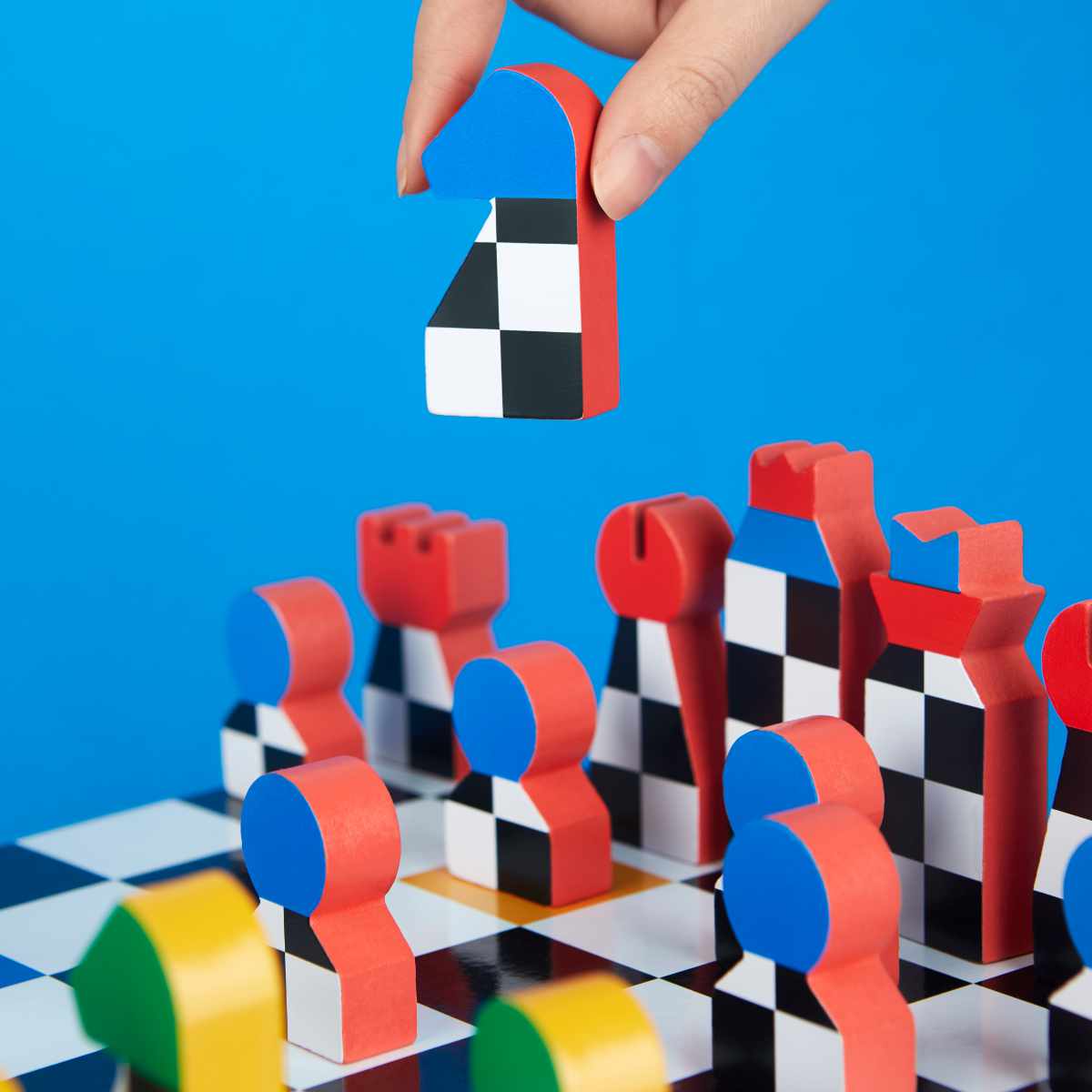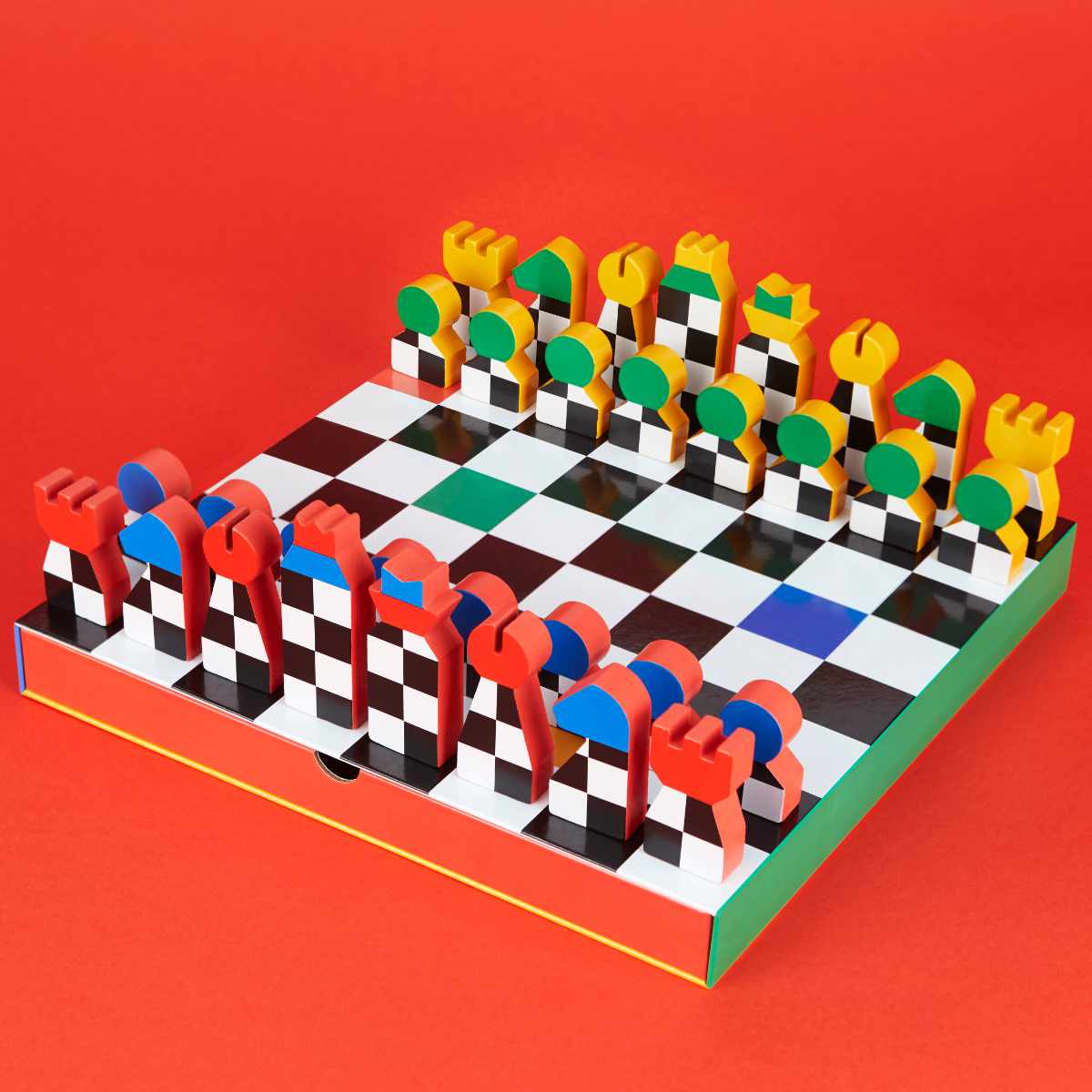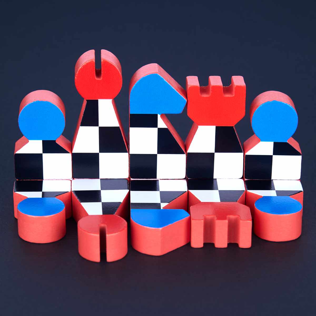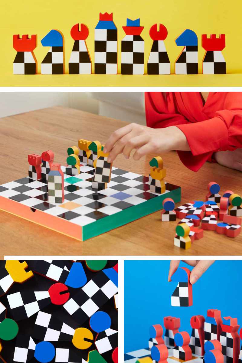 カラフルな駒とユニークなフォルムが目を引く、ポップでモダンなチェスセットです。駒は伝統的な形にとらわれないデザインで遊び心を感じさせながらも洗練された印象に仕上げられています。