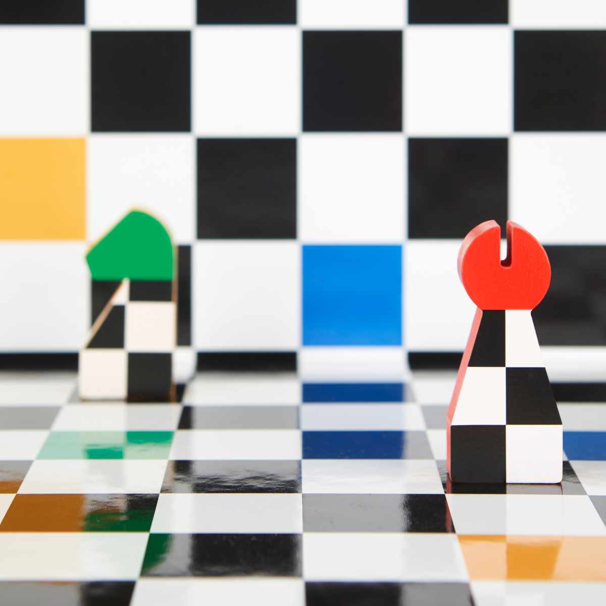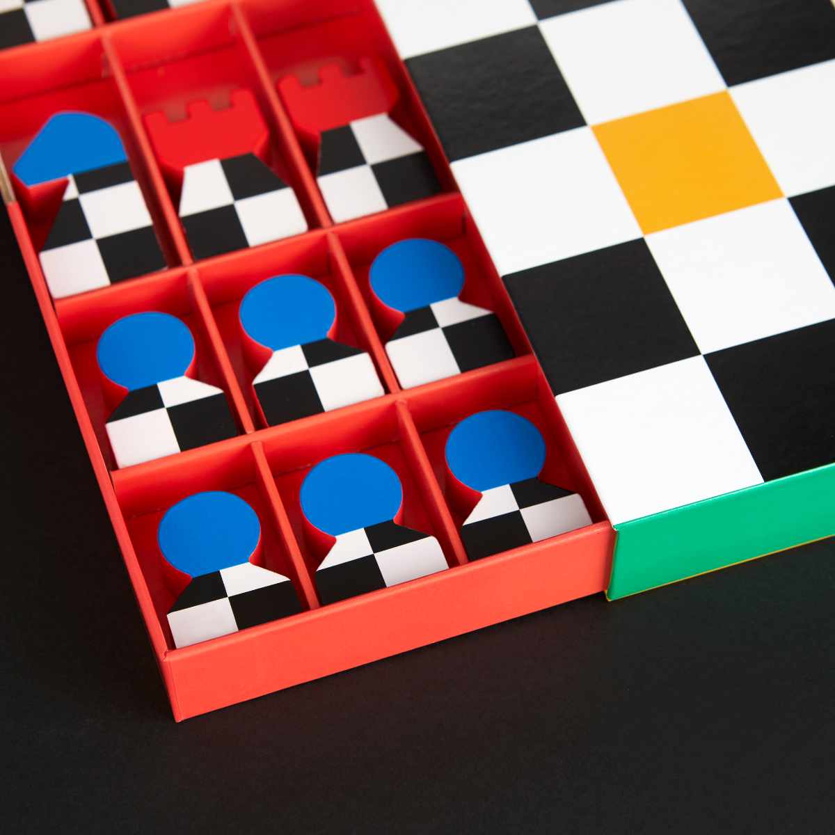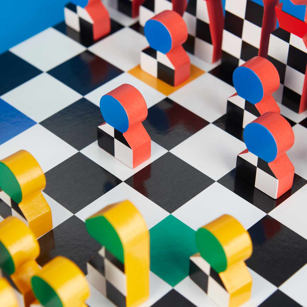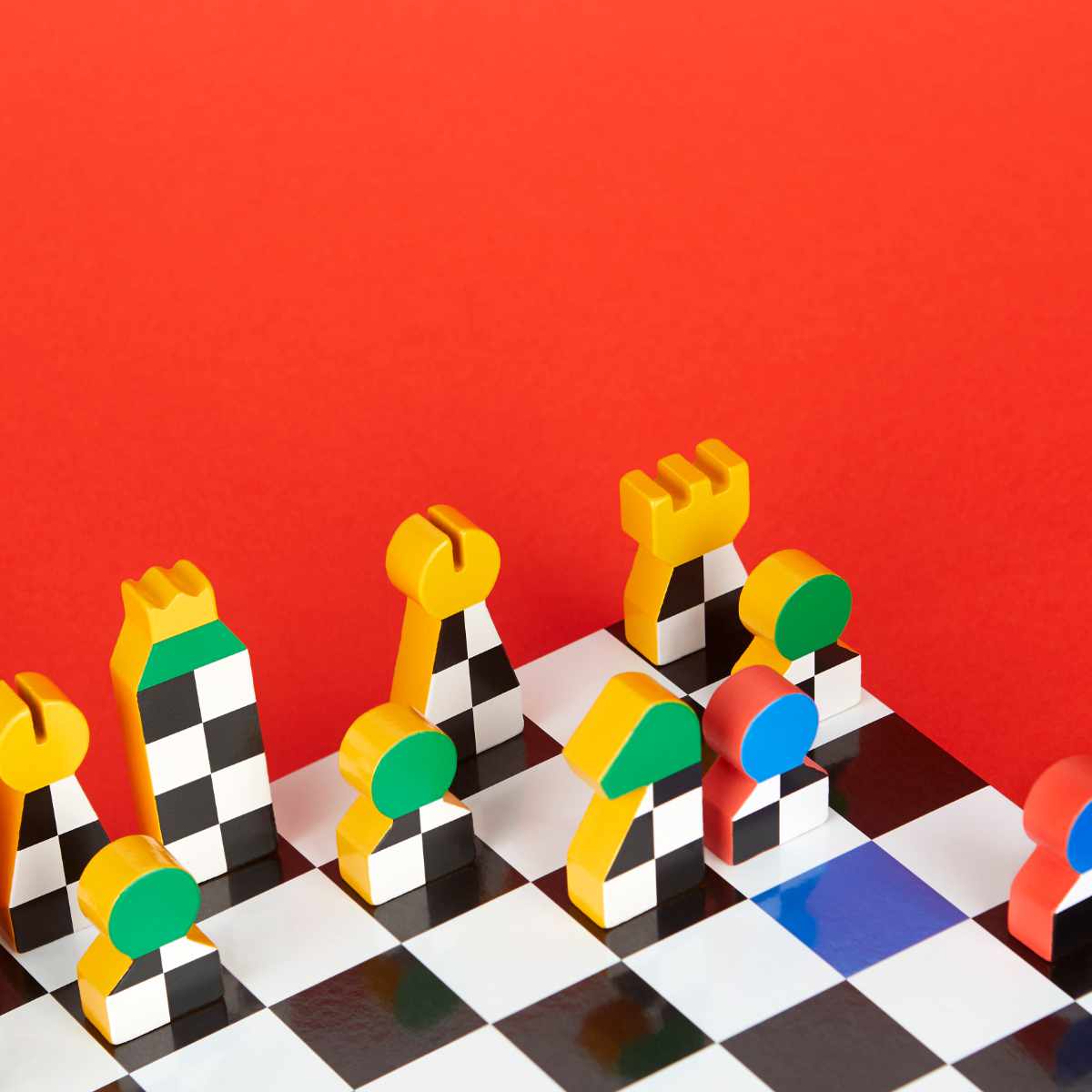 カラフルな駒とユニークなフォルムが目を引く、ポップでモダンなチェスセットです。駒は伝統的な形にとらわれないデザインで遊び心を感じさせながらも洗練された印象に仕上げられています。