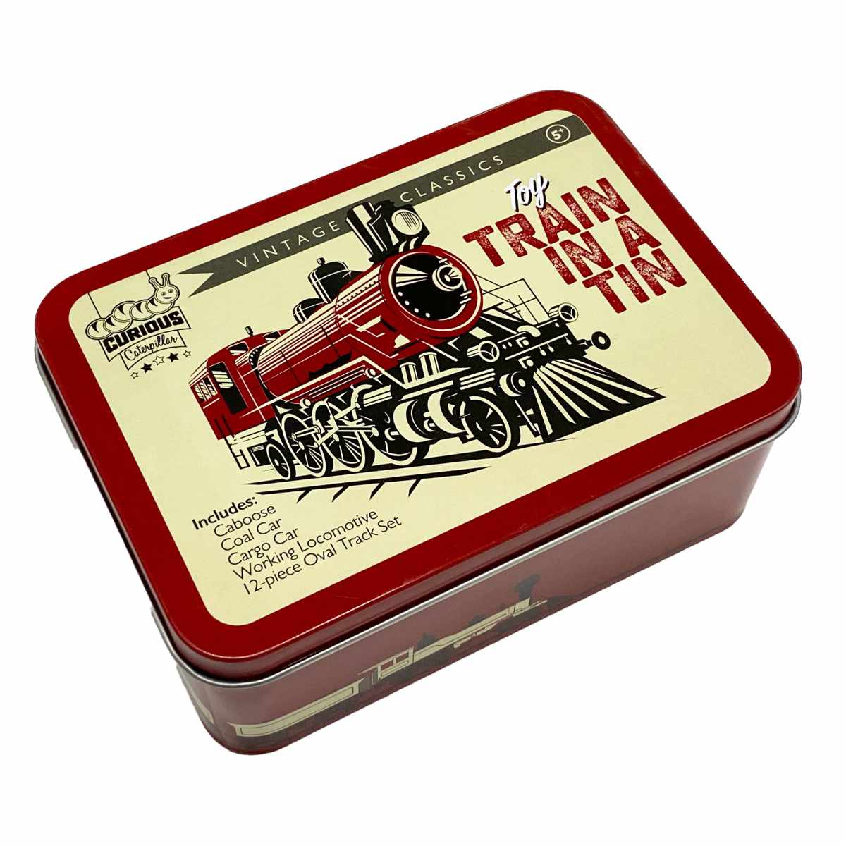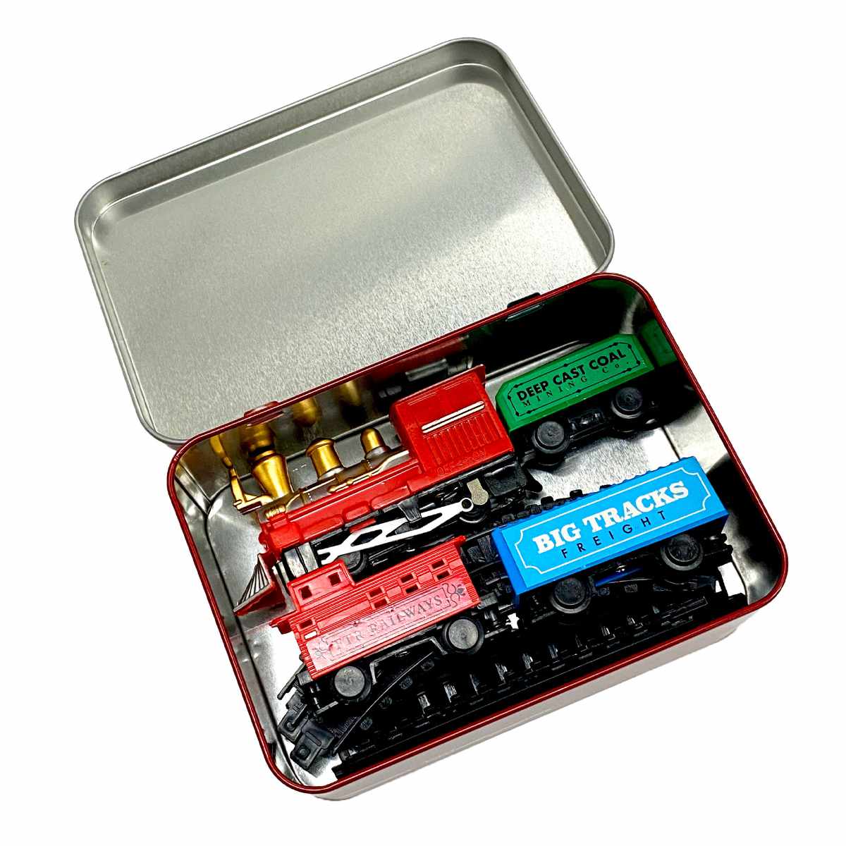 缶を開けるとミニ機関車と線路がすべて中に収まっています。線路をつなげてスイッチを入れると機関車がゆっくり走行し、デスクや棚の上で小さな世界を楽しめます。
