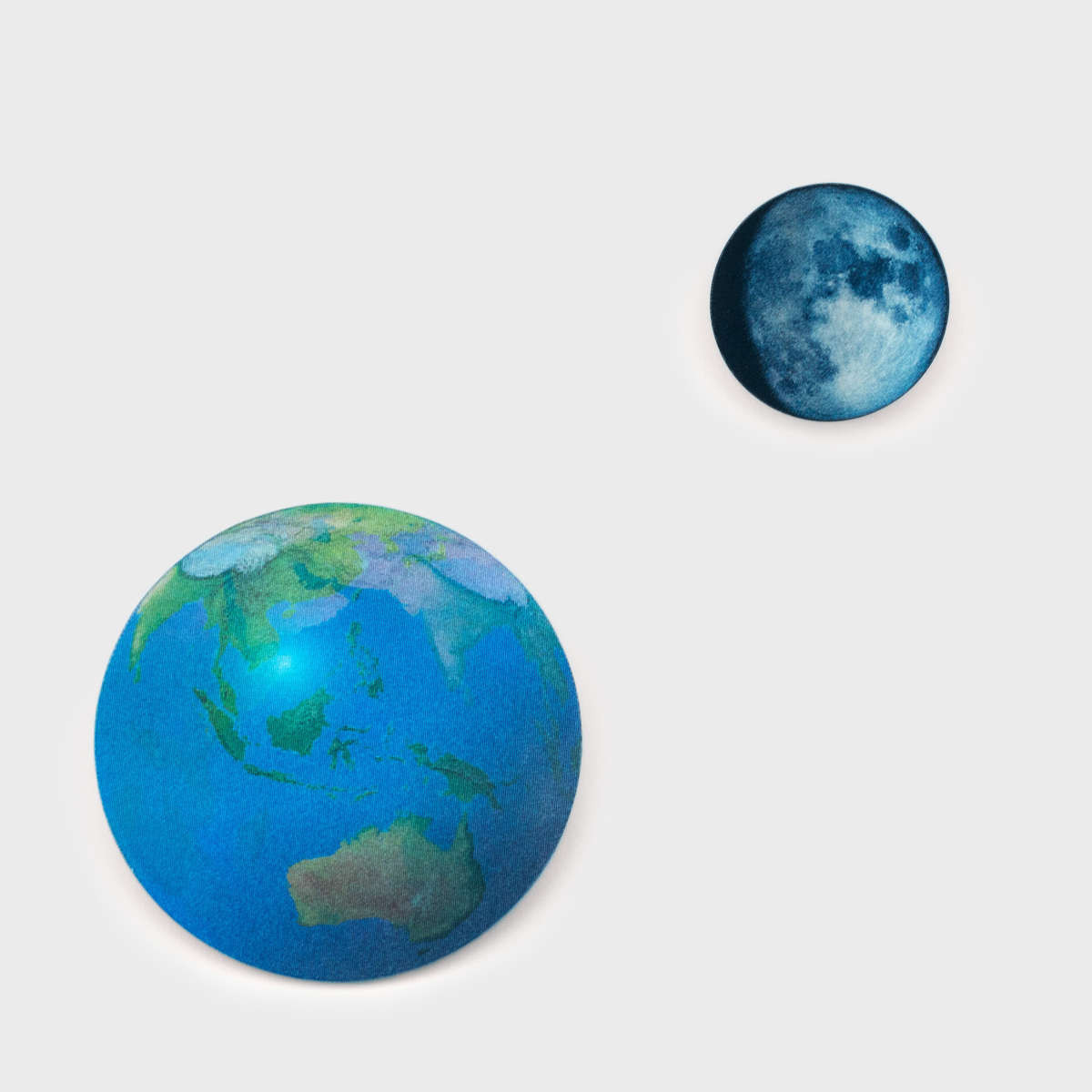 自転する地球と、満ち欠けする月のマグネットセットです。フラットな仕様で、角度を変えて傾けると、絵柄が少しずつ変化し、自転する地球、満ち欠けする月の様子を楽しめます。思わず何度も動かして眺めたくなる、不思議な仕掛けです。