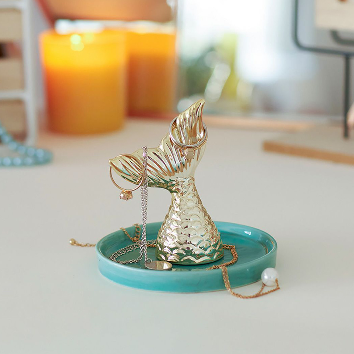 リングはモチーフ部分に掛けてすっきりと収納でき、トレーにはピアスやネックレスなどの小物をまとめて置くことができます。高さのあるデザインなので、アクセサリーに立体感が生まれ、自然と視線を集めるディスプレイとして楽しめます。