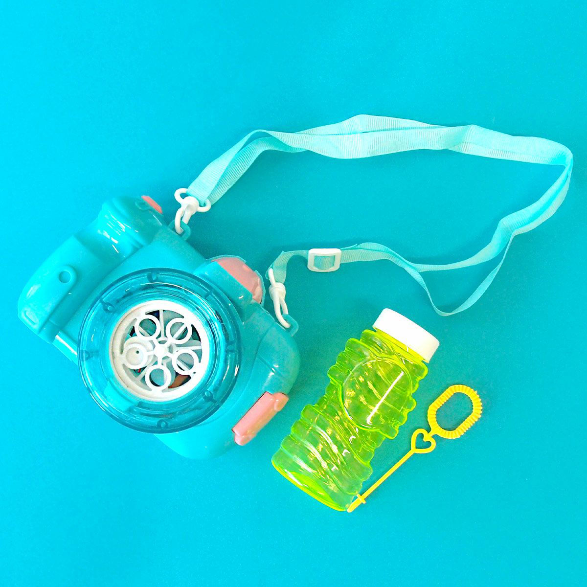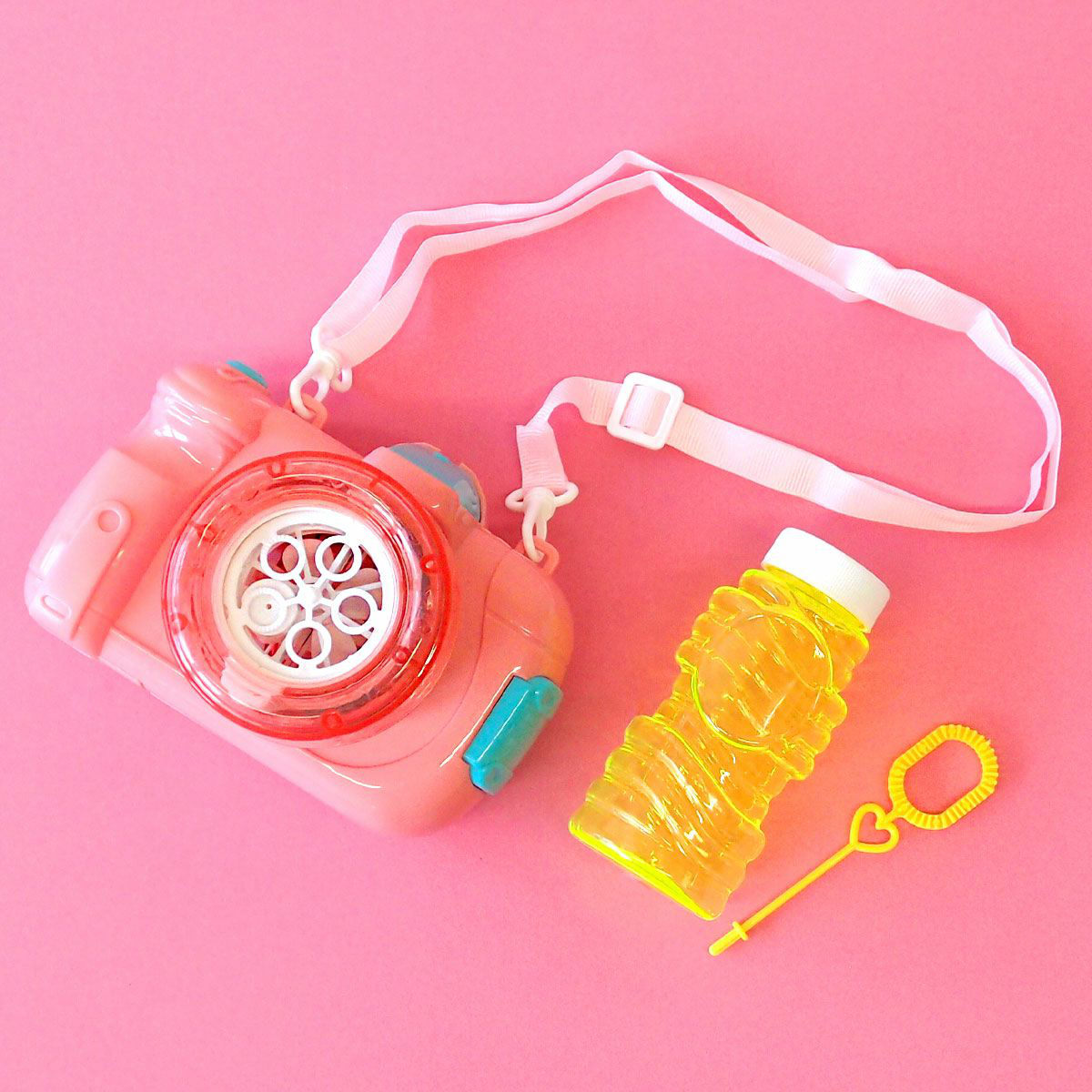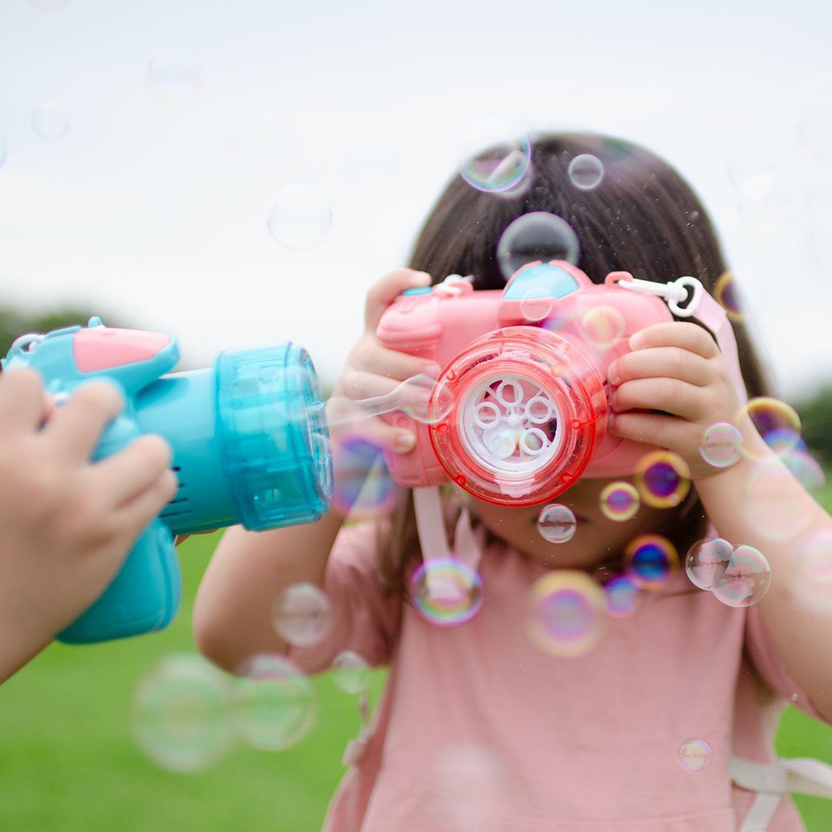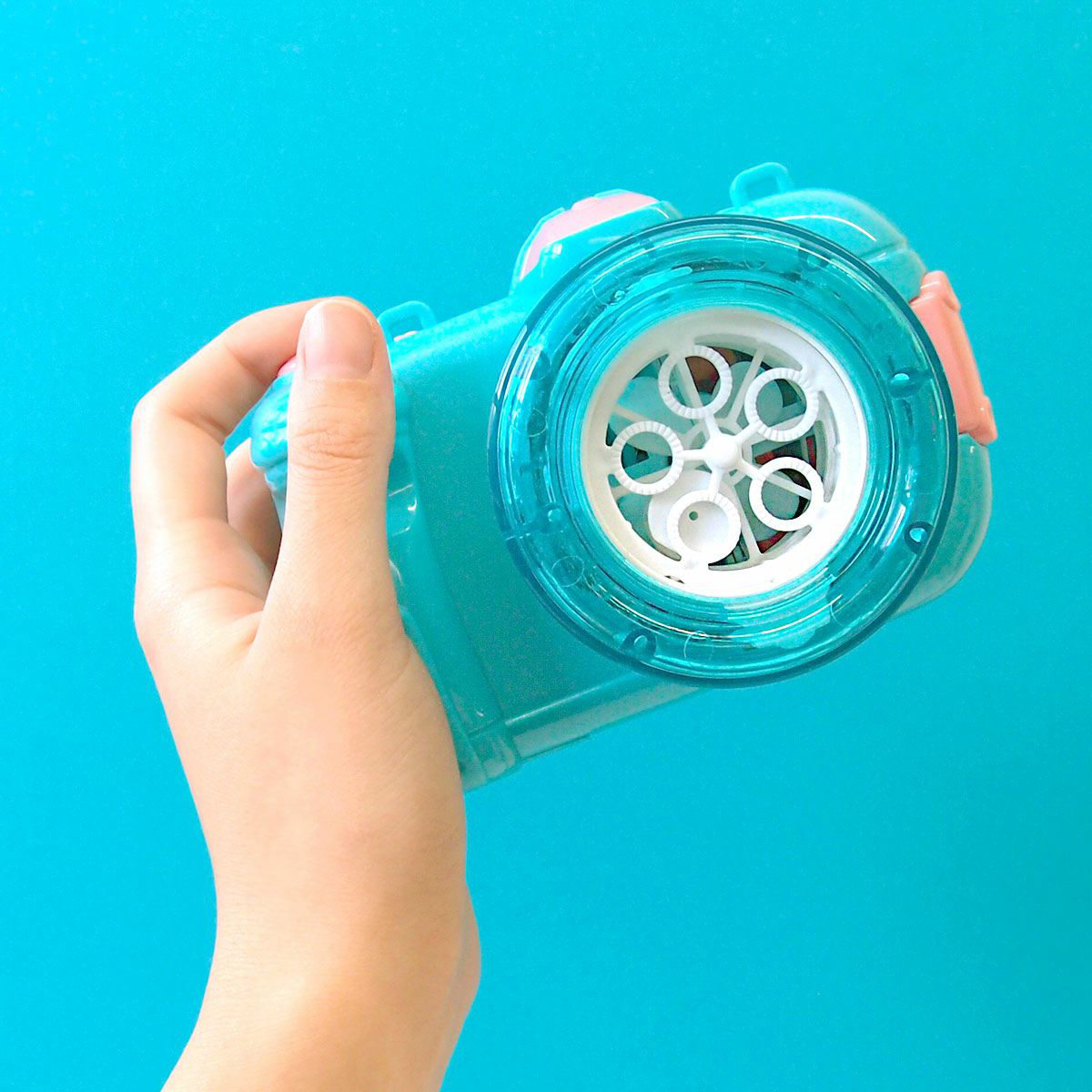 思わず写真を撮りたくなるようなカメラ型のシャボン玉マシーンです。ポップでかわいいデザインと光るギミックで、遊びの時間をより盛り上げます。
