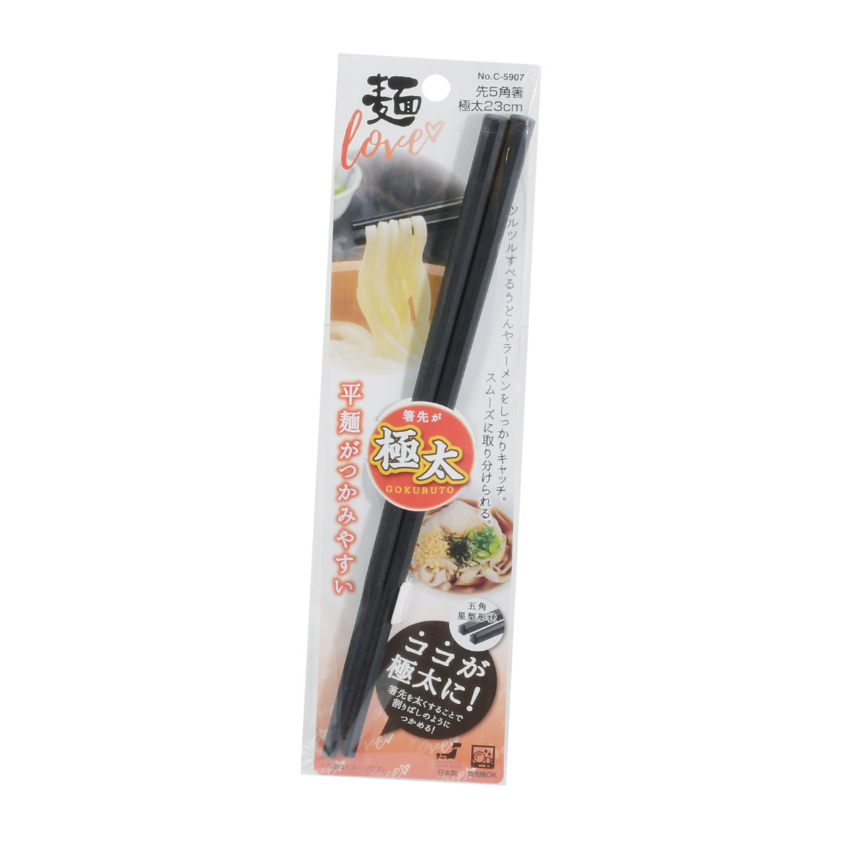 握りやすく滑りにくい先5角形状の極太箸です。長さ23cmで、うどんやラーメンなどの麺類もつるっと逃さずしっかりつかめます。耐久性も高く、毎日の食卓で安心して使えます。