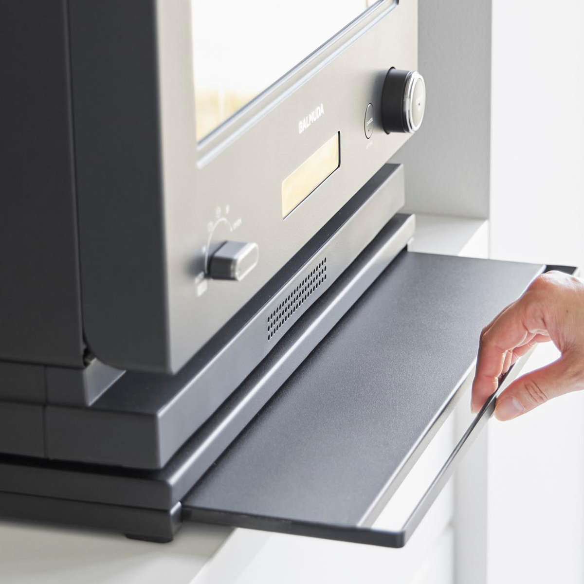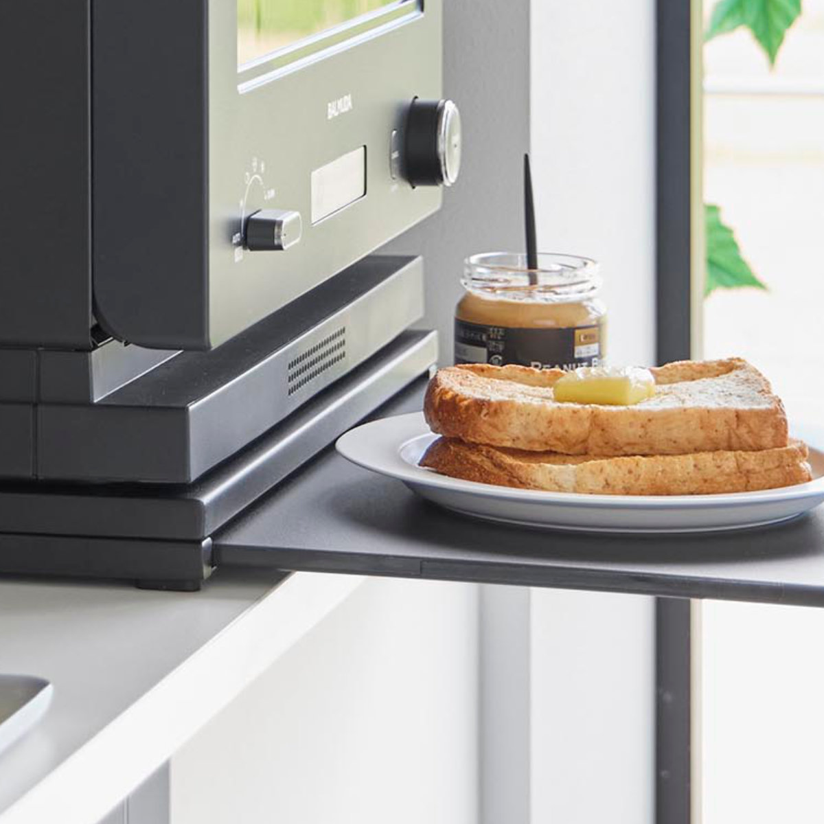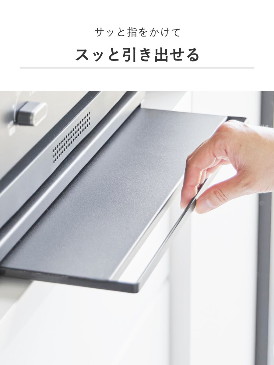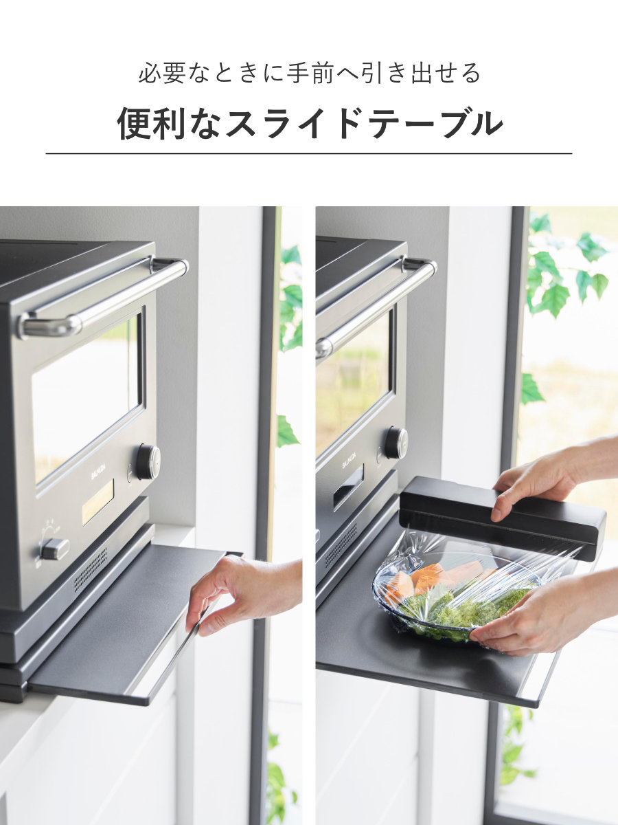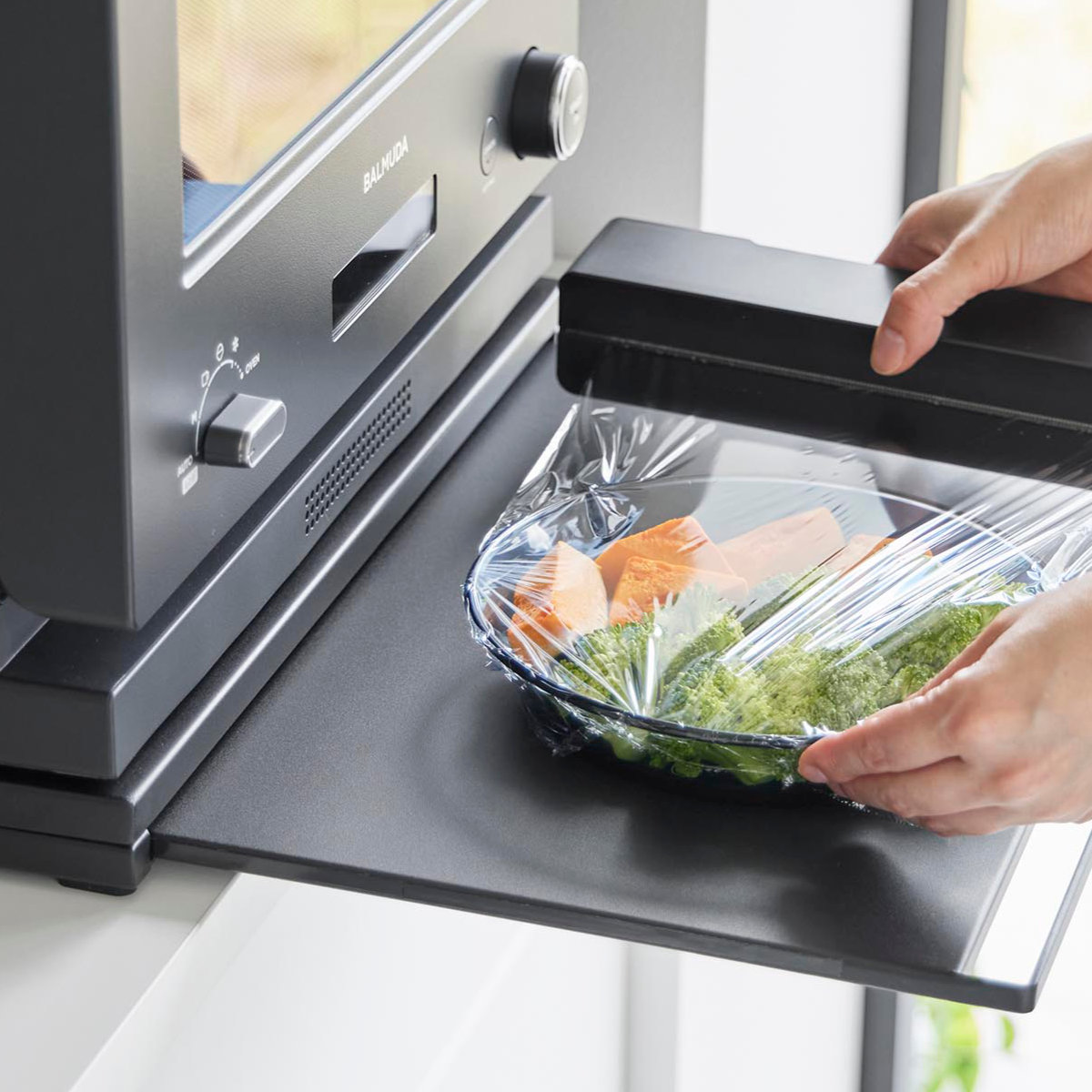 必要なときに手前へサッと引き出せるので、電子レンジで温める前のラップがけなどの作業もスムーズに行えます。