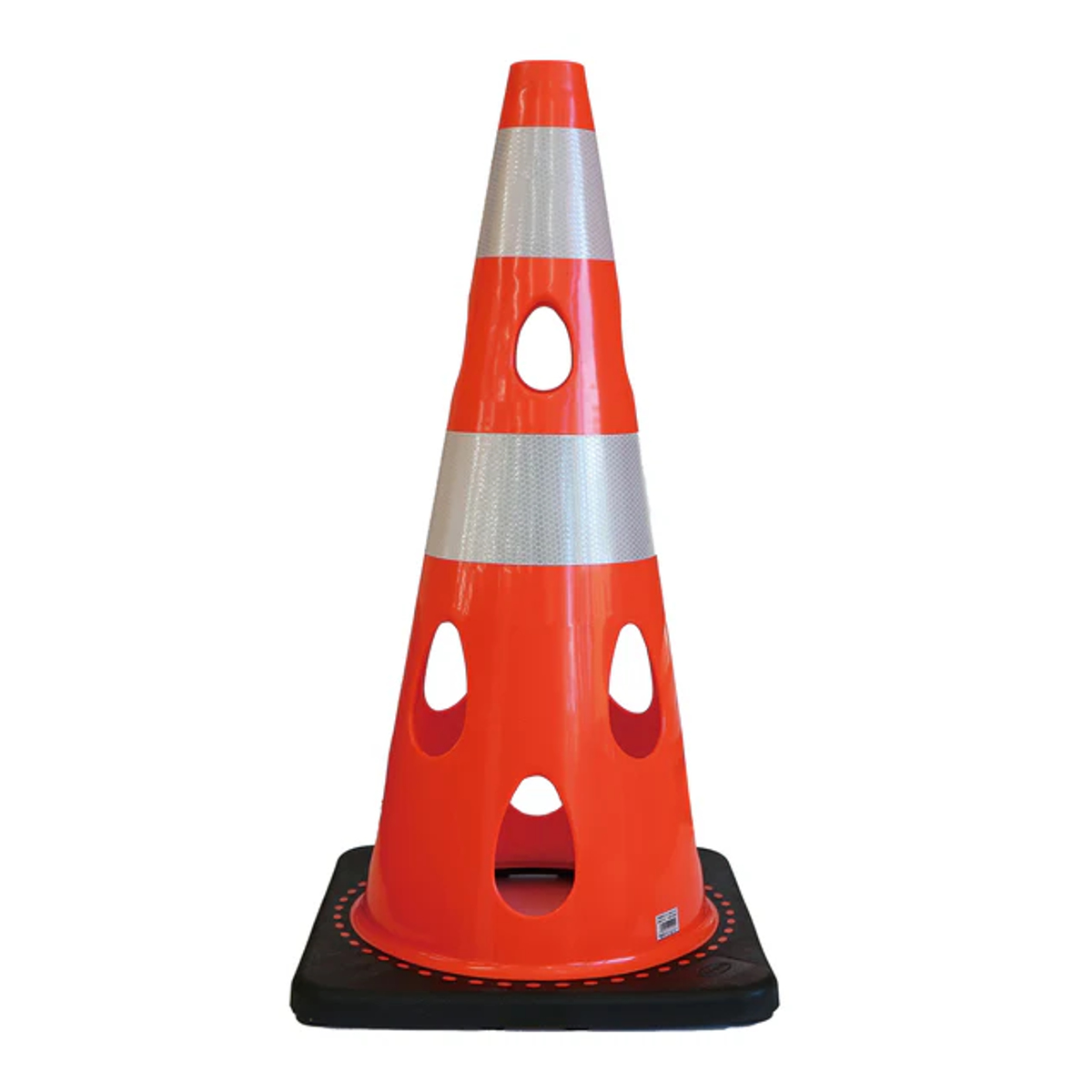 風に強く倒れにくい、穴あきコーン同色5個セットです。本体全体に設けられた穴構造により、風や水の抵抗を逃がし、強風時や冠水時でも倒れにくい設計です。