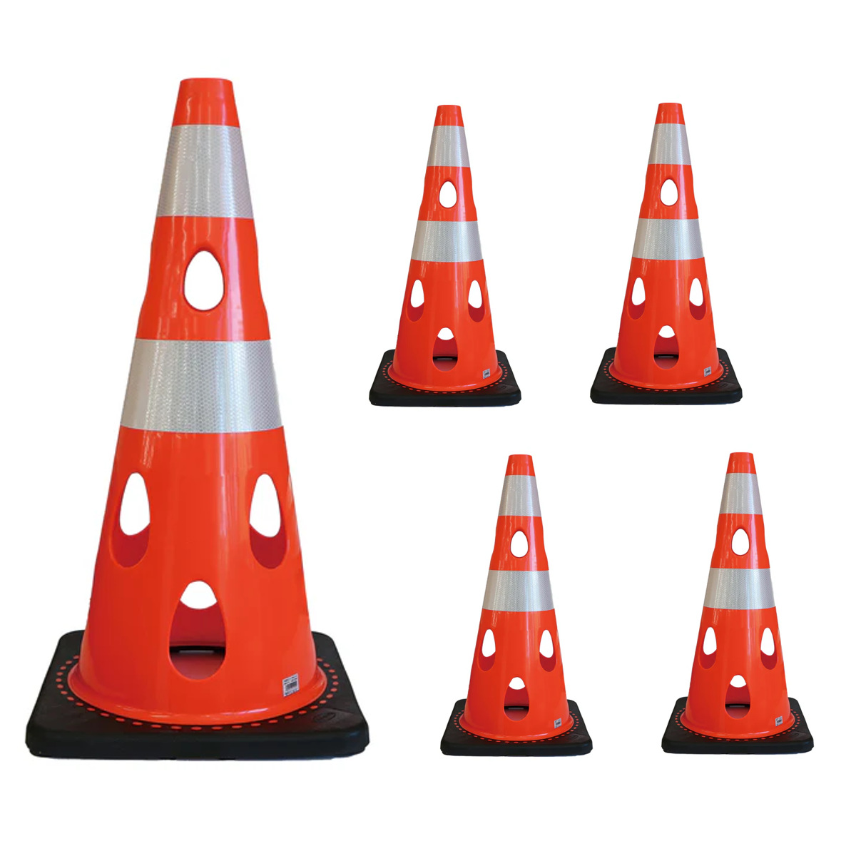 風に強く倒れにくい、穴あきコーン同色5個セットです。本体全体に設けられた穴構造により、風や水の抵抗を逃がし、強風時や冠水時でも倒れにくい設計です。