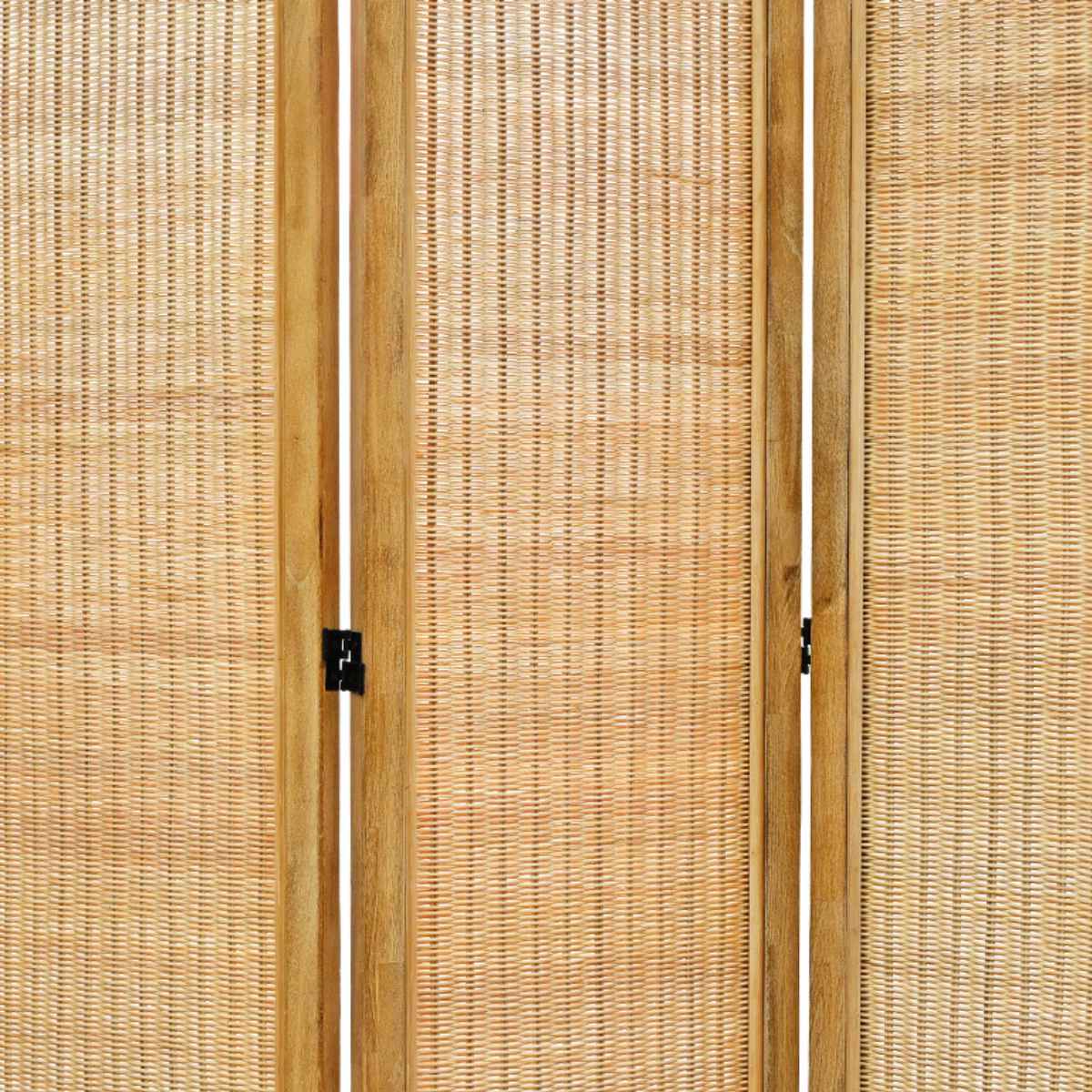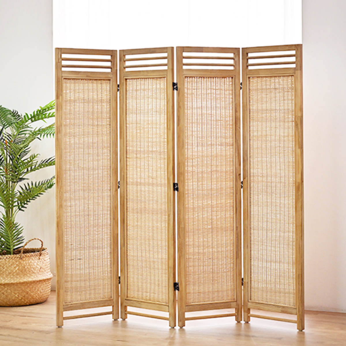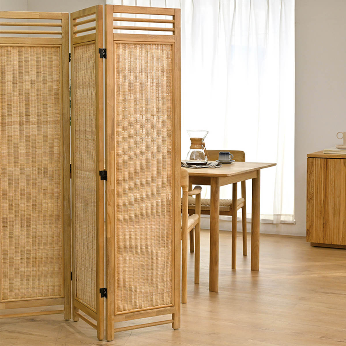 天然木フレームに、丁寧に編み上げられたラタンを組み合わせた4連パーテーションです。ラタンの編み目からやわらかく差し込む光が、お部屋に心地よい抜け感を生み出し、ナチュラルでおしゃれな空間を演出します。
