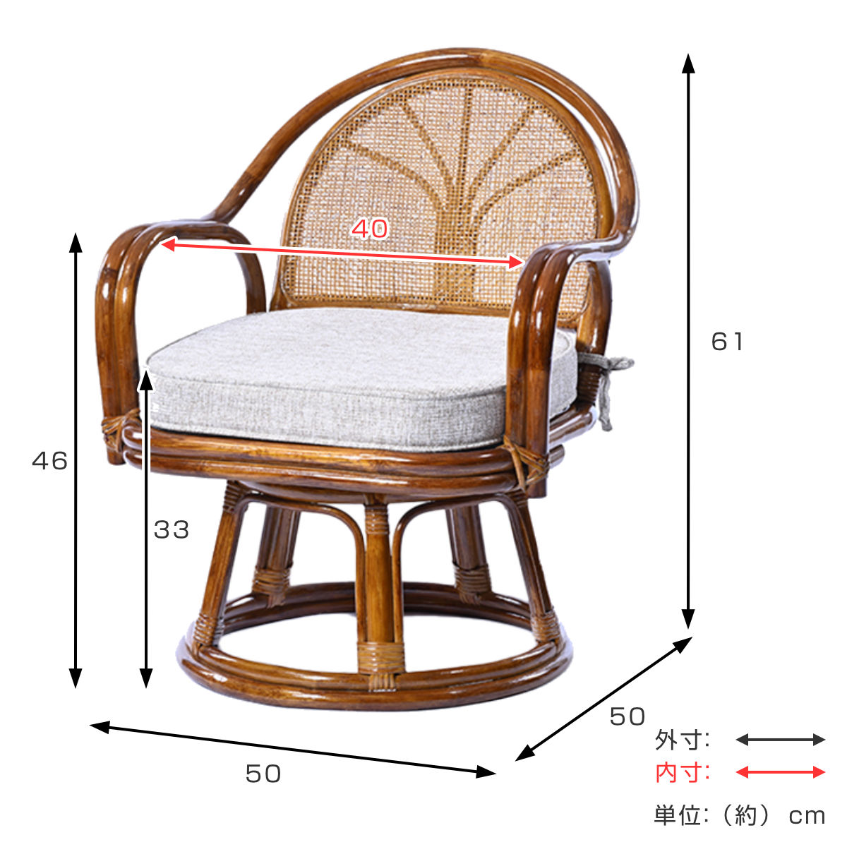 | サイズ | 約 幅50×奥行50×高さ61(cm) 座面高:約 33(cm) |