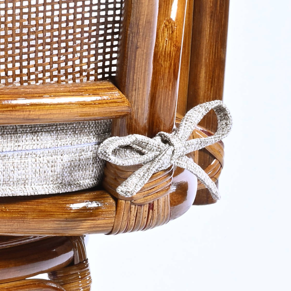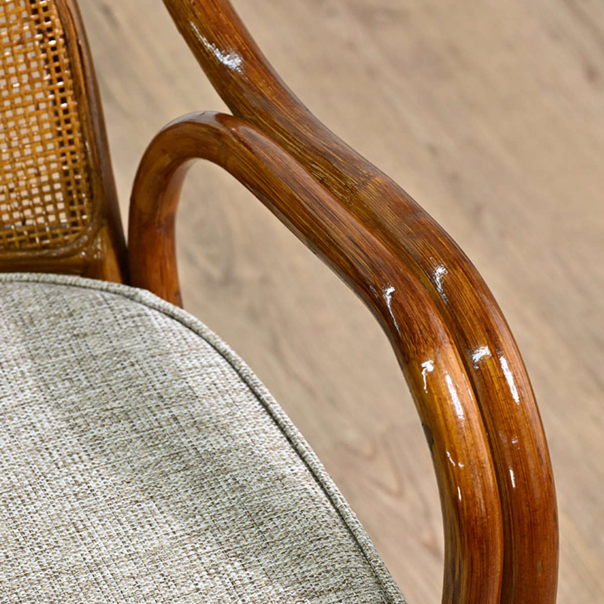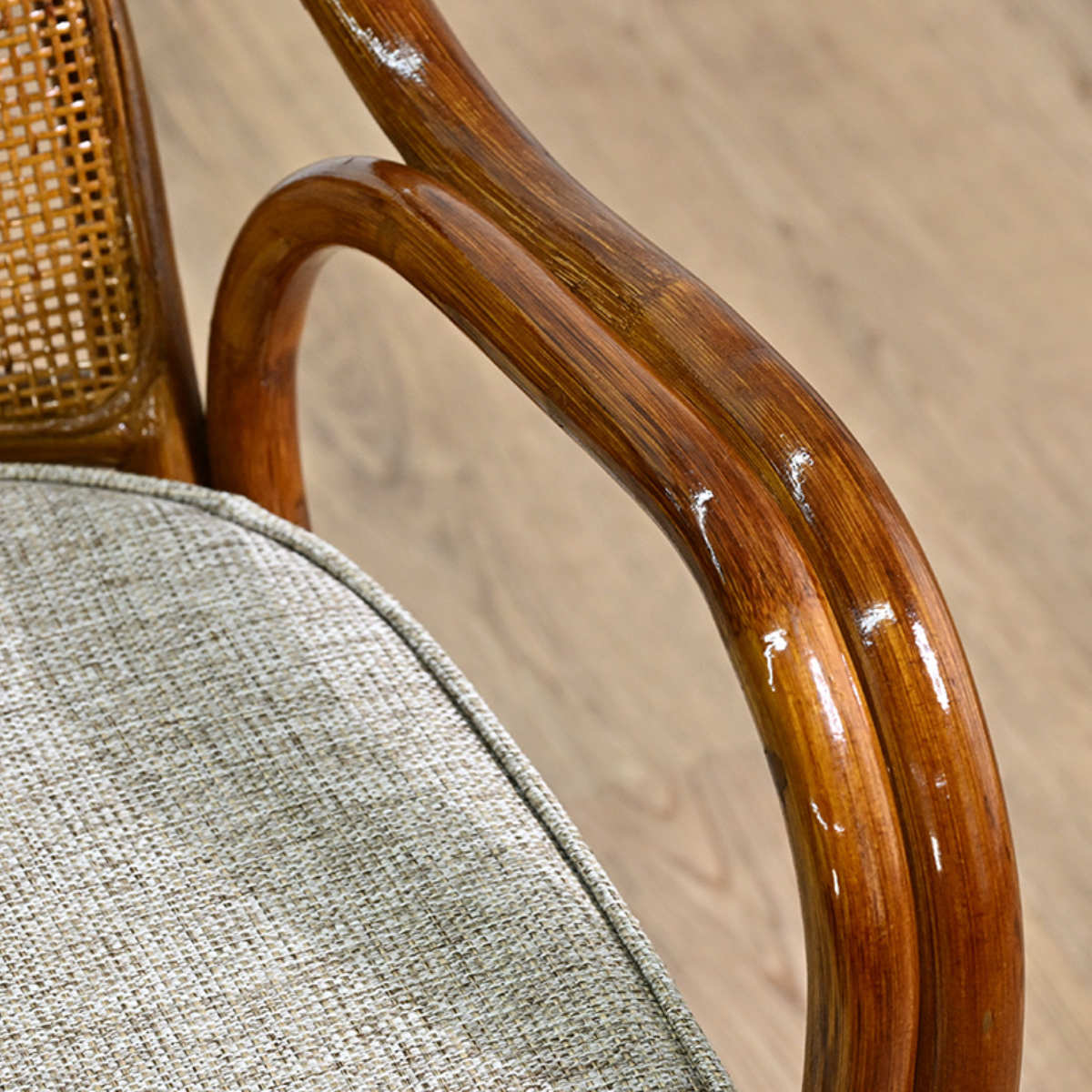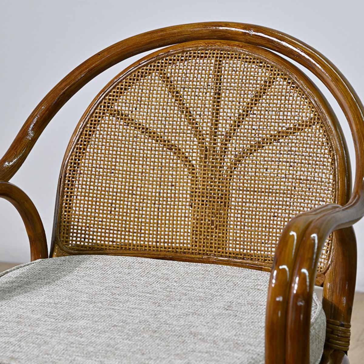 ゆるやかな曲線を描く2本のラタンのひじ掛けは、腕を自然に預けられる形状です。しっかりとした太さで握りやすく、立ち上がる際や座る際の動作をサポート。身体への負担を軽減し、快適にお使いいただけます。
