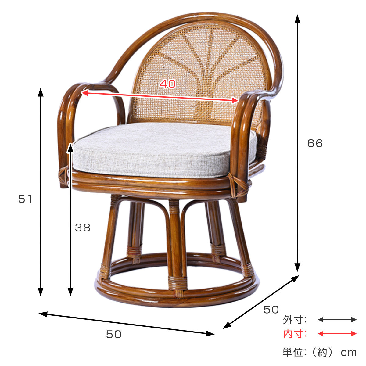 | サイズ | 約 幅50×奥行50×高さ66(cm) 座面高:約 38(cm) |