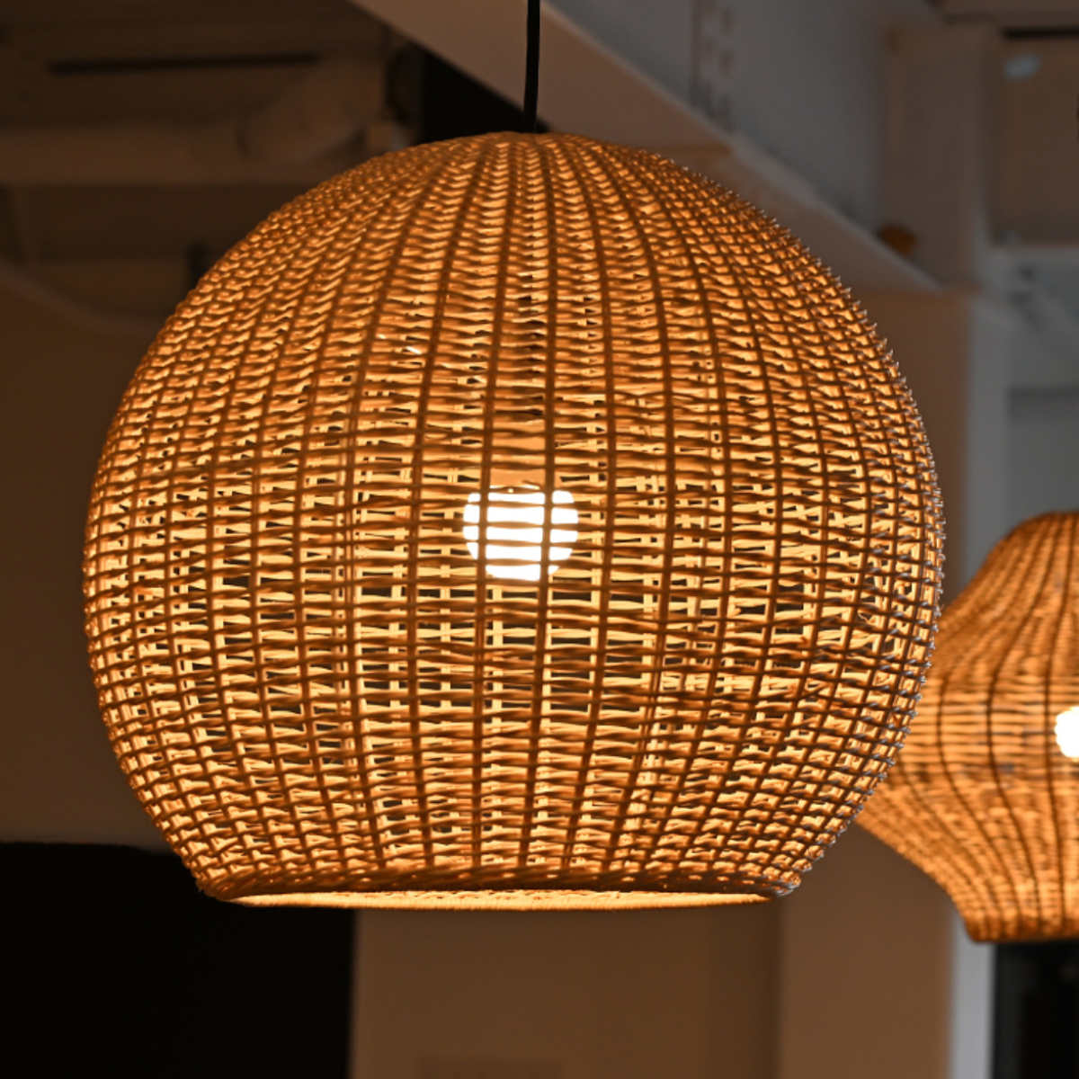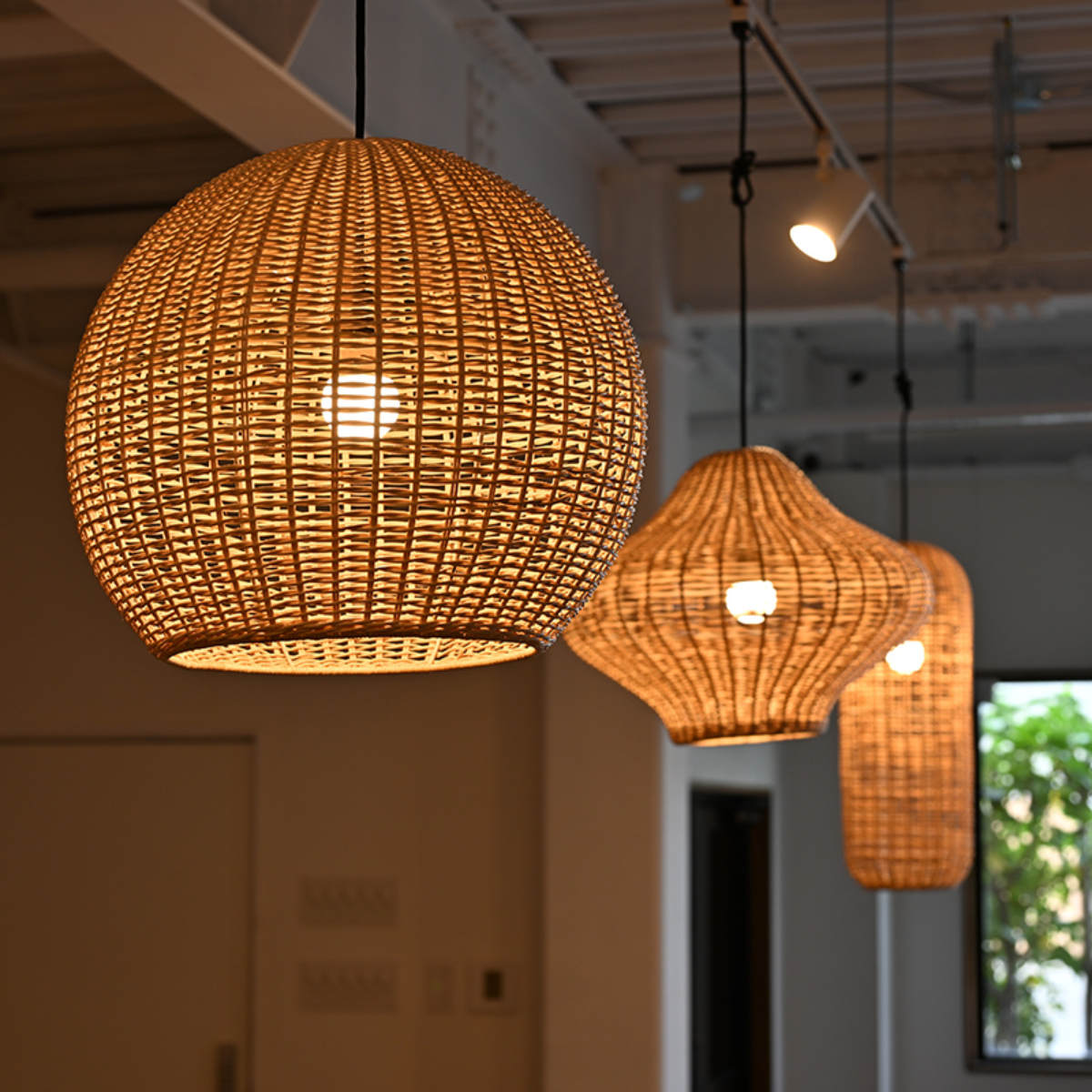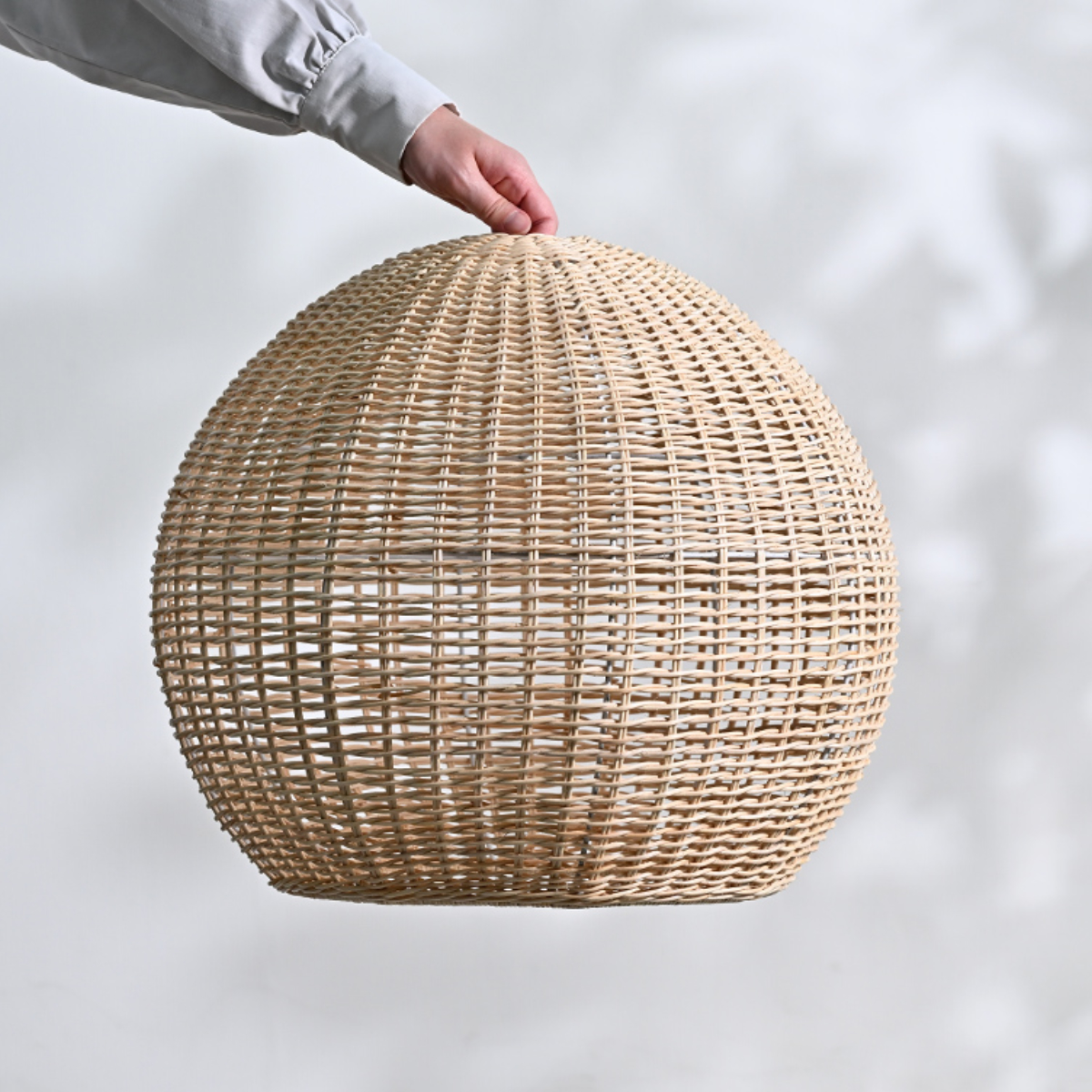 天然素材のラタンで作られた存在感あるランプシェードです。編み目からこぼれる光が、お部屋にやさしい陰影を生み出し、カフェのような落ち着いた空間を演出します。ダイニング・リビング・店舗照明など、空間のアクセントとしておすすめです。