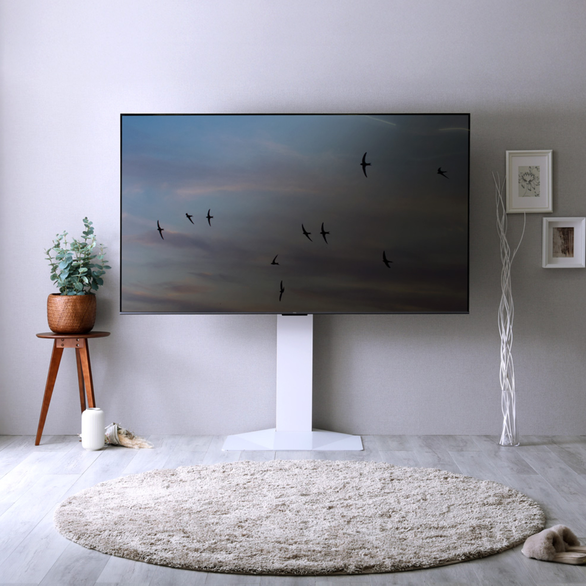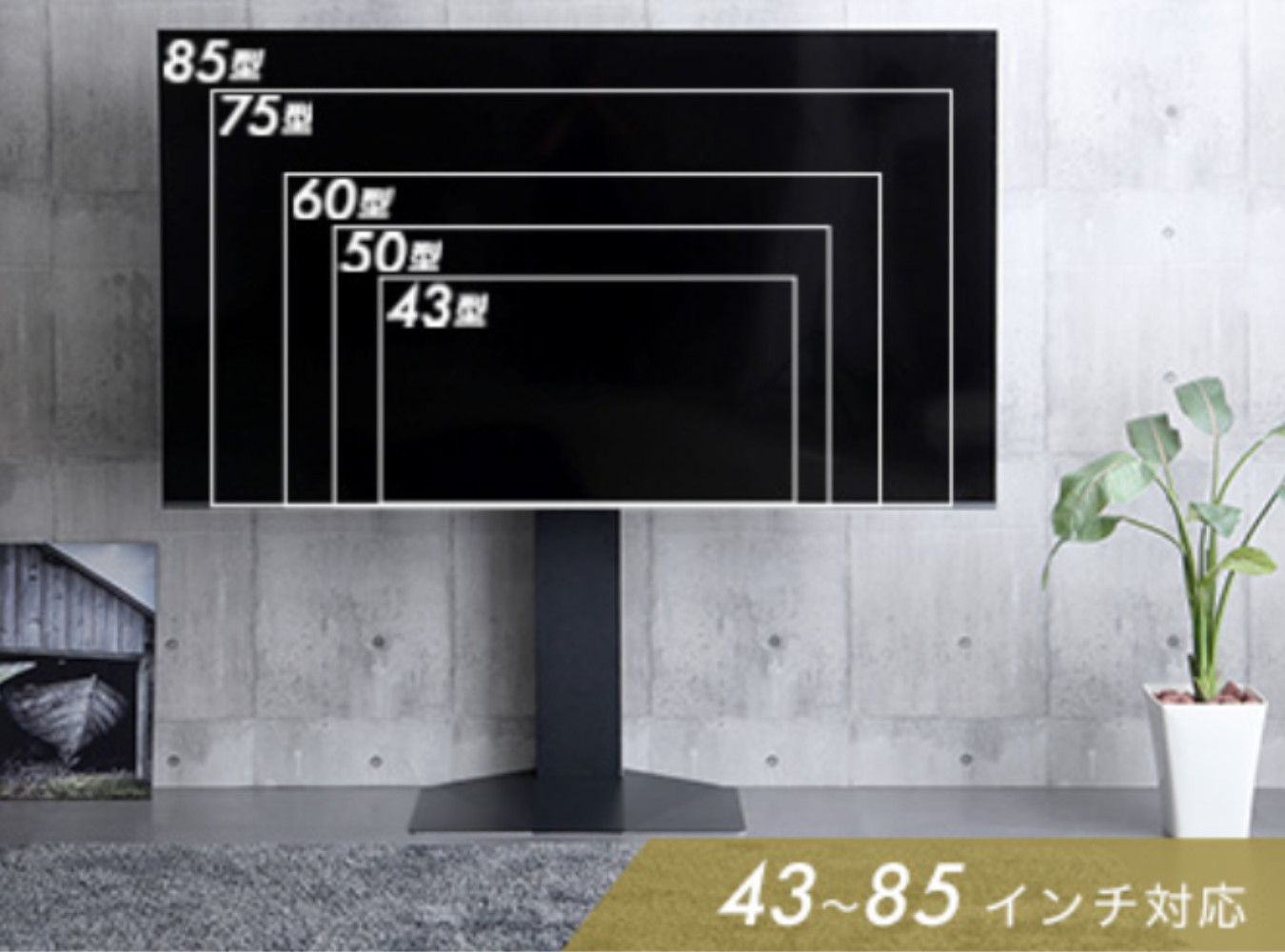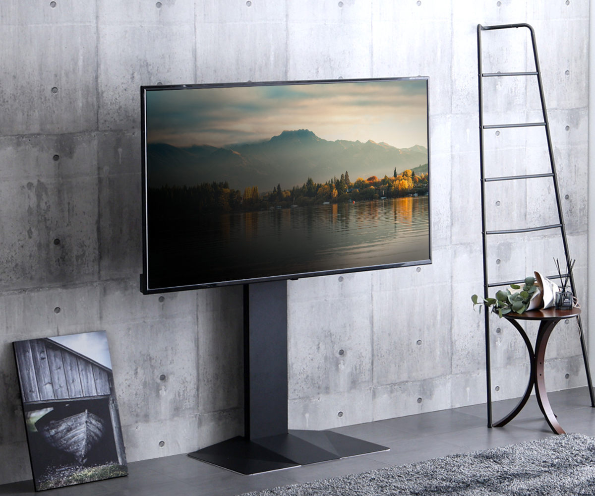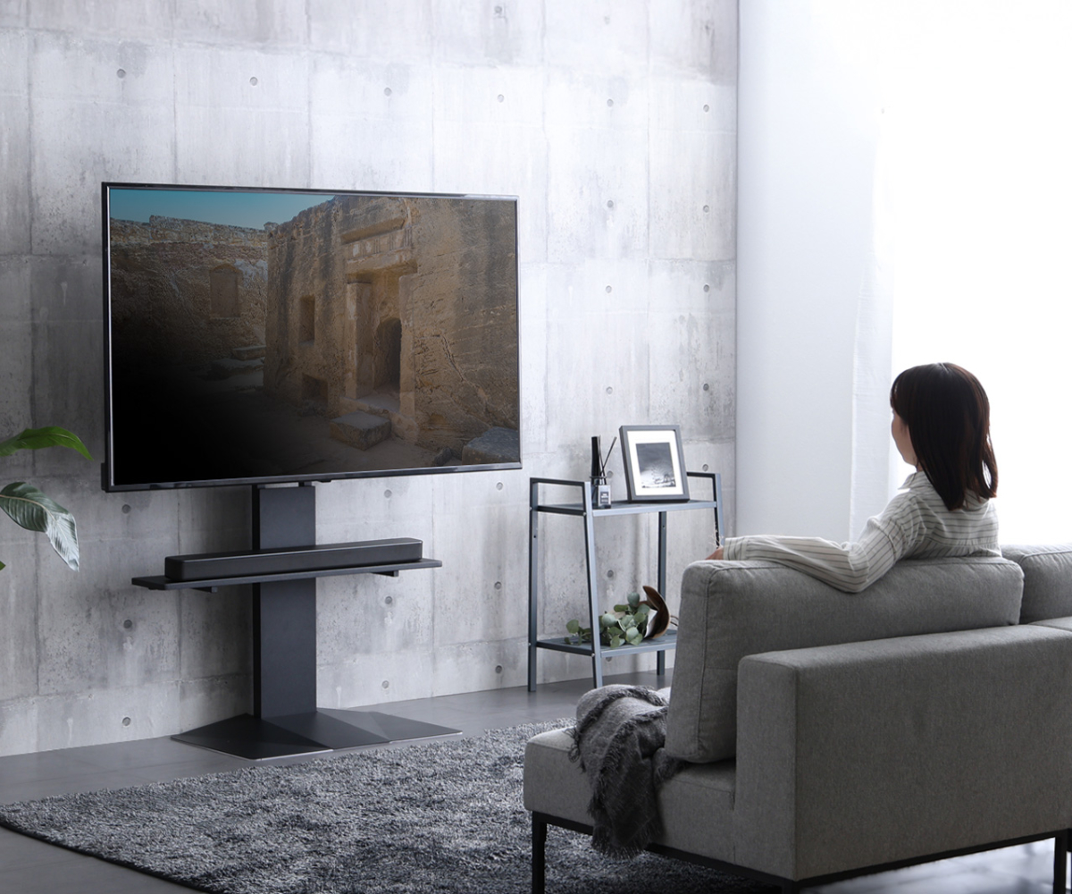 無駄のないシンプル&スタイリッシュなデザインで、お部屋をすっきりと演出します。省スペース設計で、リビングや寝室にもおすすめ。43インチから85インチまで幅広く対応し、85インチの大型テレビも安定して設置可能です。