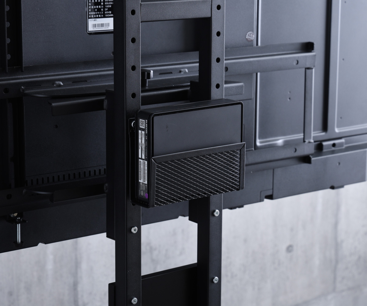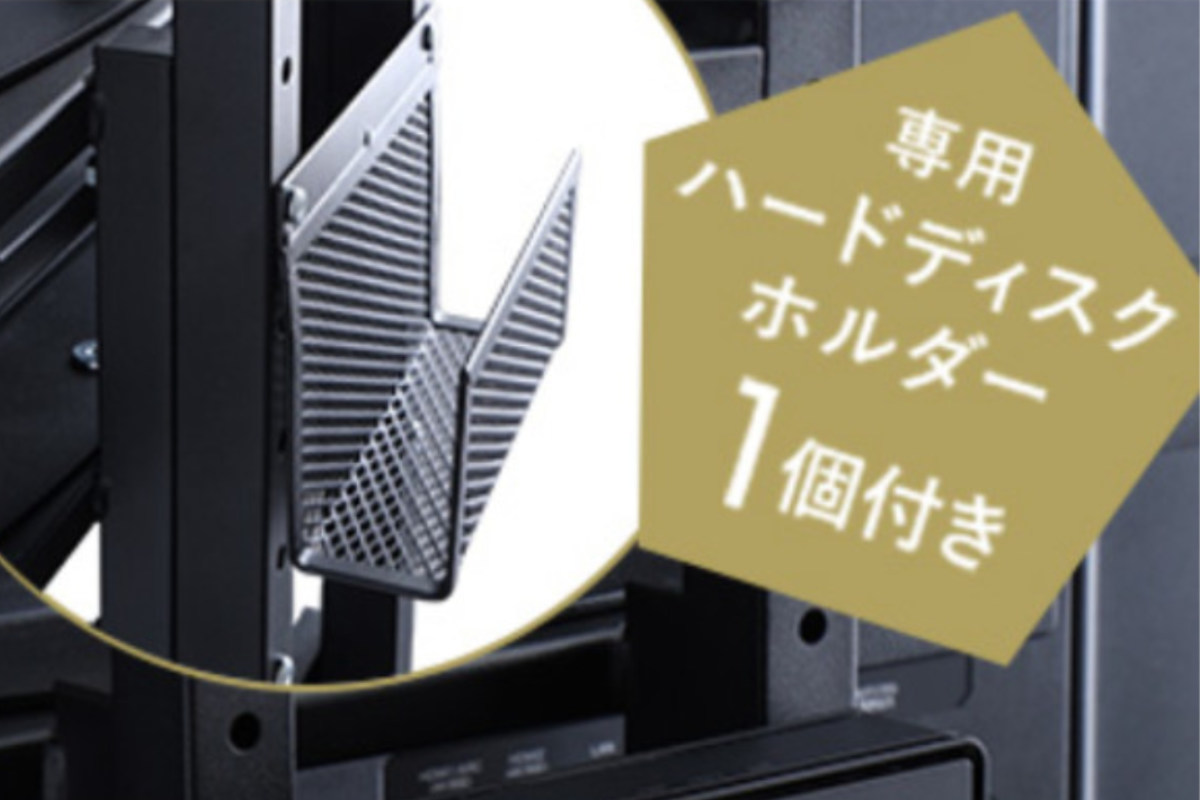 外付けハードディスクをテレビ背面に固定できるハードディスクホルダーを付属しています。テレビまわりで置き場所に困りがちな外付けHDDを、スタンド背面にすっきり収納できます。