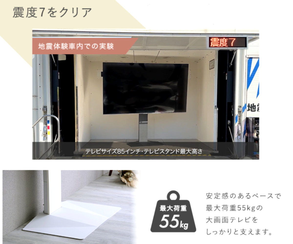 本製品は、震度7相当の耐震試験をクリアした安心設計です。安定感のある構造と強固なベース設計により、日常使いはもちろん、防災面にも配慮したテレビスタンドです。