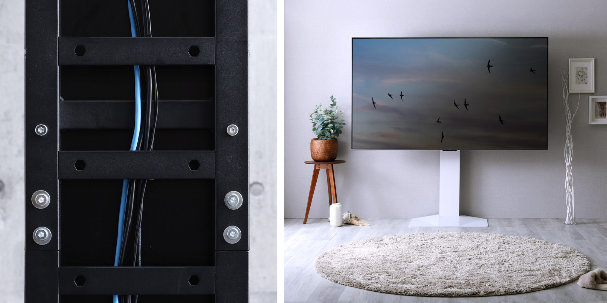 配線やケーブル類をスタンド背面にまとめて収納できるため、正面から見ても美しく、リビング全体が整った印象になります。