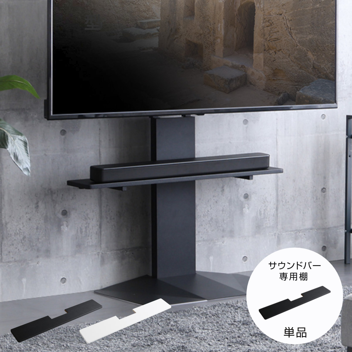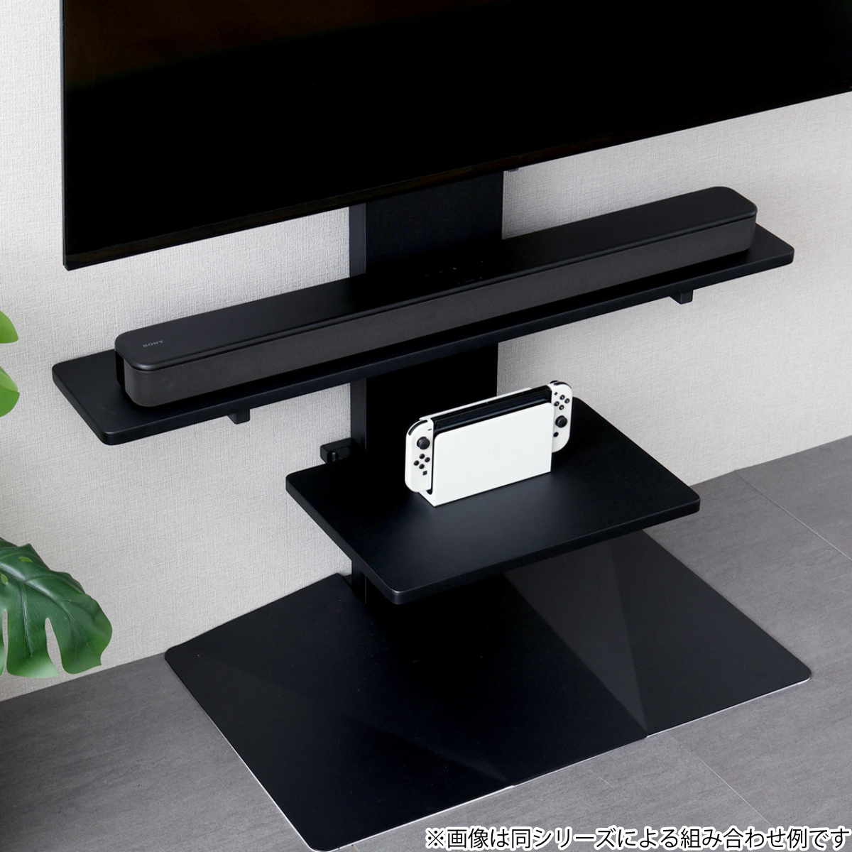 同シリーズ、別売りの専用サウンドバー棚板と、専用棚板を組み合わせると、機器や小物をまとめて置けてさらに便利です。