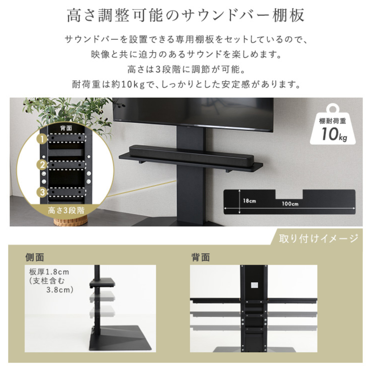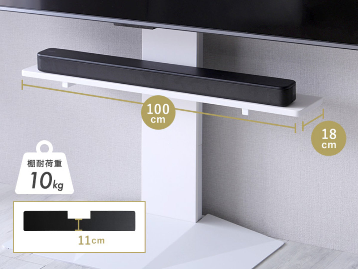 耐荷重は約10kgで安定感があり、幅100cmまでの長めのサウンドバーでもしっかり設置でき、安心してご使用いただけます。