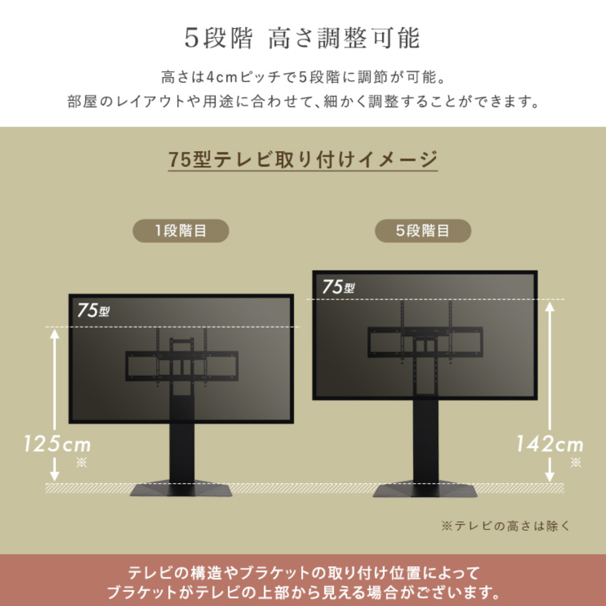 お部屋のレイアウトや視聴スタイルに合わせて、125~142cmで高さ調節が可能です。目線に合った高さにすることで自然と姿勢が楽になり、長い時間の視聴でも疲れにくいです。