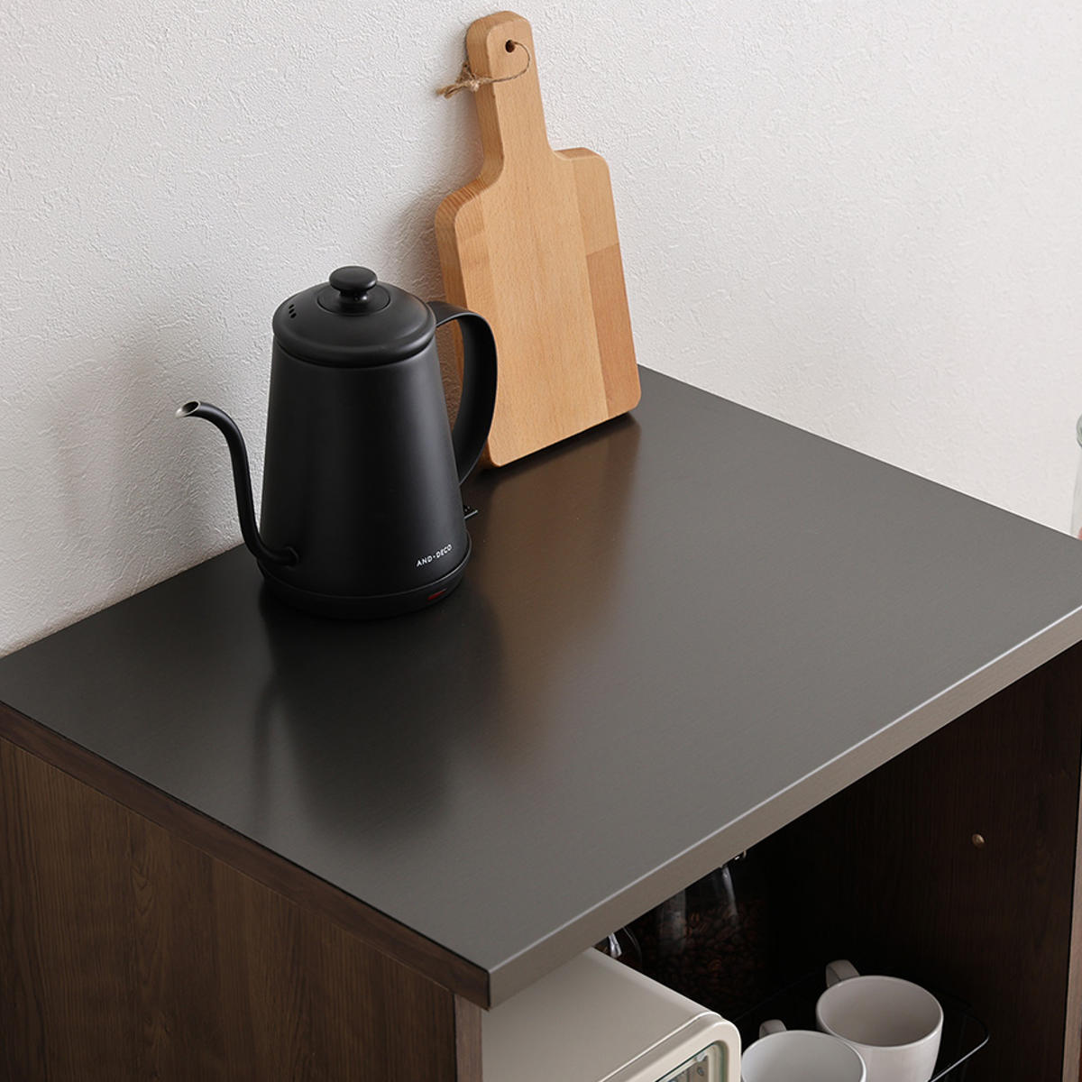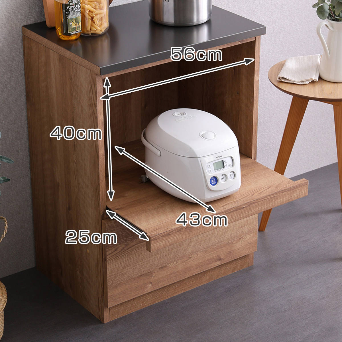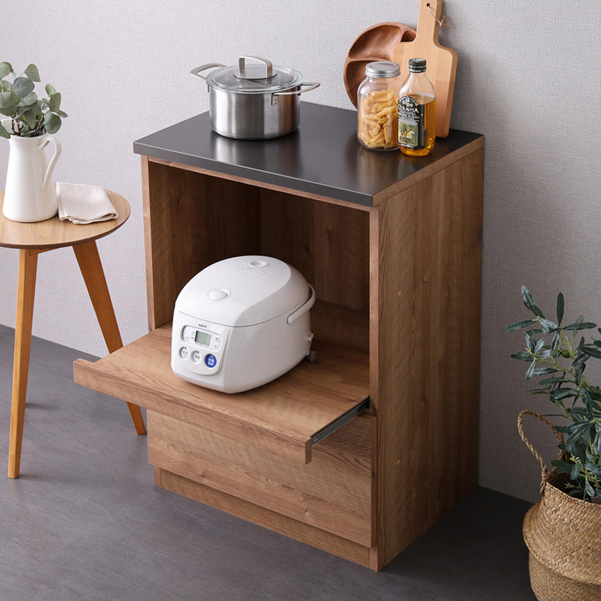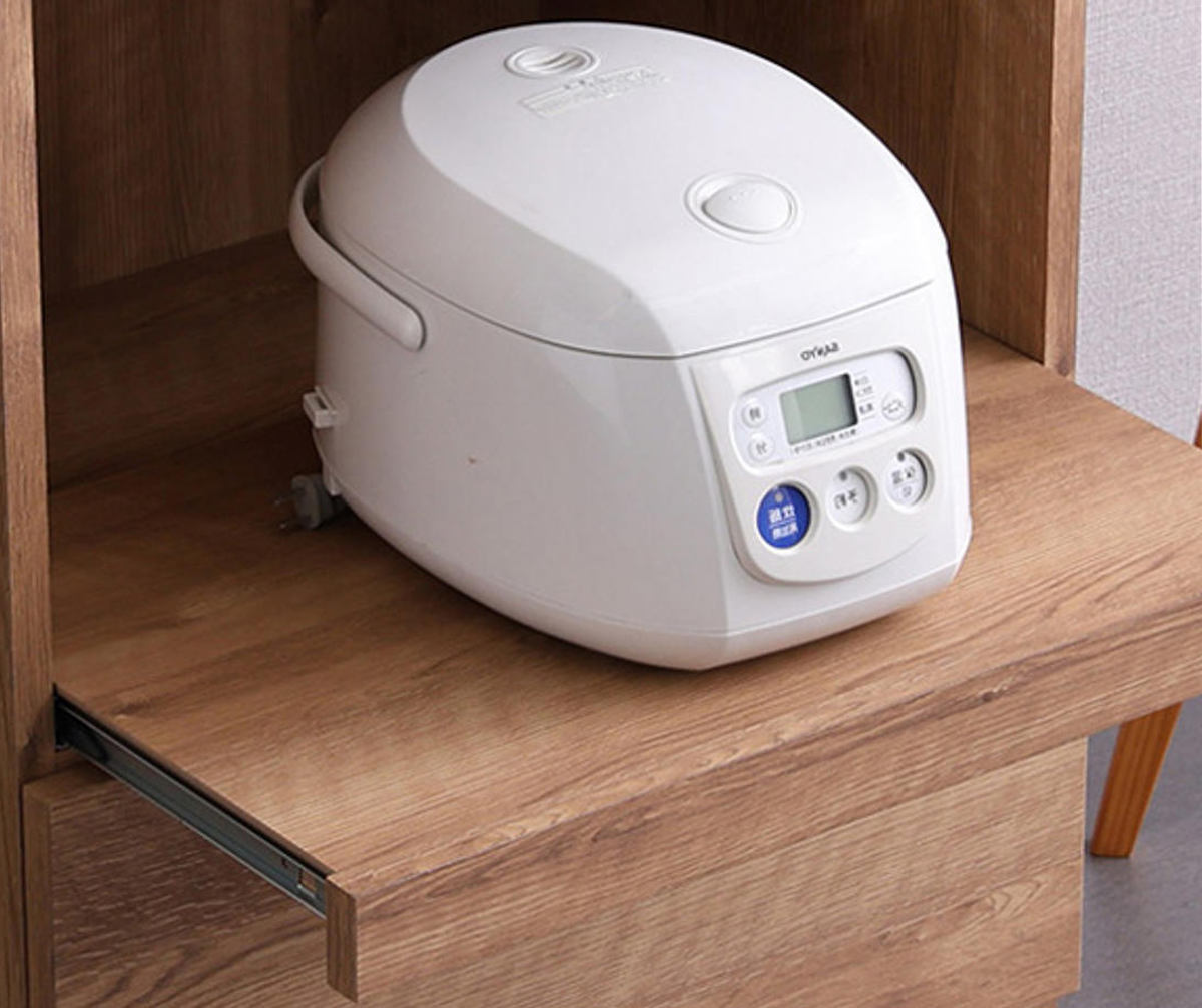 炊飯器や電気ケトルなどの家電を置くのに便利なスライド棚付きです。手前に引き出せるため、フタの開閉や操作がしやすく、蒸気がこもりにくいのもポイントです。使用しないときはすっきり収納でき、キッチンを広く使えます。