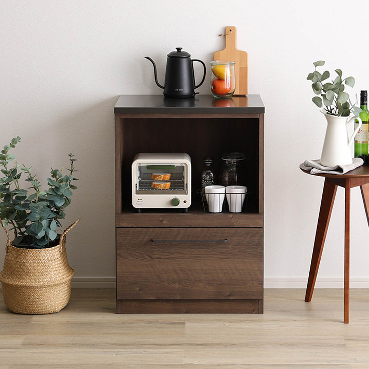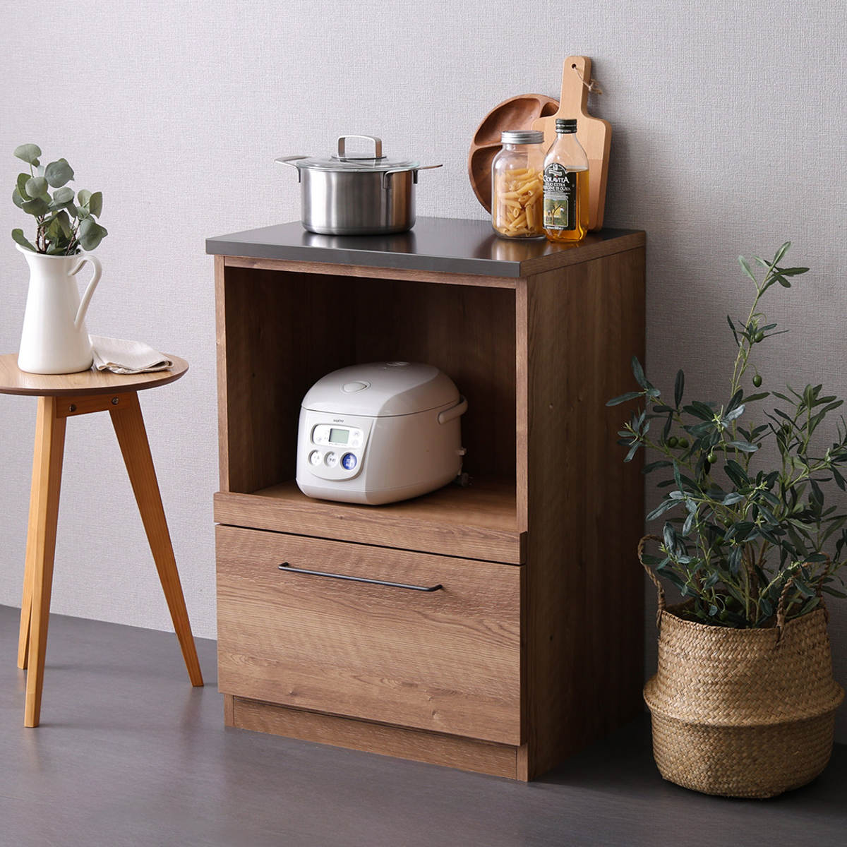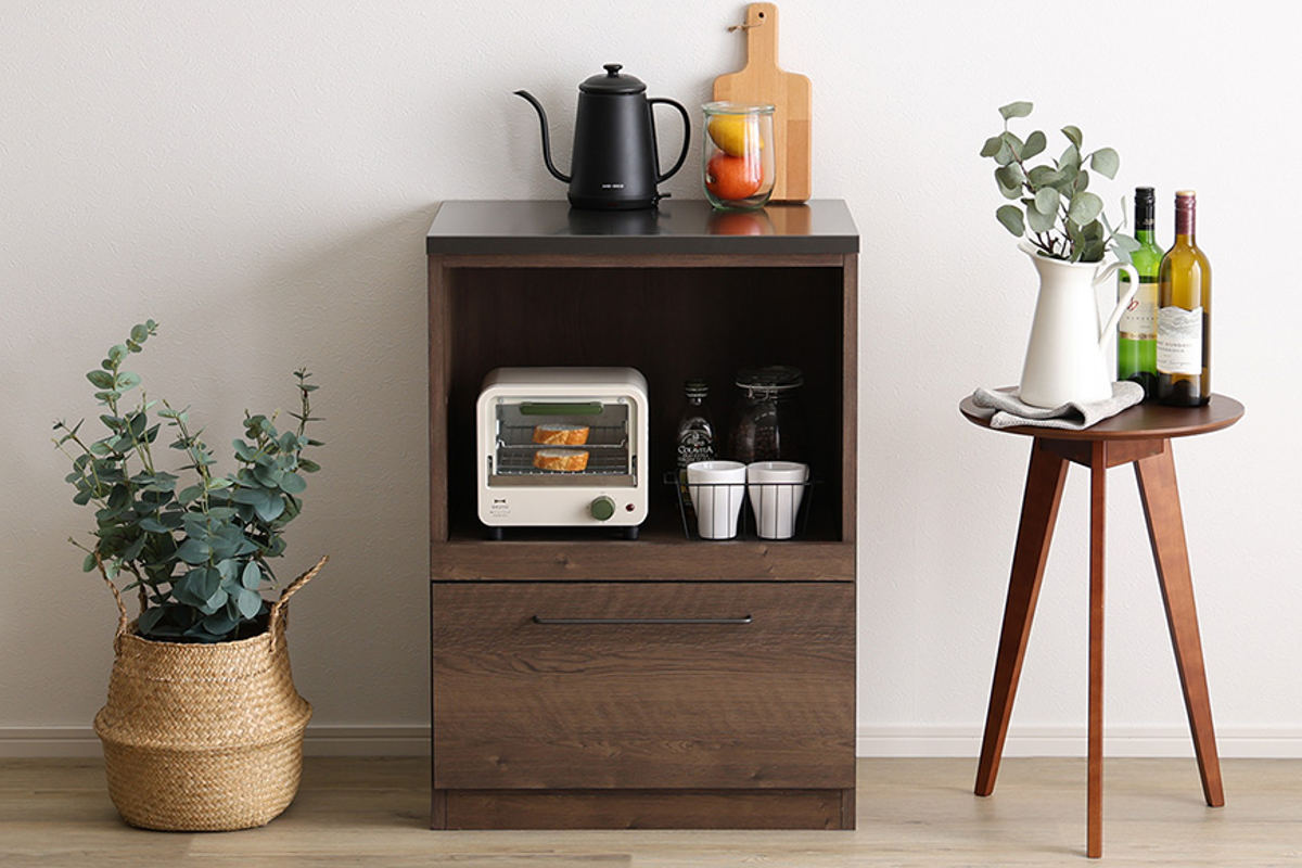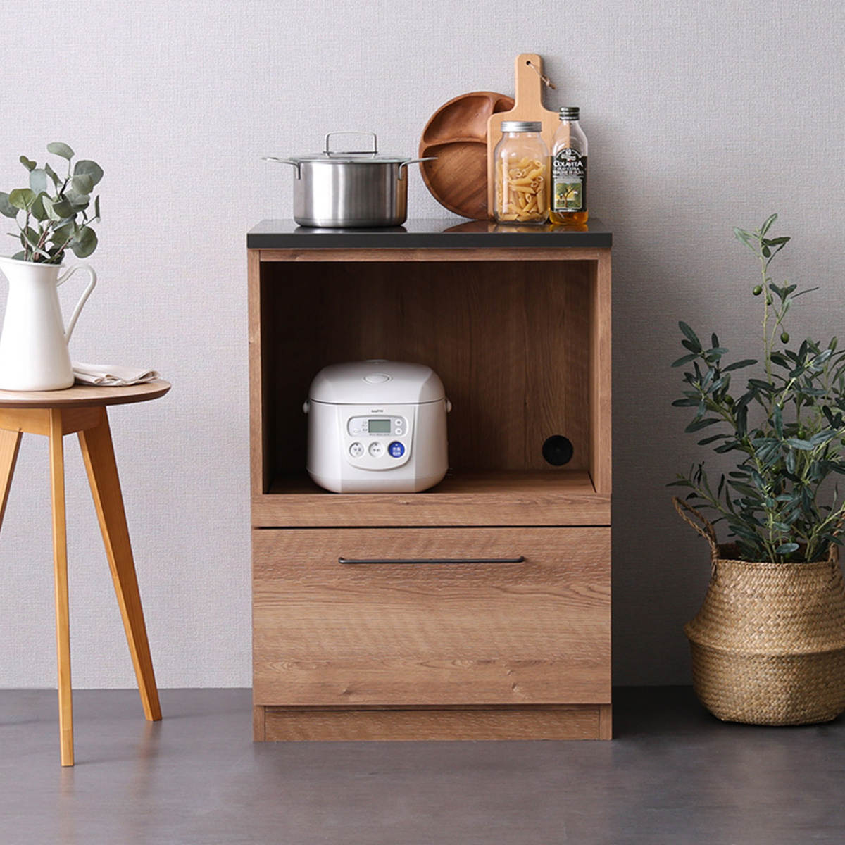 炊飯器やトースターなどの収納に便利なスライド棚付きのオープン収納棚です。木目調と特殊合板の組み合わせがスタイリッシュでシンプルなデザインで、ナチュラル・北欧・モダンなど、さまざまなインテリアに馴染みやすい一台です。