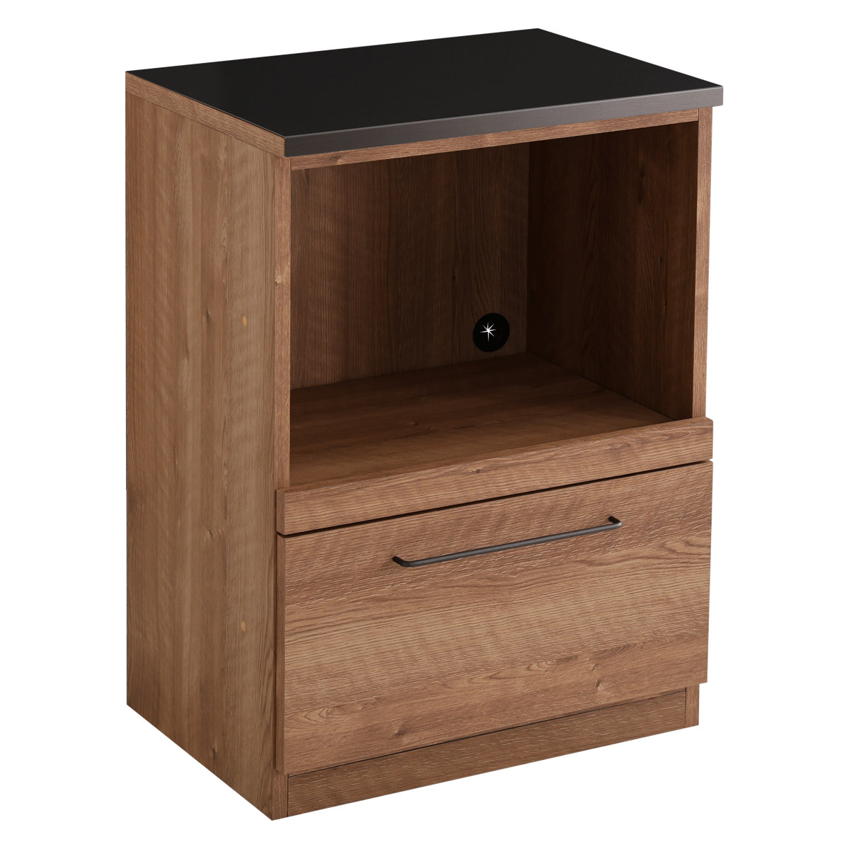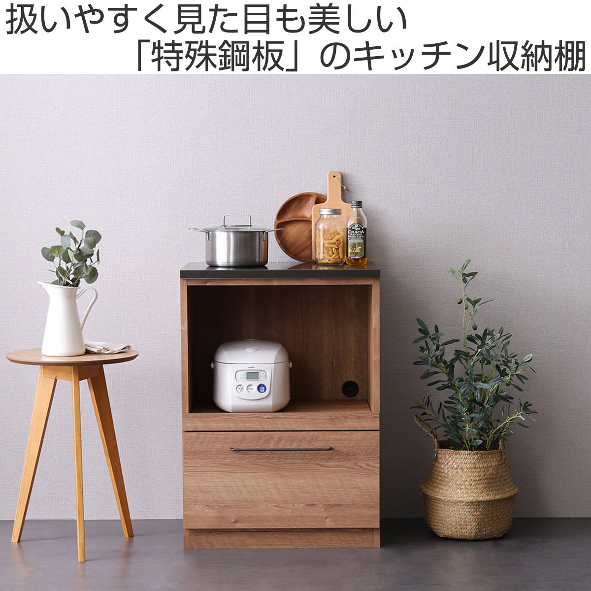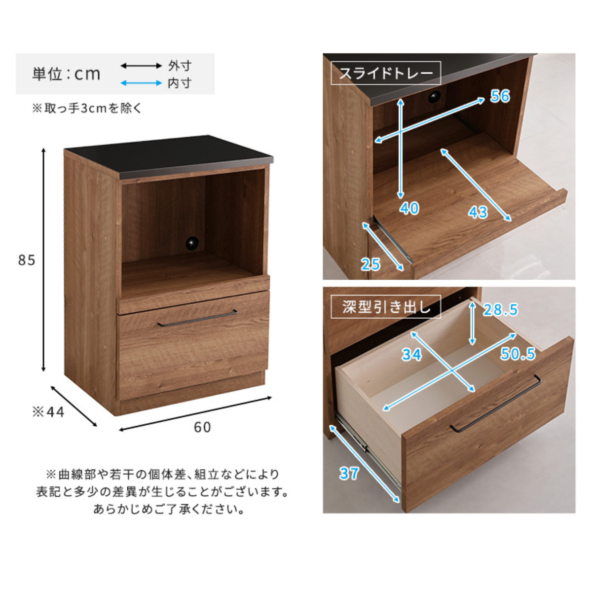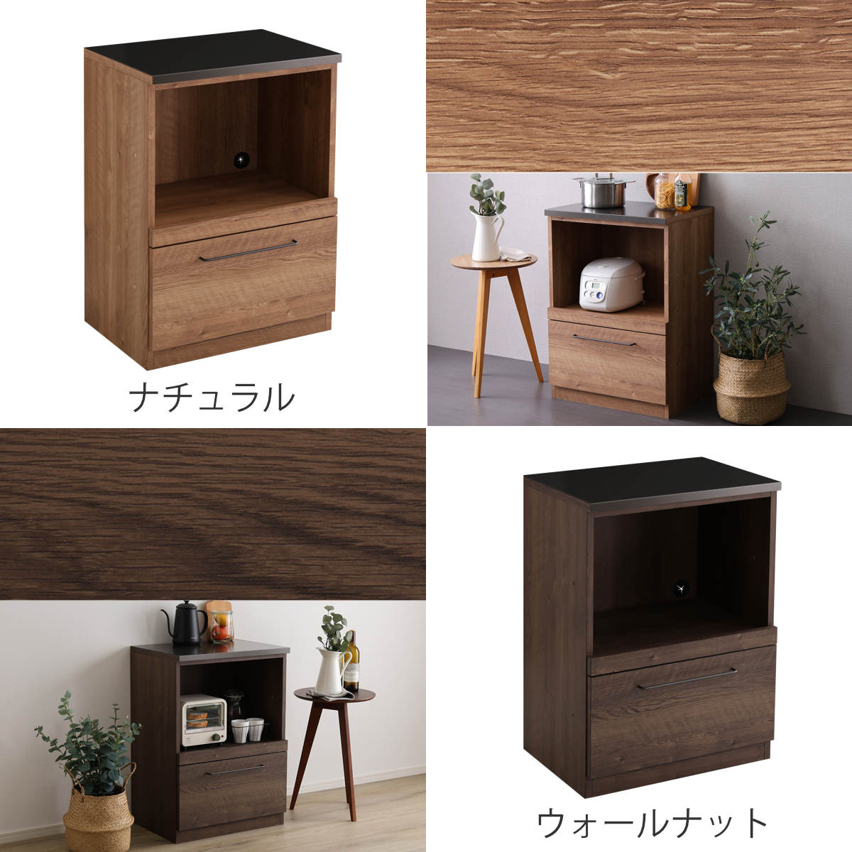炊飯器やトースターなどの収納に便利なスライド棚付きのオープン収納棚です。木目調と特殊合板の組み合わせがスタイリッシュでシンプルなデザインで、ナチュラル・北欧・モダンなど、さまざまなインテリアに馴染みやすい一台です。