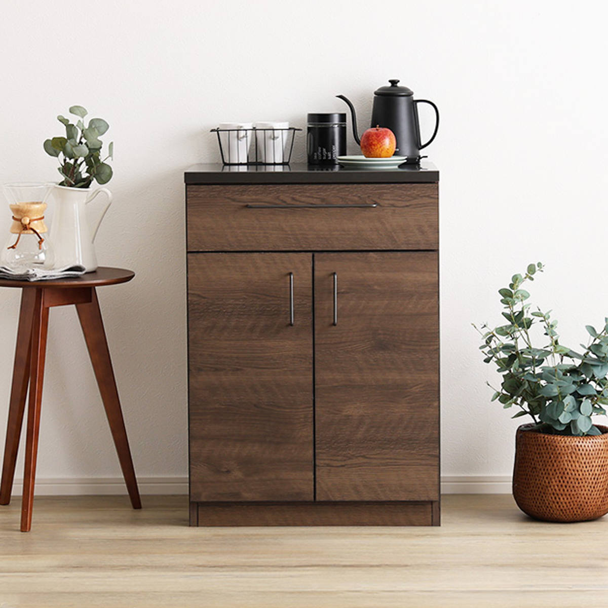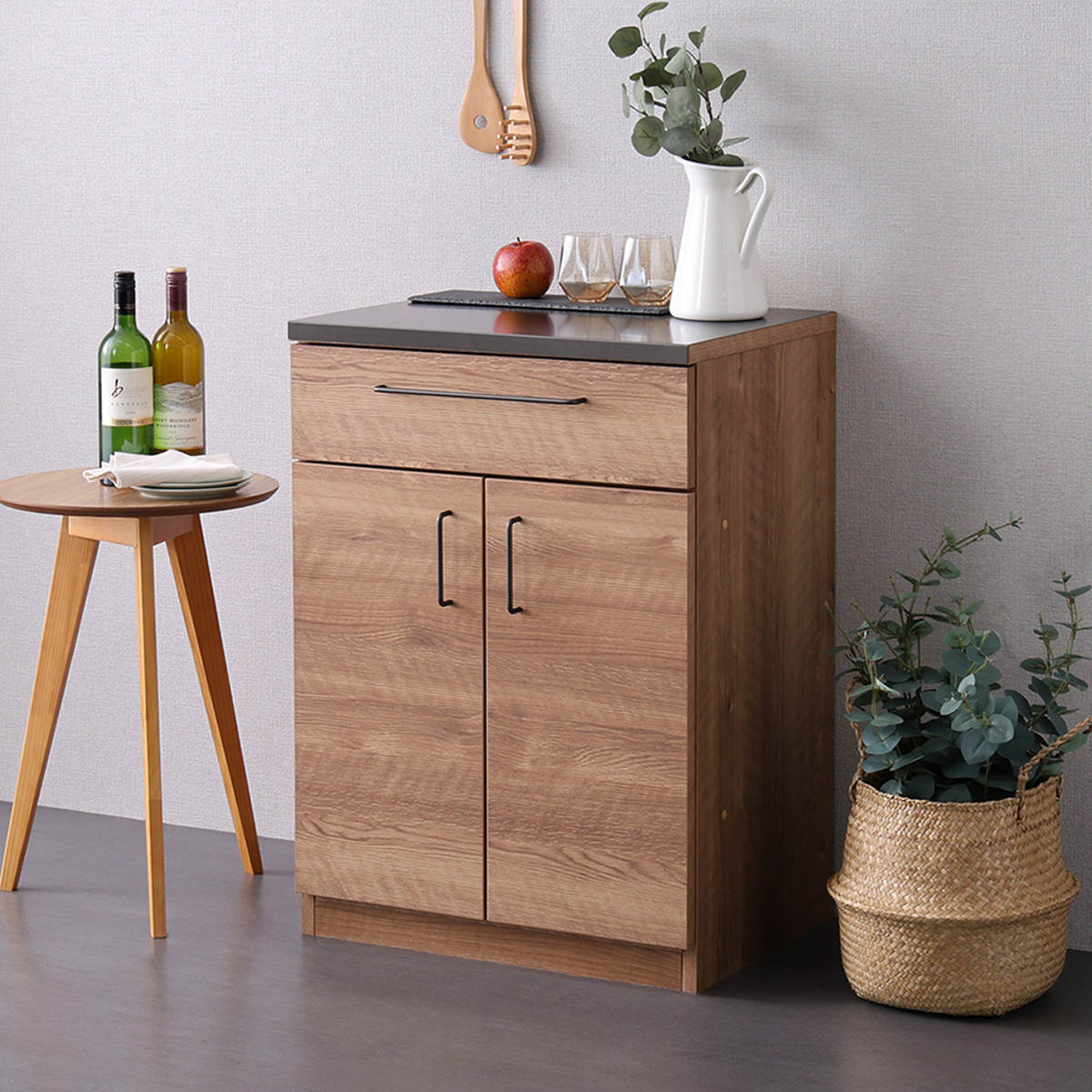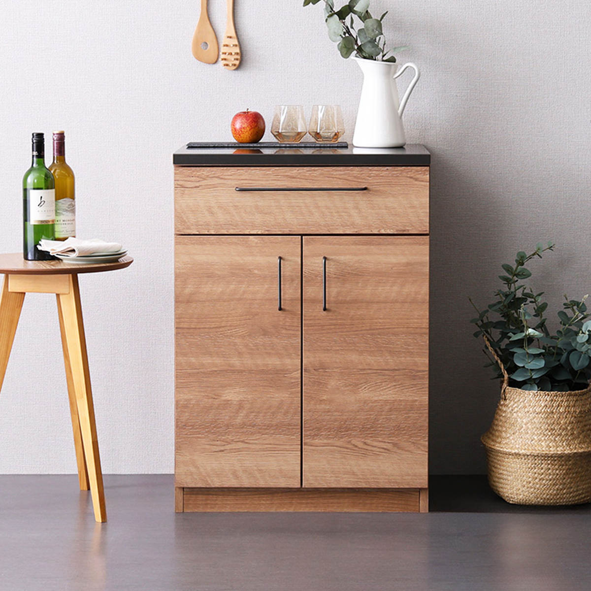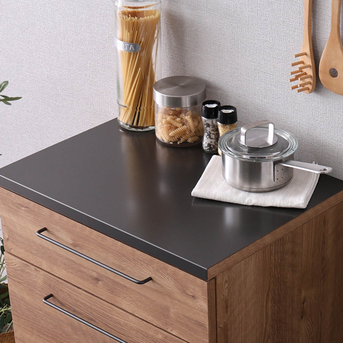 デッドスペースになりがちなキッチン周りをすっきり整えられる収納力のあるキッチン収納棚です。木目調と特殊合板の組み合わせがスタイリッシュでシンプルなデザインで、ナチュラル・北欧・モダンなど、さまざまなインテリアに馴染みやすい一台です。