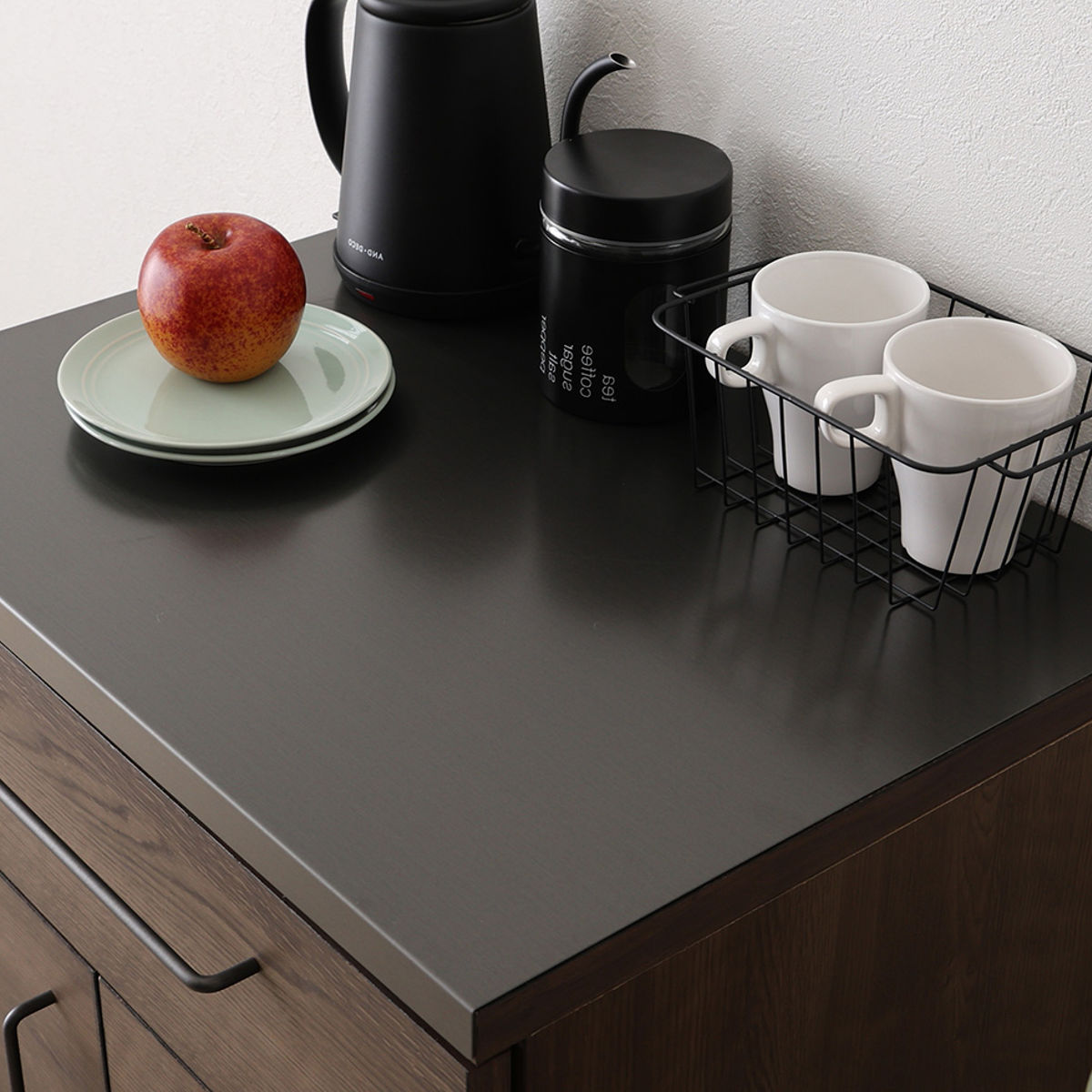 天板には、さまざまな加工が施された特殊鋼板を使用しています。耐熱性に配慮されているほか、指紋が付きにくく、薬品による傷を防ぎやすいのも特長です。金属ならではの美しい質感が、キッチン空間をすっきりと上質な印象に演出します。