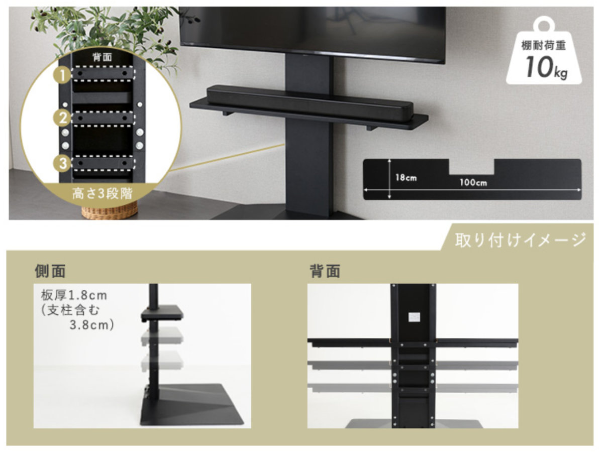 耐荷重は約10kgで安定感があり、幅100cmまでの長めのサウンドバーでもしっかり設置でき、安心してご使用いただけます。