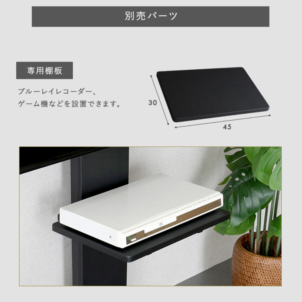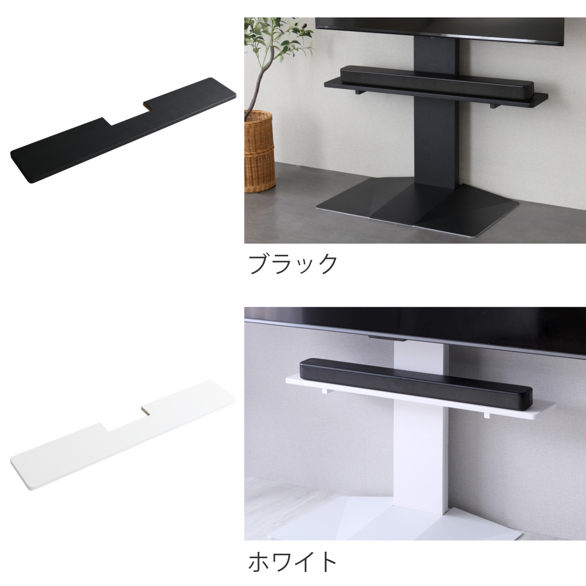 同シリーズの専用サウンドバー棚板と、専用棚板を組み合わせると、機器や小物をまとめて置けてさらに便利です。