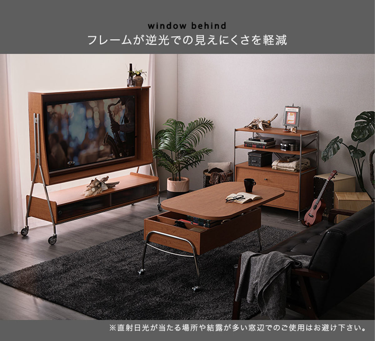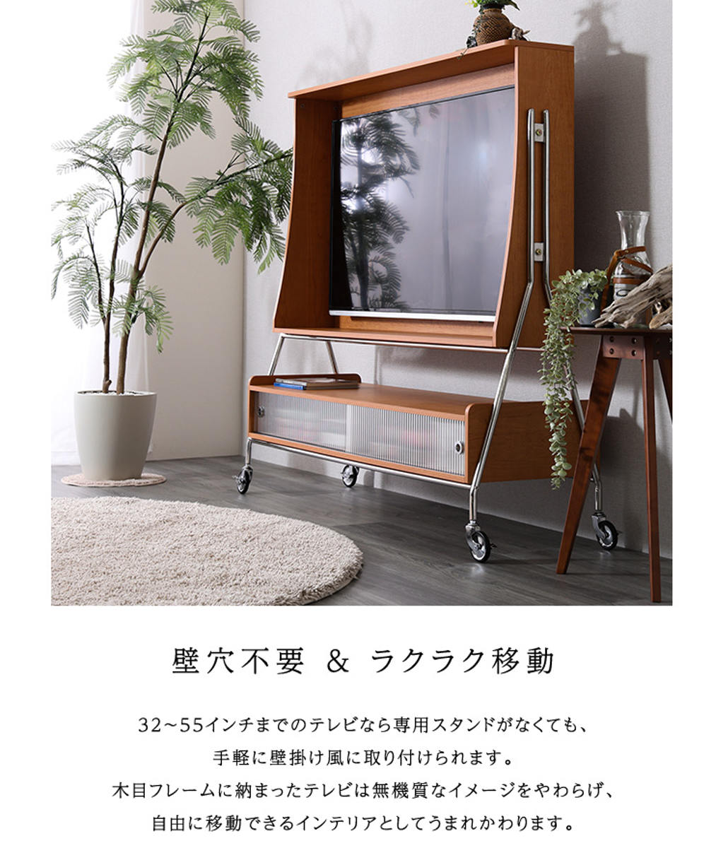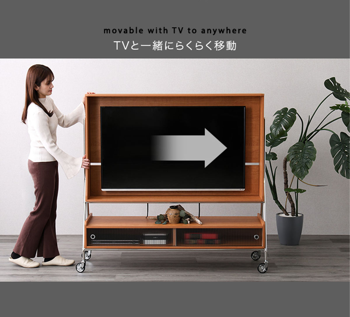 おしゃれに壁掛け風に取り付けられ、賃貸のご家庭でも手軽にお使いいただけます。また、キャスター付きなのでライフスタイルに合わせてテレビを好きな場所へ移動することも簡単です。