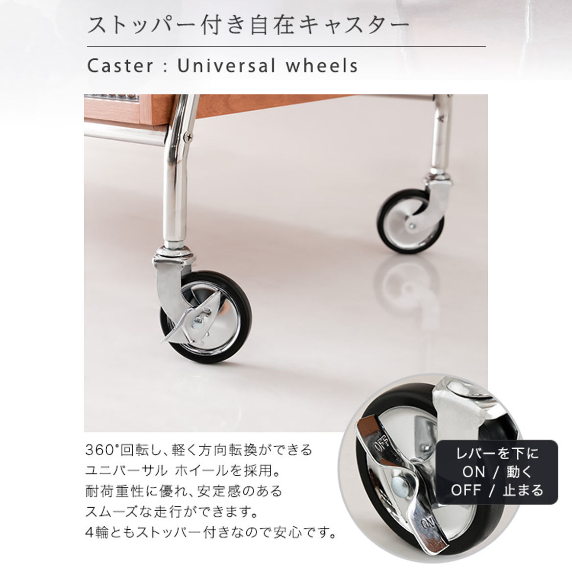 360度回転するユニバーサルホイールを採用している為、簡単に方向転換ができます。耐荷重性にも優れ、安心してお使いいただけます。