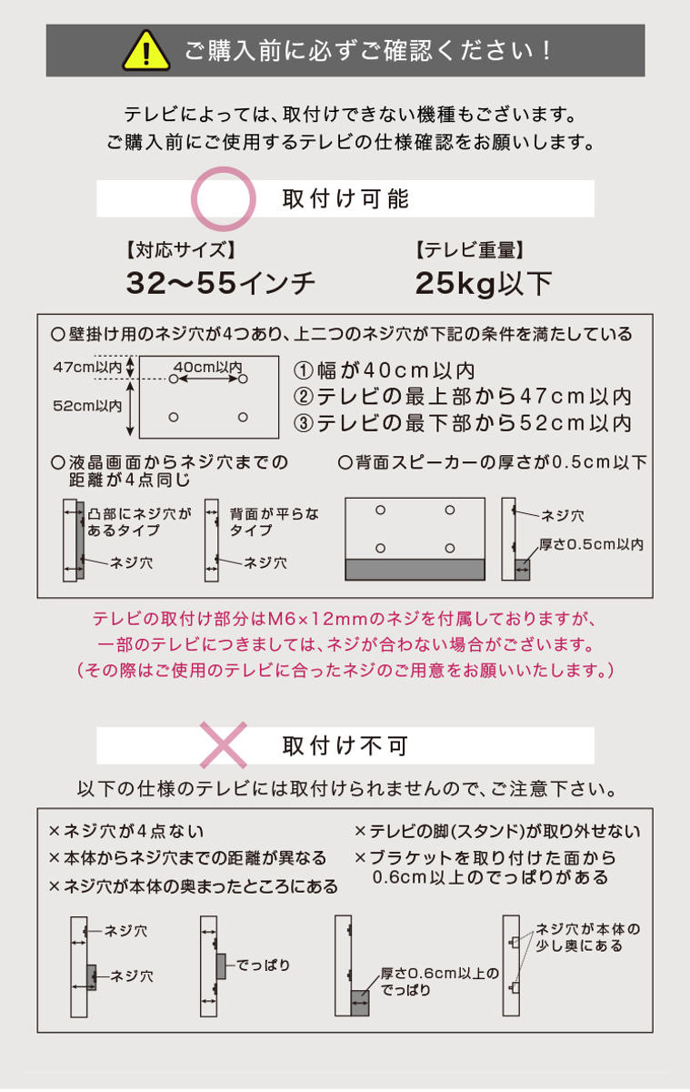 32インチのテレビから取り付けが可能で、最大55インチまで適合しています。取り外しの際には、フレームとテレビとの隙間にしっかりと手が入るよう、上下両サイドに5cmほど余裕を持たせた設計になっています。