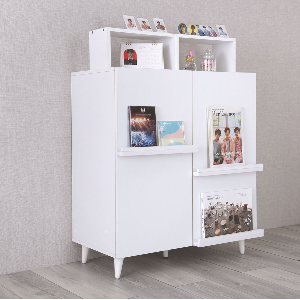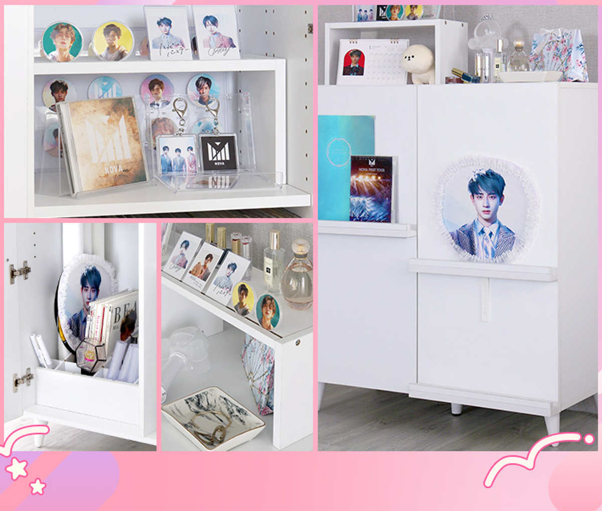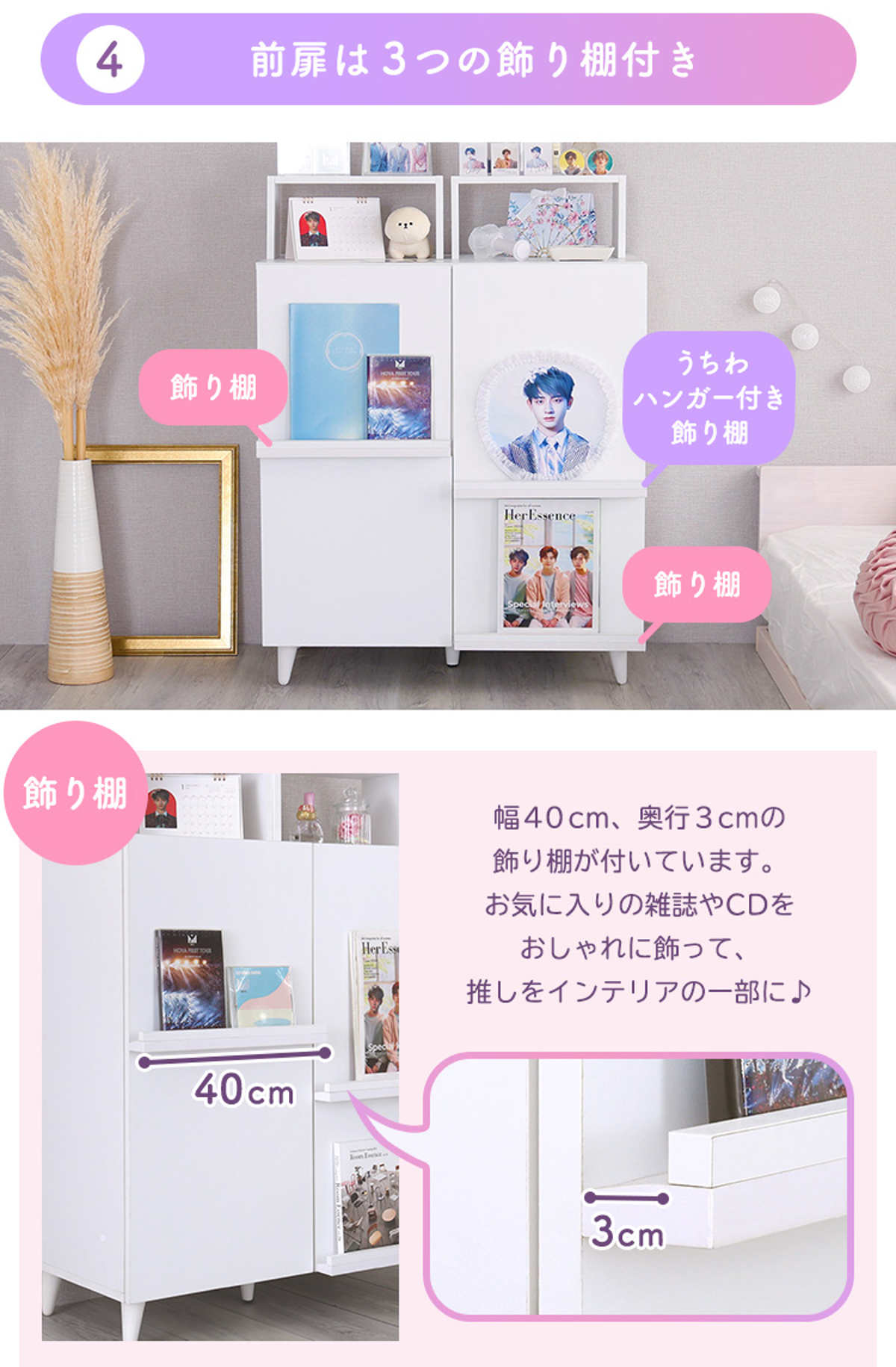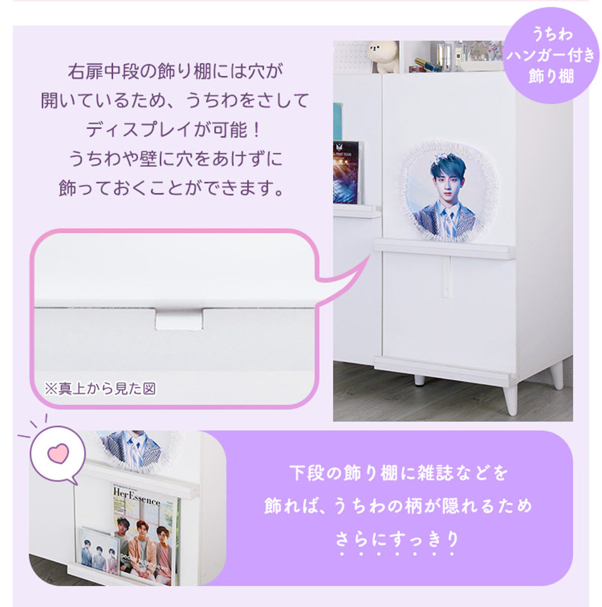 扉には3つの飾り棚が付いています。右側の上段はうちわが差し込める穴が付いており、一番お気に入りのうちわを飾ってもOK。飾り棚の奥行は3cm設けられているので、雑誌やCDなどを並べて、推しのいるインテリアがお楽しみいただきます。